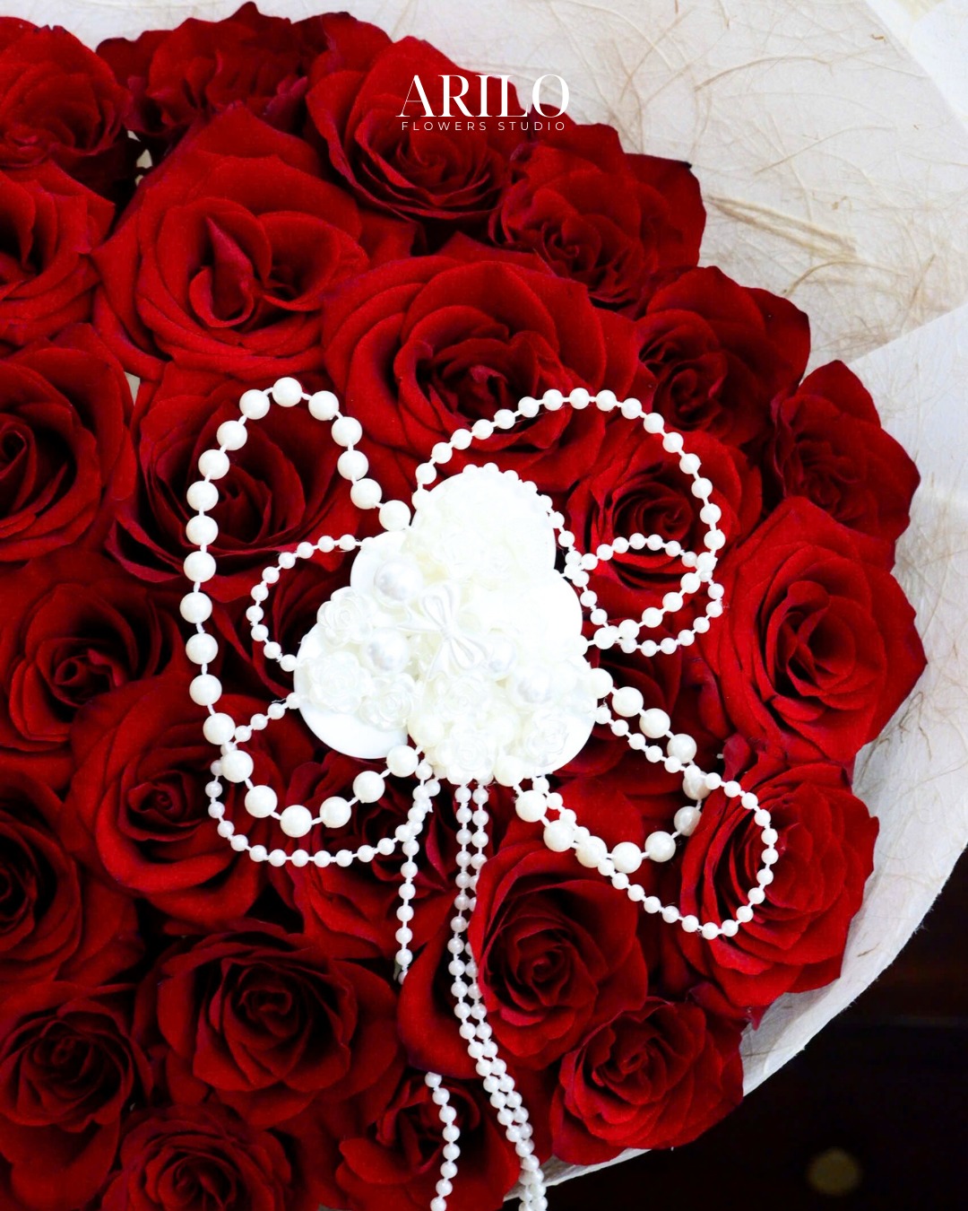 Điểm nhấn tinh tế nằm ở chi tiết nơ ngọc trai được đặt khéo léo trên mặt hoa. Chi tiết này không chỉ mang tính trang trí mà còn gợi lên hình ảnh của sự trân trọng, nâng niu – như cách người tặng muốn nói rằng: “Em là điều quý giá.” Đây cũng là lý do mẫu hoa này thường được khách hàng của Shop hoa tươi Sài Gòn – Arilo Flower Studio lựa chọn làm hoa tặng người yêu Valentine, khi muốn món quà vừa đẹp về hình thức, vừa sâu về cảm xúc.