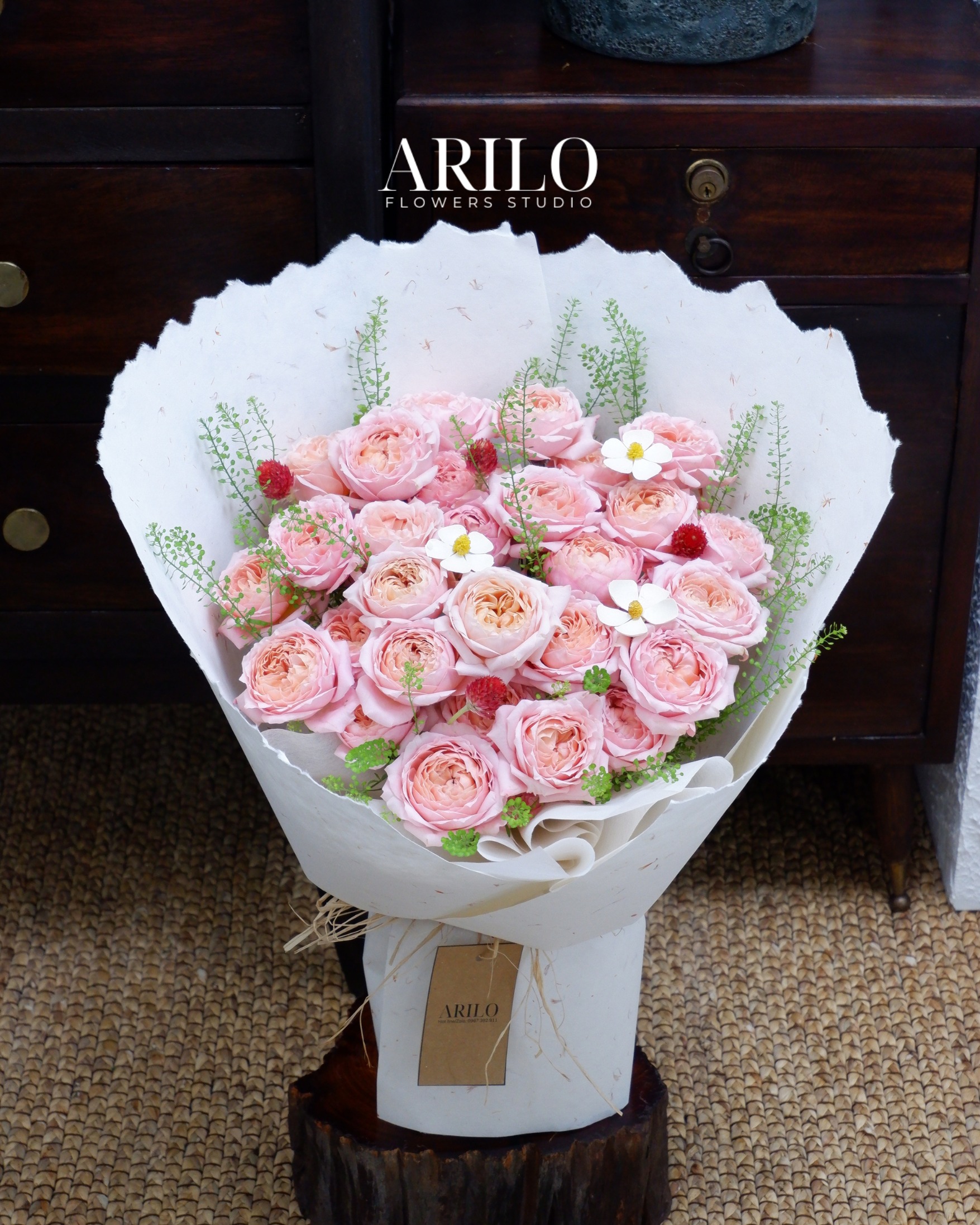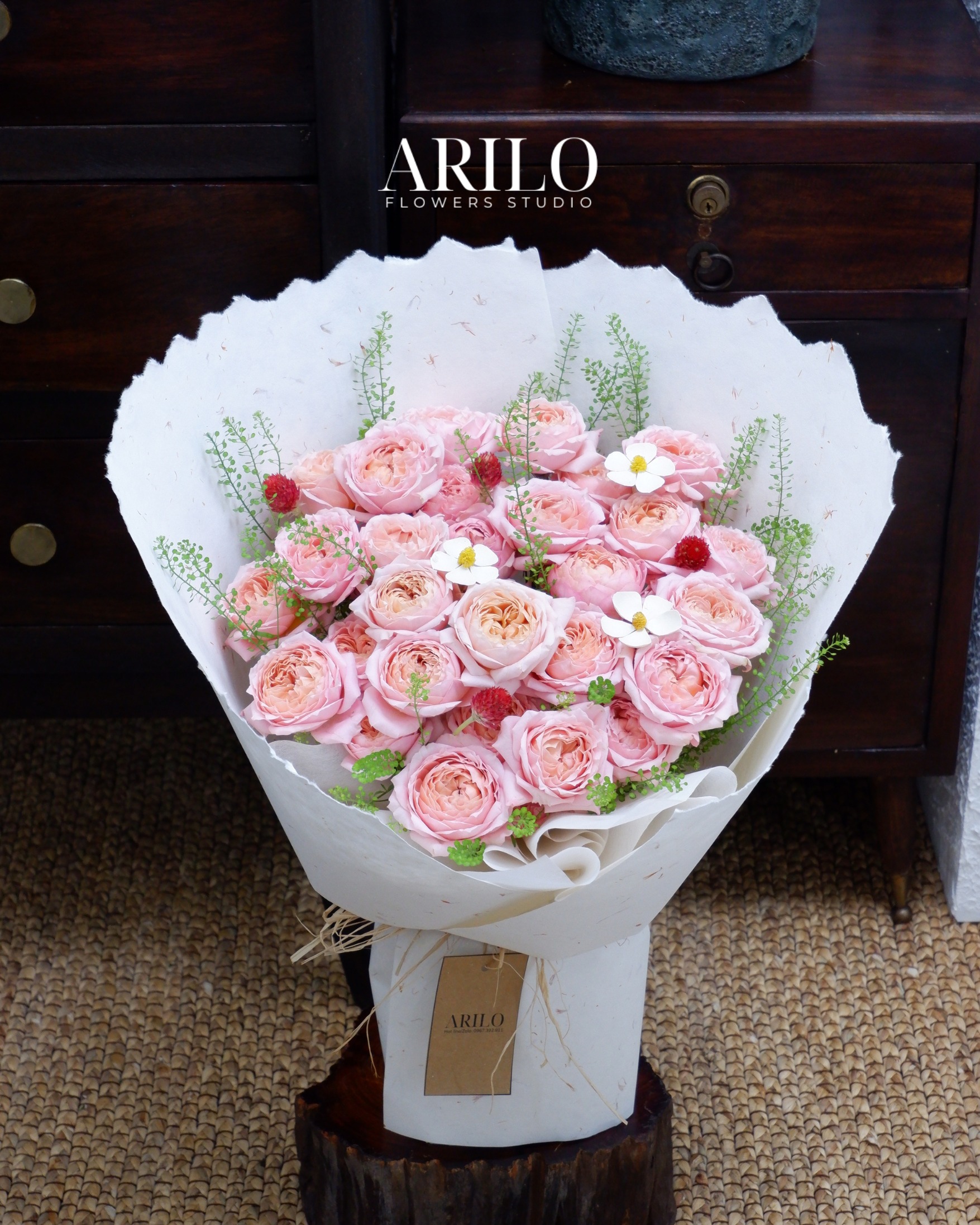 Bó hoa trong hình là sự kết hợp hài hòa giữa hoa hồng Julibee dịu dàng, cúc bách nhật điểm xuyết đáng yêu, hoa gỗ 5 cánh mộc mạc cùng cỏ đồng tiền xanh tươi, tạo nên tổng thể nhẹ nhàng nhưng đầy sức sống. Thiết kế được gói bằng giấy xe tay bồ công anh, mang phong cách tự nhiên, tinh tế và rất được yêu thích tại Shop hoa tươi Sài Gòn – Arilo Flower Studio.