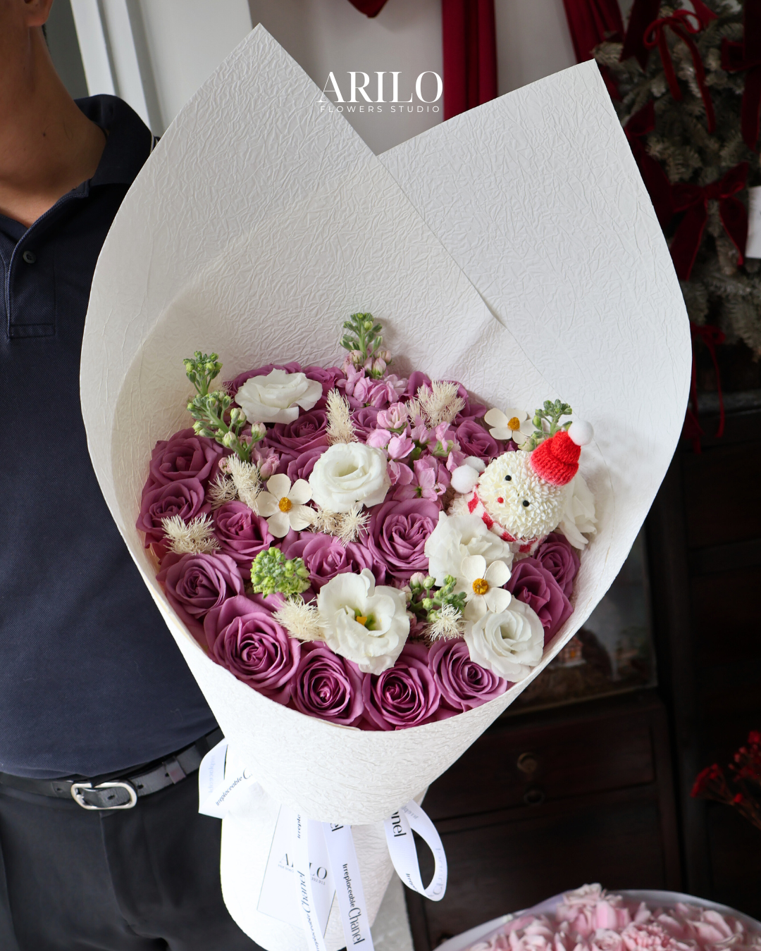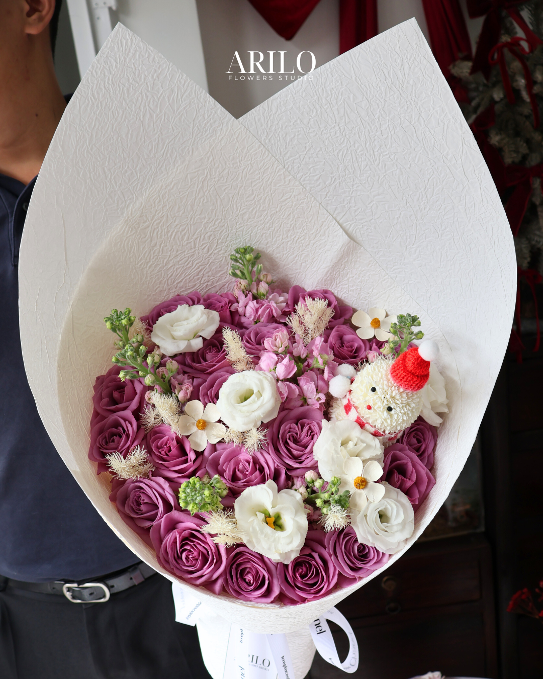Bó hoa gây ấn tượng với sự kết hợp hài hòa giữa hoa hồng tím hồng sang trọng và ông người tuyết được làm từ hoa pingpong trắng thanh khiết, tạo nên tổng thể vừa nổi bật vừa tinh tế. Sắc tím hồng tượng trưng cho sự lãng mạn sâu lắng, cảm xúc trưởng thành và tình yêu được nâng niu, trong khi sắc trắng mang đến cảm giác thuần khiết và cân bằng. Các chi tiết hoa điểm nhỏ cùng lớp giấy gói trắng cao cấp giúp tôn lên vẻ đẹp trang nhã, hiện đại.