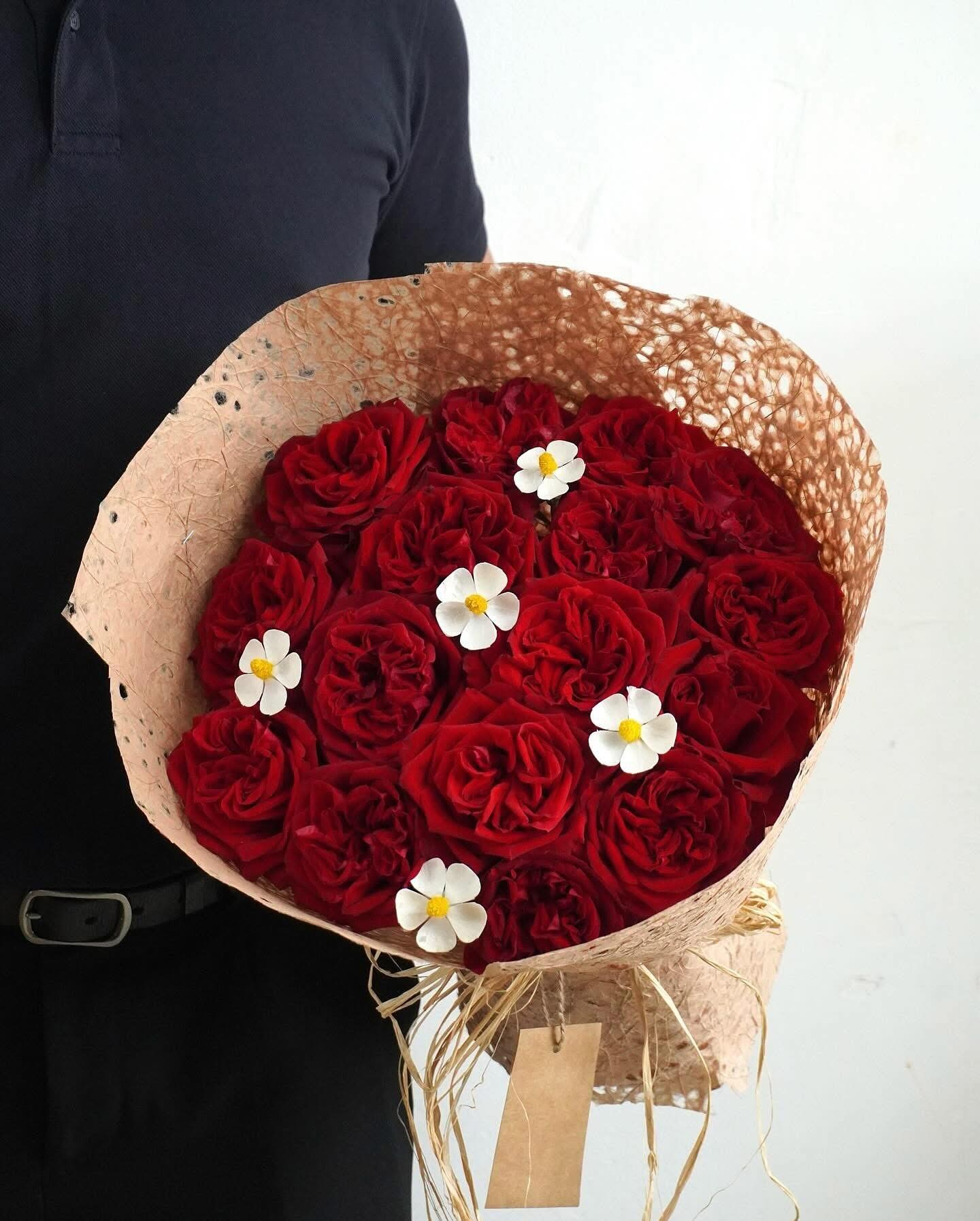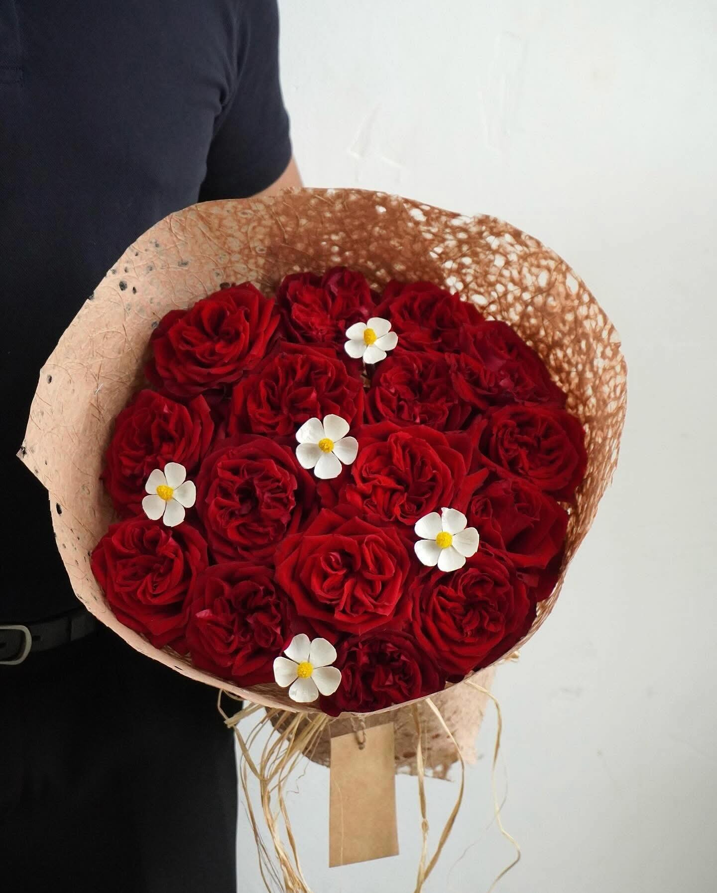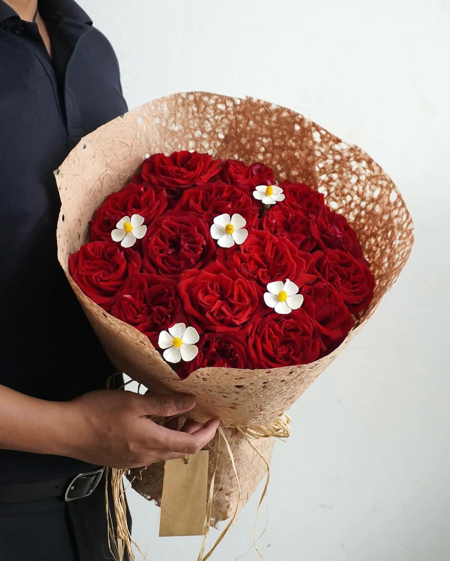 Điểm xuyết giữa nền đỏ rực là những cánh hoa sao trắng nhỏ xinh, mang ý nghĩa thuần khiết và cân bằng, giúp bó hoa không quá nặng nề mà vẫn giữ được nét tinh tế. Phần giấy gói thủ công tone nâu tự nhiên tạo cảm giác mộc mạc, sang trọng, tôn lên vẻ đẹp nguyên bản của hoa.