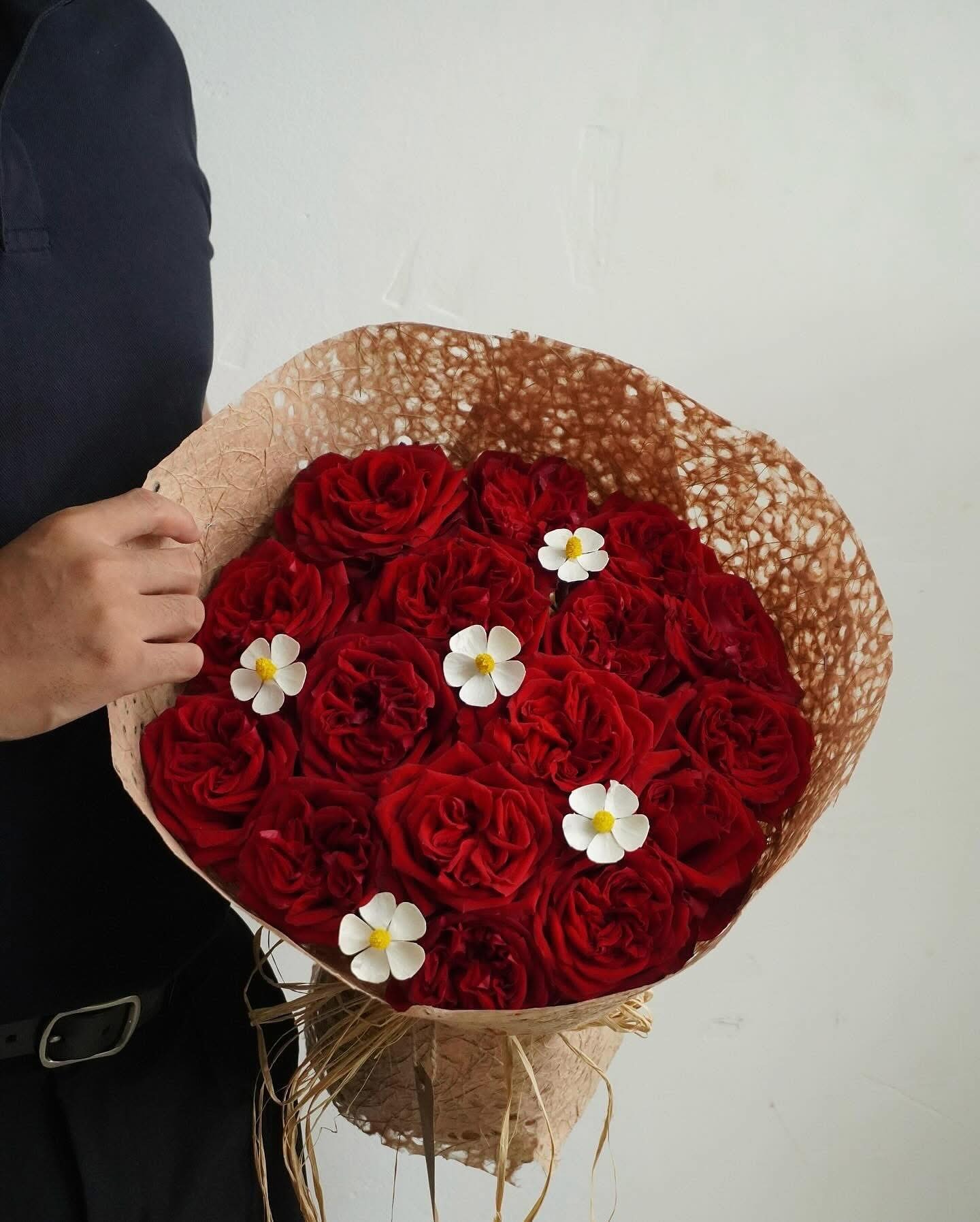 Bó hoa trong hình là sự kết hợp đầy cảm xúc giữa hoa hồng ohara đỏ và những điểm nhấn tinh tế từ hoa cúc gỗ trắng 5 cánh trang trí, tạo nên một tổng thể vừa nồng nàn vừa thanh lịch. Những bông hồng đỏ được chọn lọc kỹ lưỡng, form hoa tròn đều, cánh dày và nhung mịn, xếp chặt tay như ôm trọn cảm xúc yêu thương. Sắc đỏ sâu thẳm đại diện cho tình yêu mãnh liệt, sự chân thành và lời hứa gắn bó lâu dài.