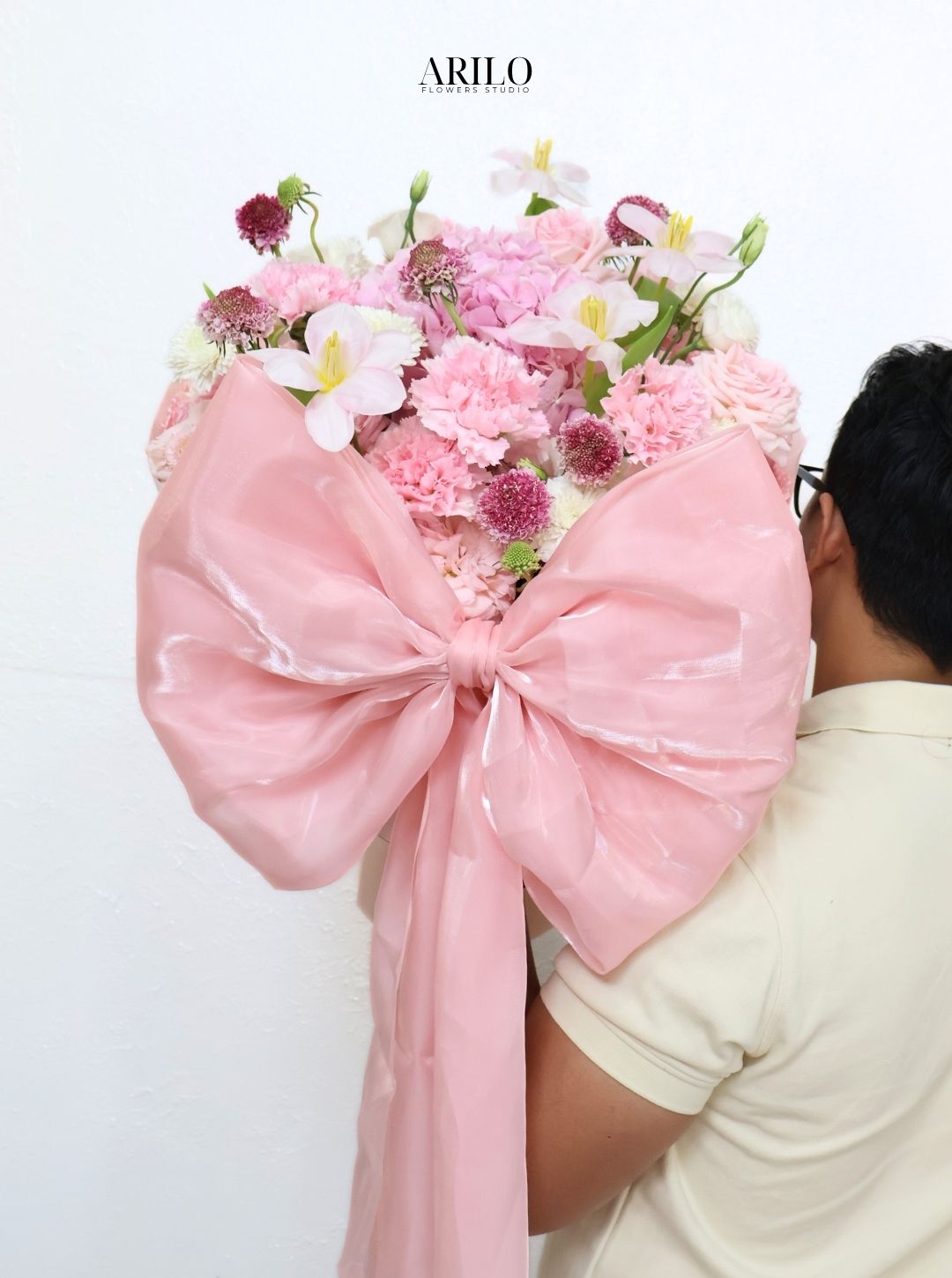 Phần giấy gói màu hồng pastel được lựa chọn kỹ lưỡng để tôn lên màu sắc của hoa. Chiếc nơ lớn phía trước không chỉ là điểm nhấn mà còn mang ý nghĩa như một món quà được trao bằng cả tấm lòng. Từng chi tiết nhỏ đều được chăm chút để tạo nên một tổng thể hài hòa, không quá cầu kỳ nhưng vẫn đủ để gây ấn tượng mạnh.