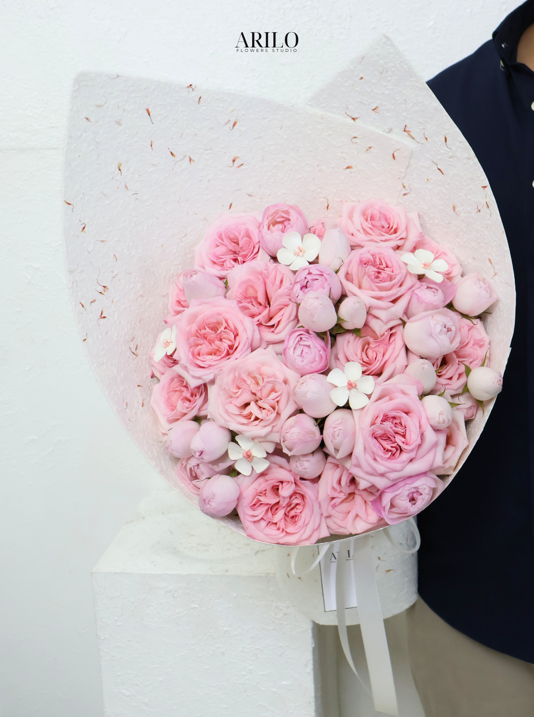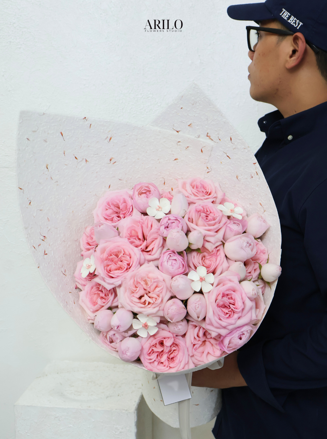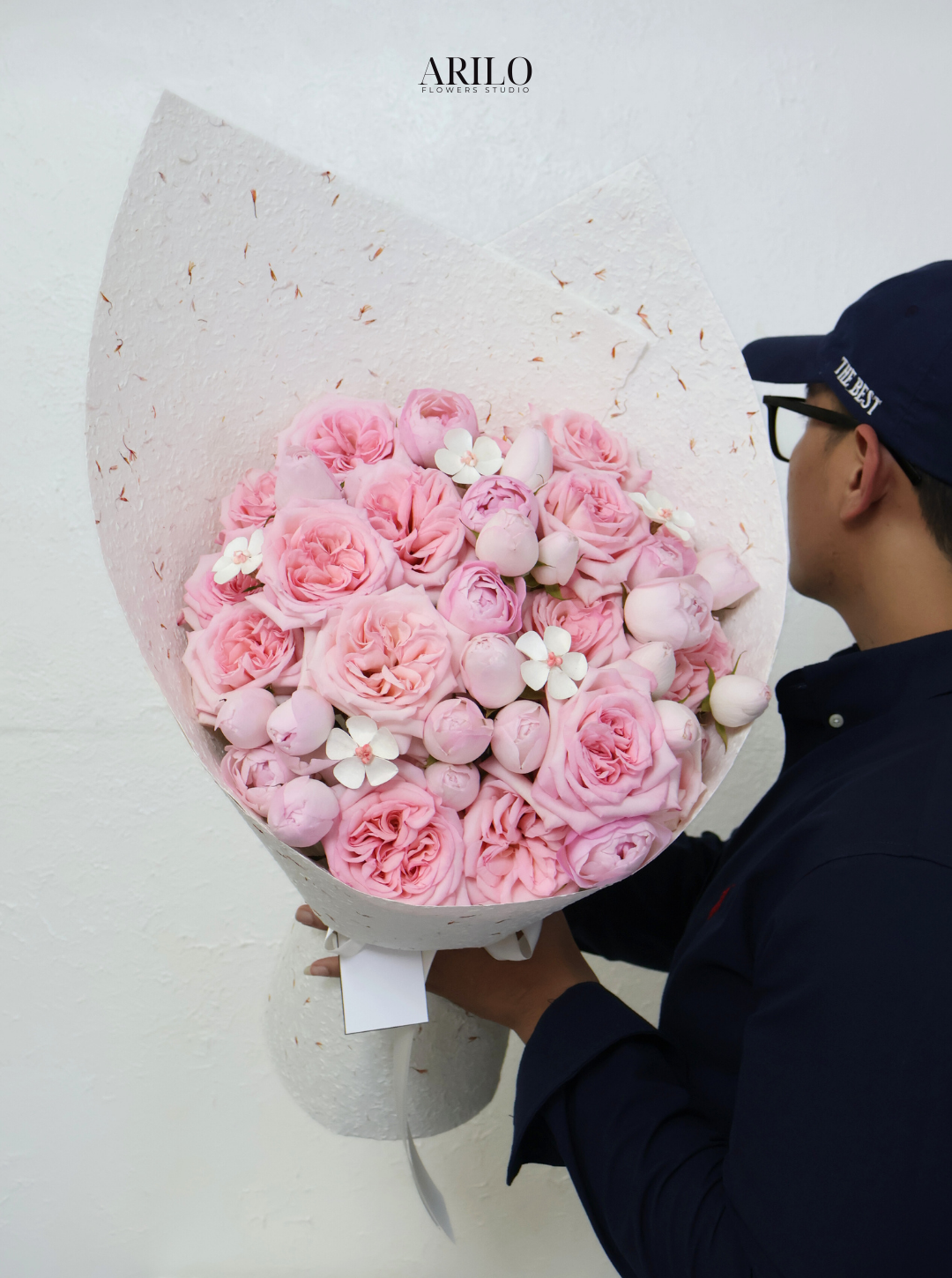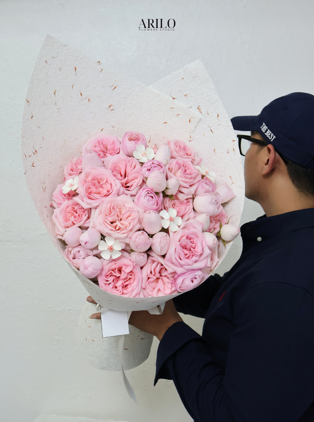 Bức ảnh ghi lại khoảnh khắc một bó hoa hồng phấn được nâng niu trong không gian tối giản, nơi mọi ánh nhìn đều dừng lại ở sắc hoa mềm mại và tinh tế. Bó hoa được thiết kế form tròn đầy, gói bằng giấy xé tay thủ công tone trắng ngà, điểm nhẹ những sợi cánh khô tự nhiên, tạo cảm giác mộc mạc nhưng vẫn rất sang.
