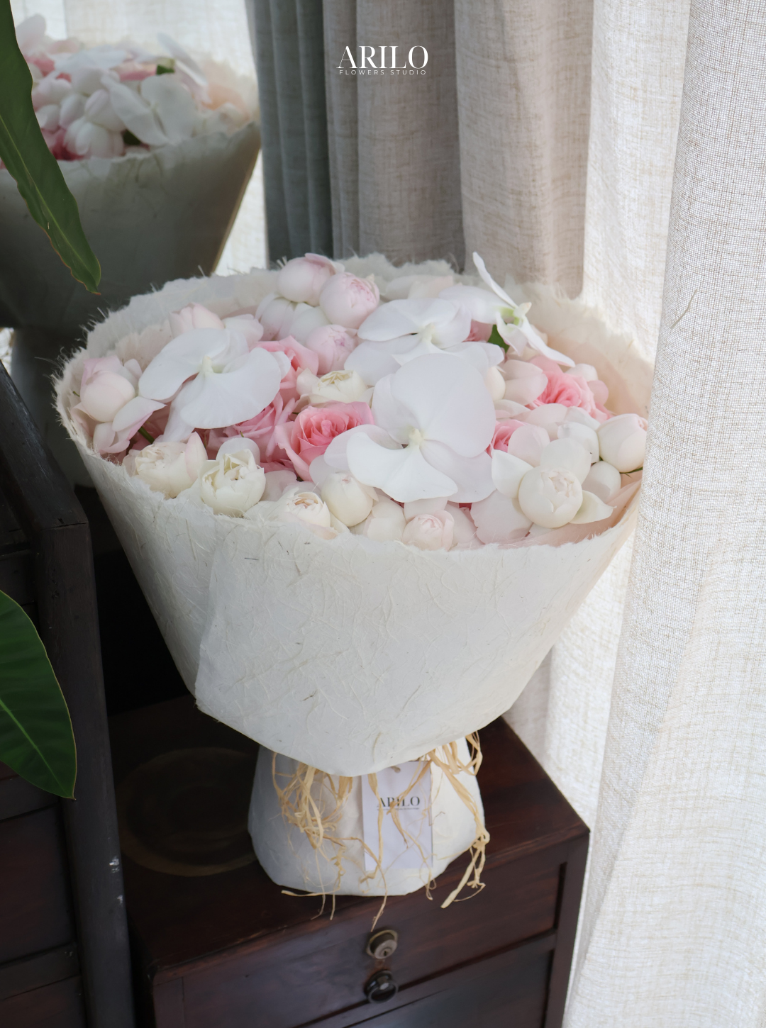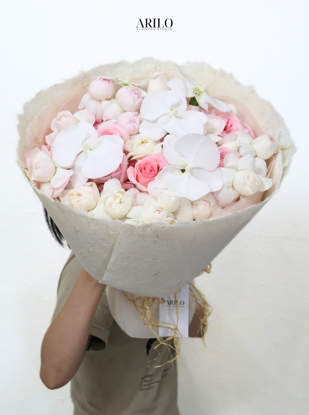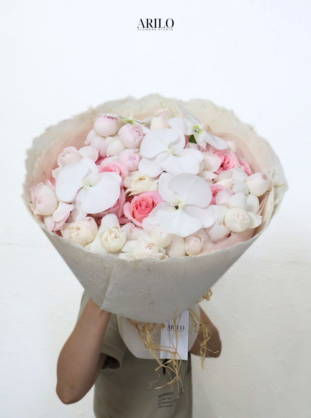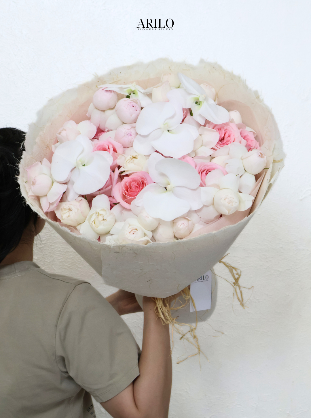 Bó hoa là sự kết hợp hài hòa giữa ba loài hoa mang vẻ đẹp đặc trưng: hồng Ohara, hồng plume và lan hồ điệp trắng. Tổng thể mang đến cảm giác mềm mại, nhẹ nhàng và rất dễ tạo thiện cảm. Tông màu trắng và hồng pastel giúp bó hoa trở nên tinh tế, phù hợp với nhiều dịp khác nhau trong tình yêu. Cách sắp xếp hoa theo dạng tròn đầy, các lớp hoa đan xen nhau tạo nên chiều sâu và độ tự nhiên cho tổng thể.