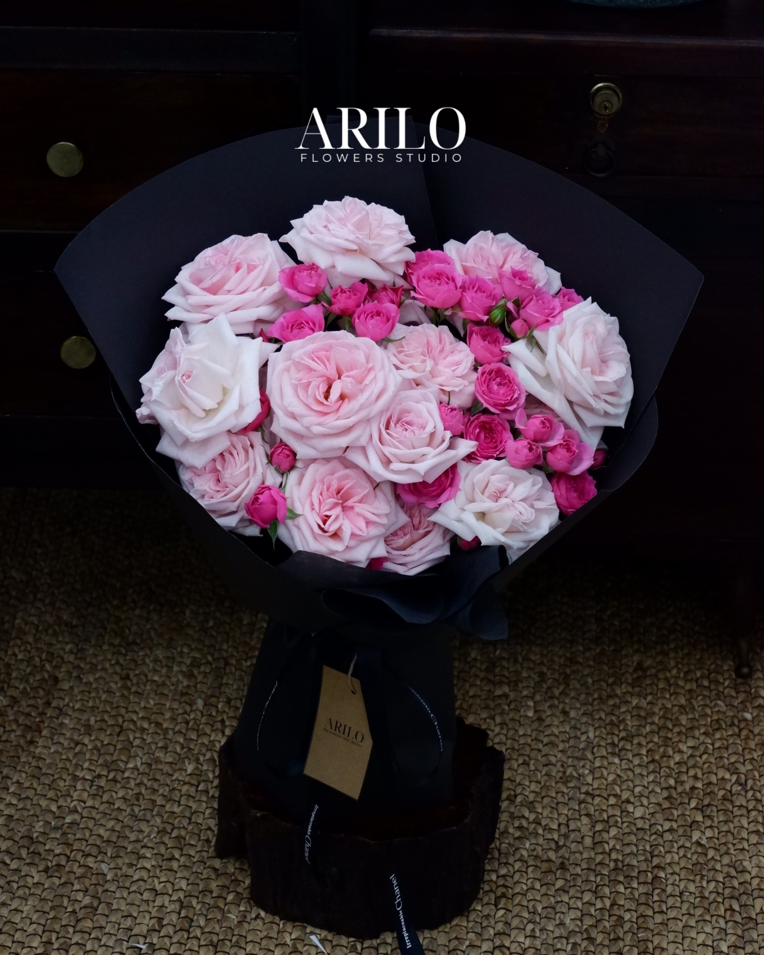 Các loài hoa được sử dụng gồm: hoa hồng Ohara và hồng chùm sofia. Mỗi bông hoa được chọn lọc kỹ lưỡng, cánh dày, form tròn đều, mang vẻ đẹp đầy đặn và lâu tàn. Cách bó tròn cổ điển, kết hợp giấy gói đen mờ cao cấp giúp sắc hoa nổi bật rõ ràng, tạo cảm giác sang trọng và chỉn chu ngay từ ánh nhìn đầu tiên.