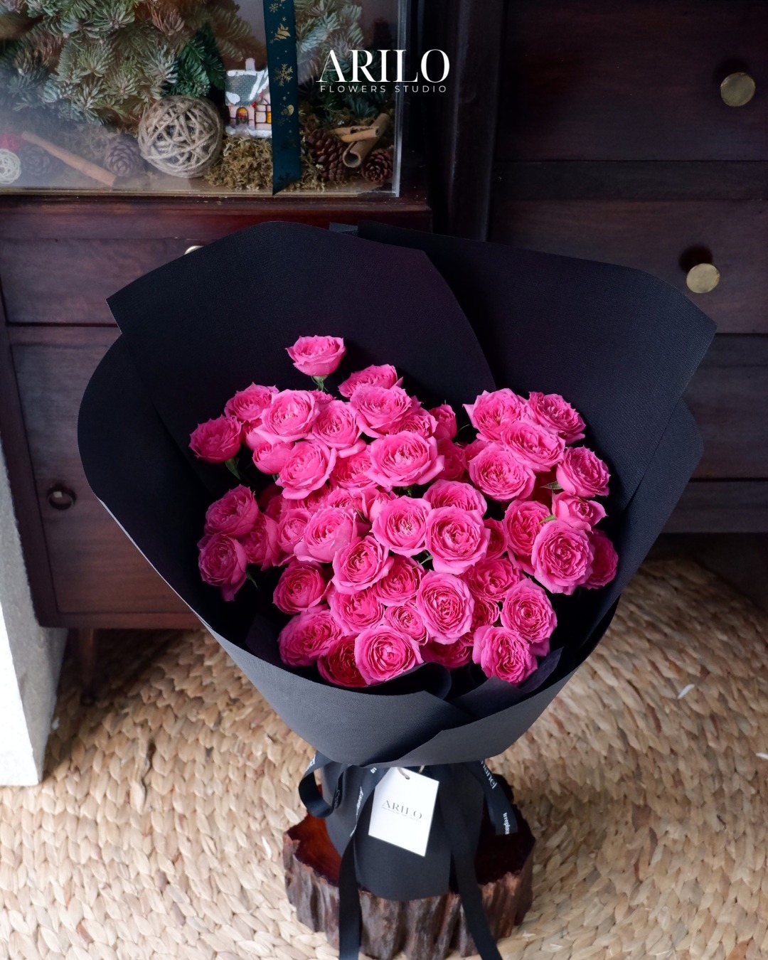 Lớp giấy gói đen cao cấp ôm trọn bó hoa, tạo độ tương phản mạnh mẽ, khiến sắc hồng Sofia càng thêm cuốn hút. Tổng thể bó hoa mang phong thái hiện đại, phù hợp làm bó hoa tỏ tình cho khoảnh khắc quan trọng, bó hoa sinh nhật dành tặng người yêu hoặc người phụ nữ đặc biệt, và cũng rất lý tưởng để chọn làm bó hoa cầu hôn theo phong cách tinh giản nhưng đầy cảm xúc.