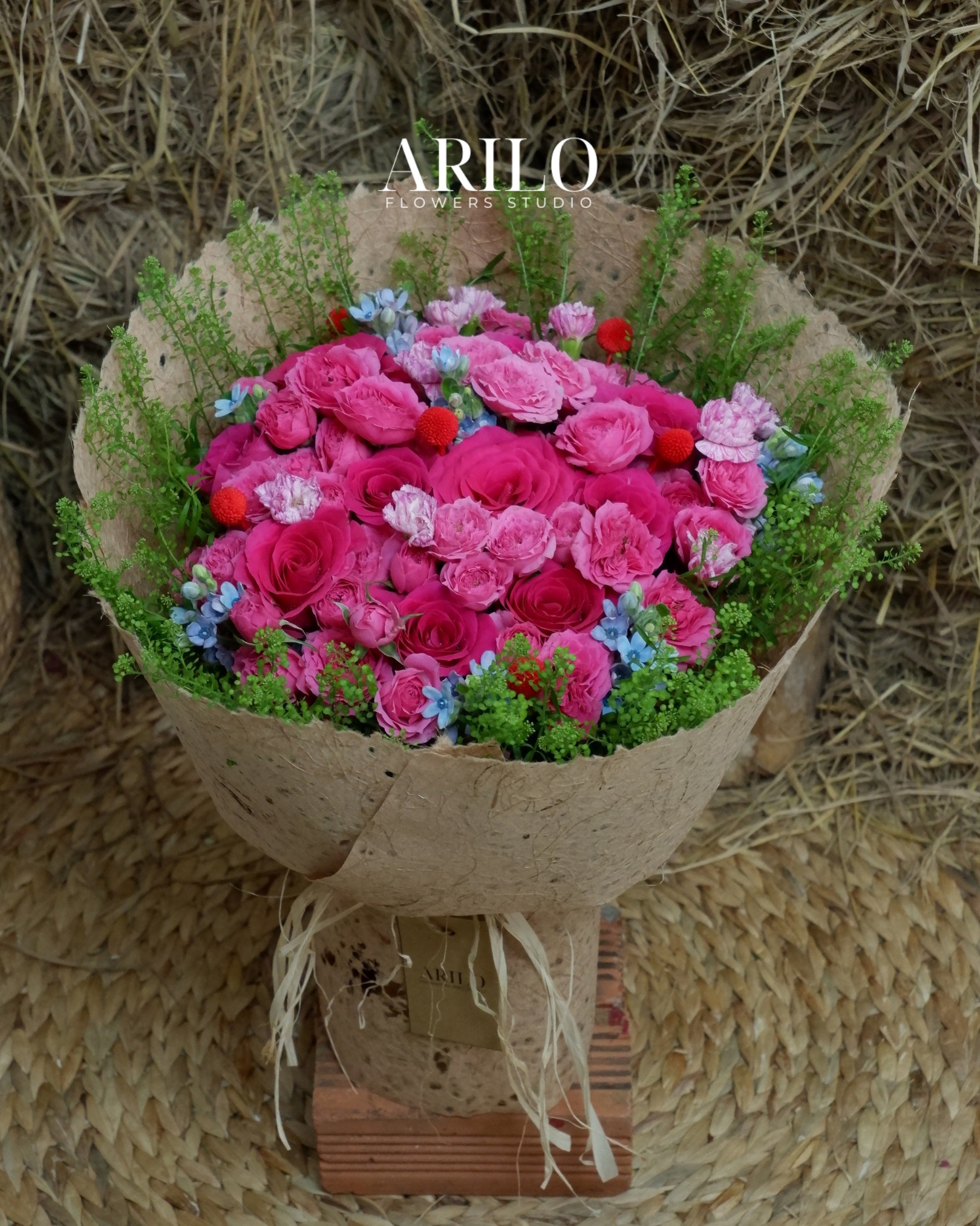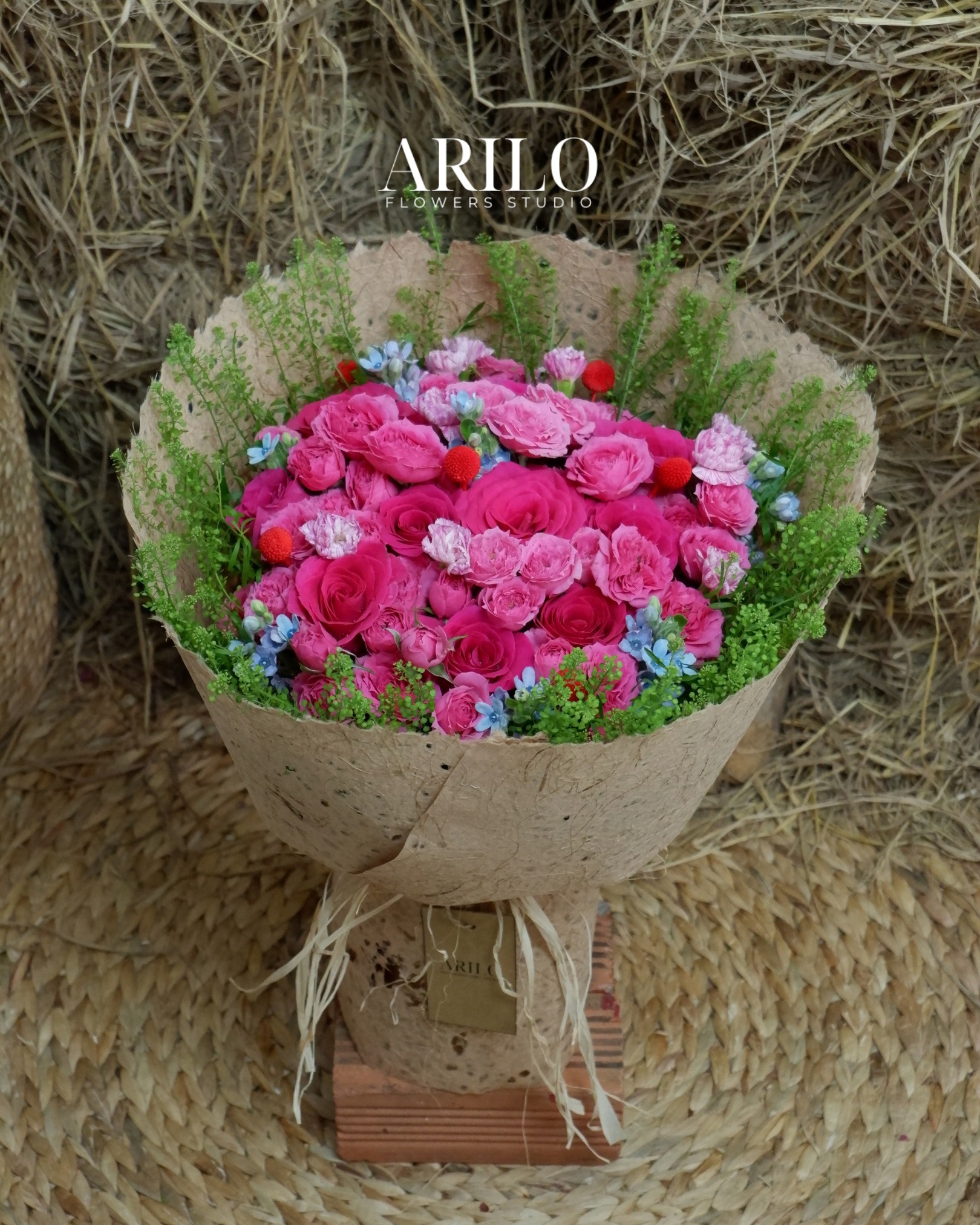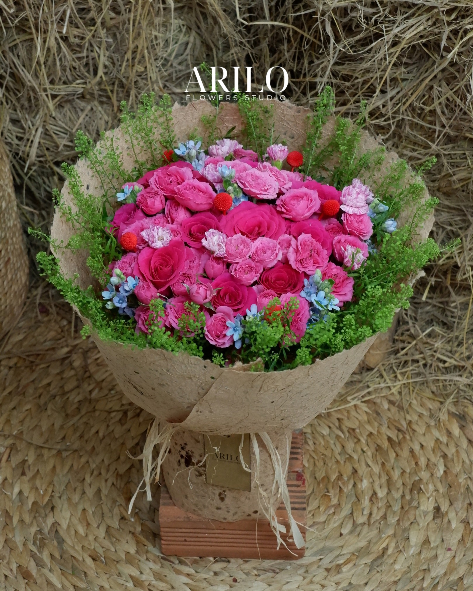 Bó hoa trong hình là sự kết hợp đầy cảm xúc giữa sắc hồng rực rỡ và lối cắm tự nhiên, mang đúng tinh thần mà Shop hoa tươi Sài Gòn – Arilo Flower Studio theo đuổi. Tâm điểm của bó hoa là hoa hồng pinkloy hồng đậm, hoa hồng sofia, xen kẽ hoa cát tường hồng nhánh, điểm nhấn bằng hoa sao xanh, hoa bách nhật đỏ và các loại lá xanh trang trí mềm mại. Tất cả hòa quyện tạo nên tổng thể vừa nổi bật, vừa có chiều sâu, không phô trương nhưng đủ để gây ấn tượng ngay từ ánh nhìn đầu tiên.