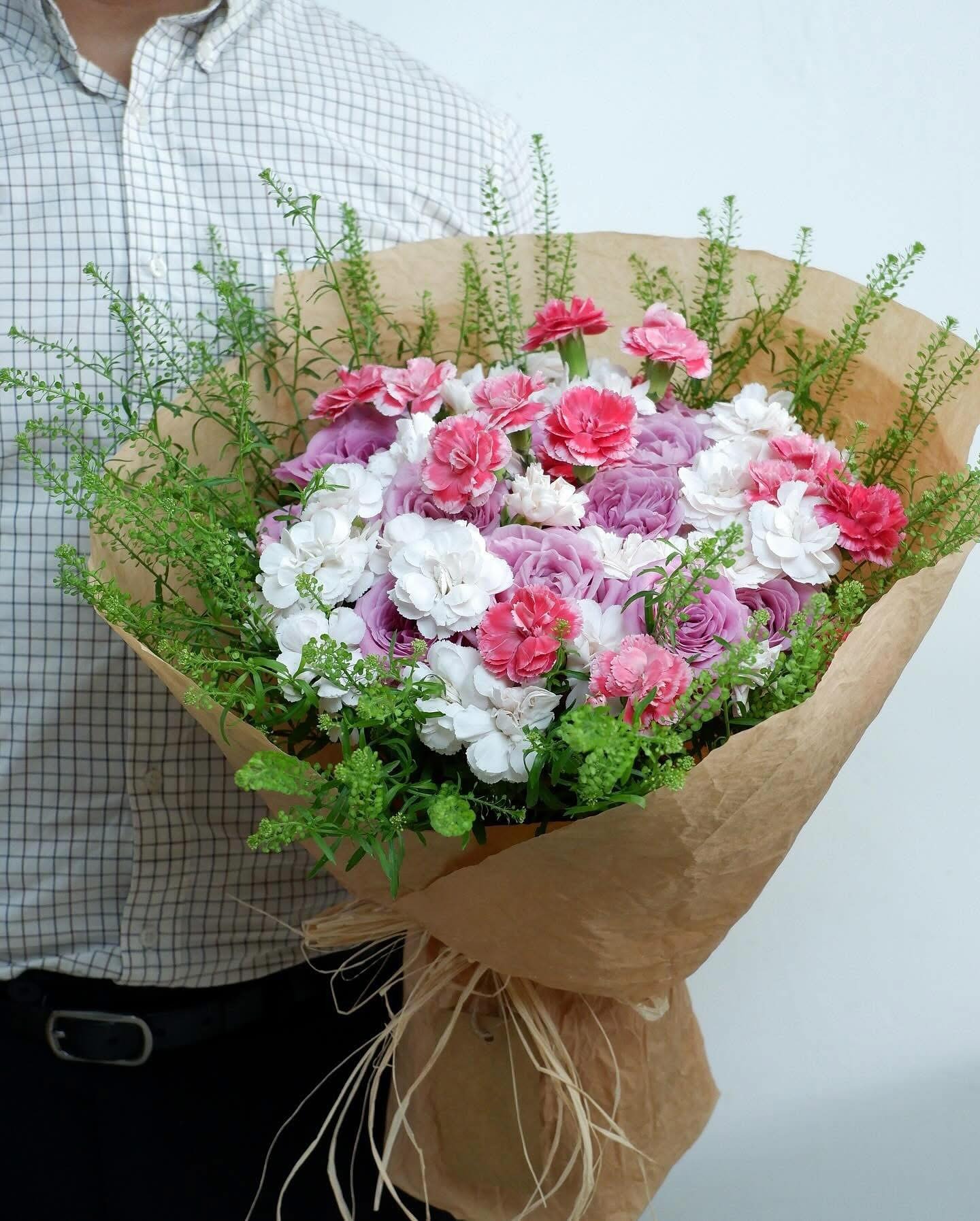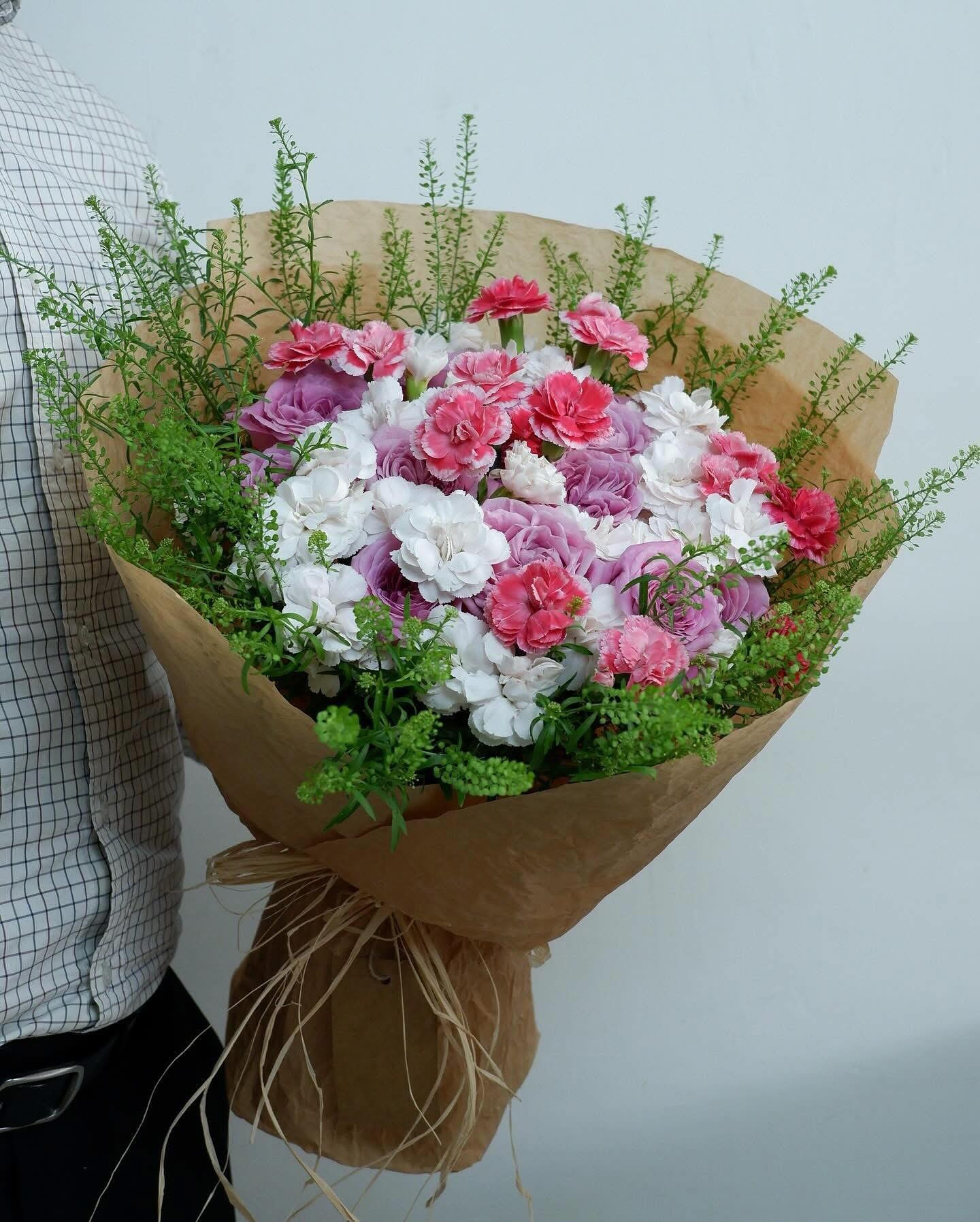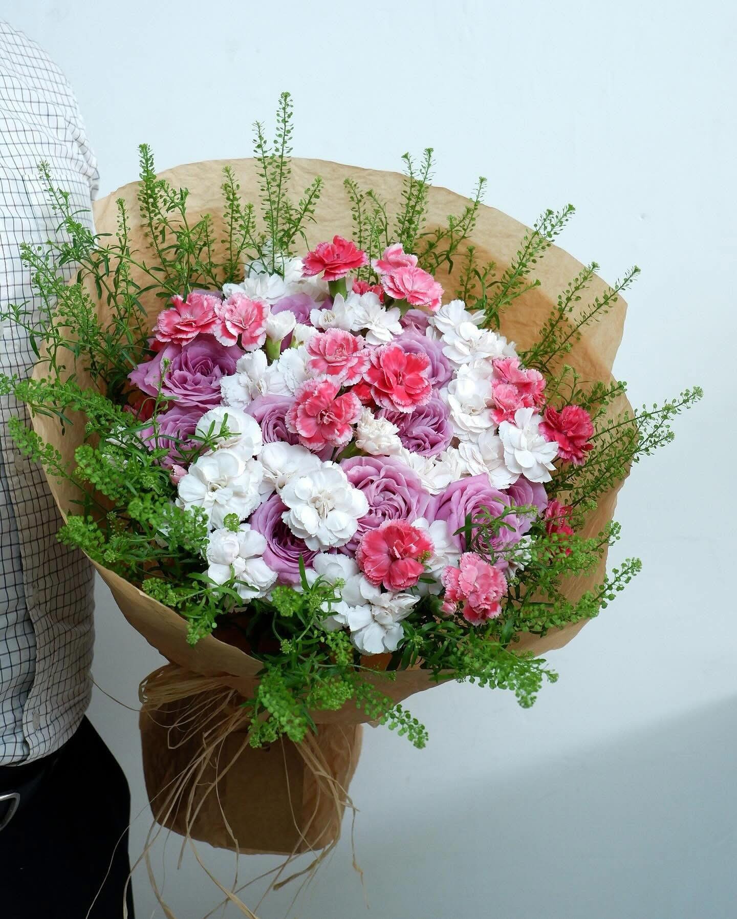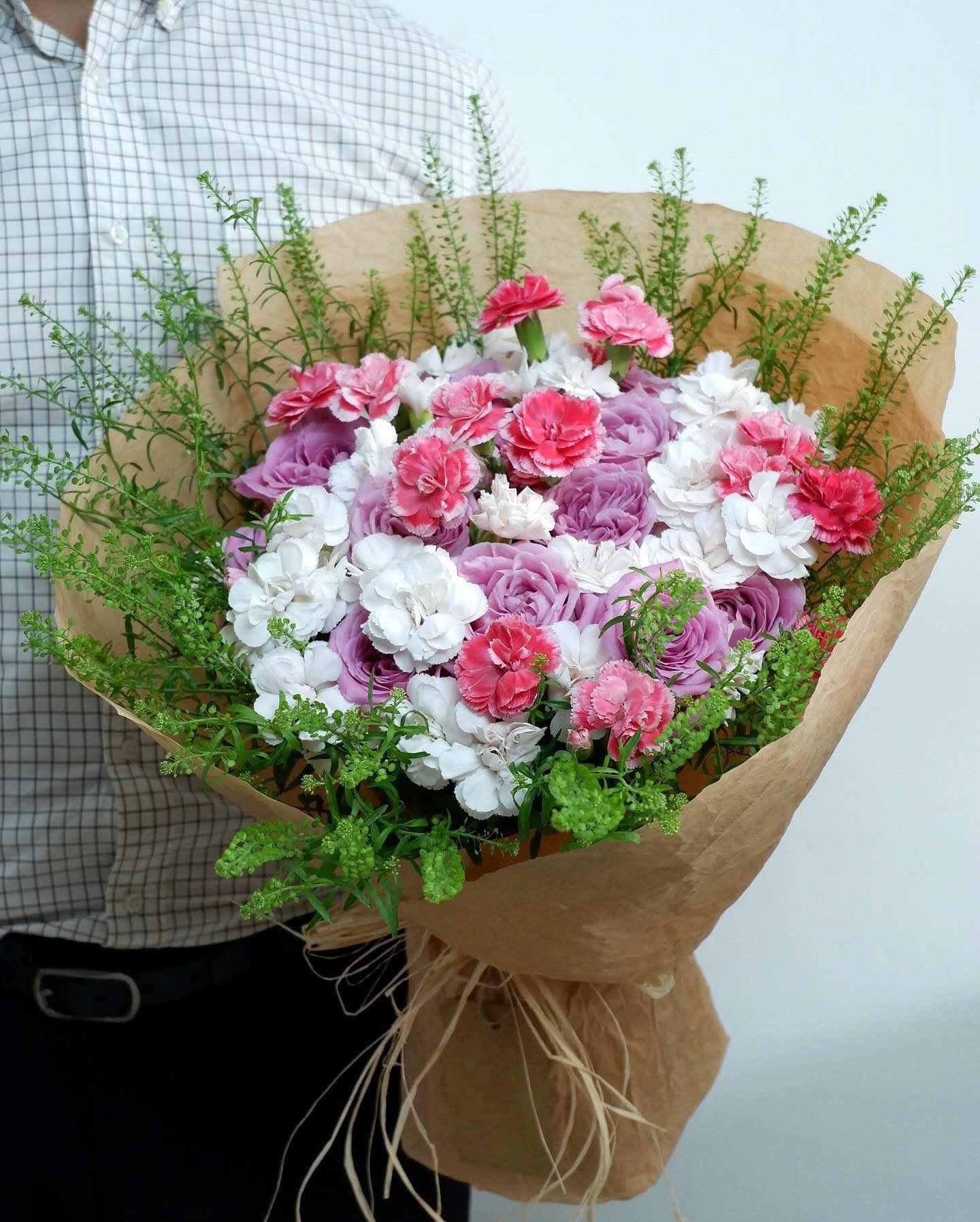 Bó hoa trong hình là sự kết hợp tinh tế giữa sắc tím dịu dàng của hồng tím cà, điểm xuyết cùng hoa cát tường kép màu hồng trắng ngọt ngào, tạo nên tổng thể vừa sang trọng vừa ấm áp. Đây là lựa chọn hoàn hảo cho các dịp hoa sinh nhật, hoa chúc mừng, hay hoa khai trương đầy ý nghĩa.