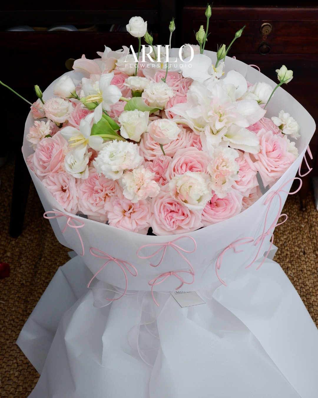 Bức ảnh là một thiết kế mang vẻ đẹp mềm mại và lãng mạn, nổi bật với tông hồng phấn – trắng dịu dàng, tạo cảm giác nhẹ nhàng ngay từ ánh nhìn đầu tiên. Bó hoa được phối hợp tinh tế giữa hoa hồng phấn, hoa cẩm chướng trắng, hoa cát tường trắng, hoa lily trắng và điểm xuyết nụ hoa non xanh giúp tổng thể thêm sinh động, tự nhiên. Các loài hoa được cắm dày, tròn đầy, xếp lớp mềm mại, kết hợp cùng giấy gói trắng trong và những chiếc nơ hồng nhỏ xinh, mang lại cảm giác ngọt ngào và nữ tính.