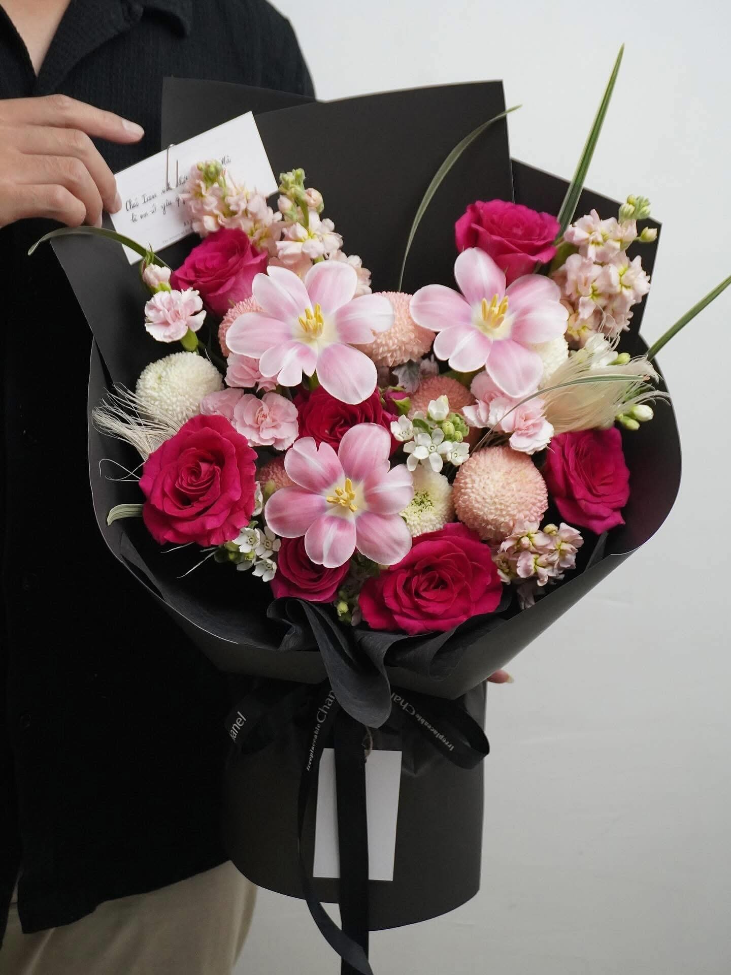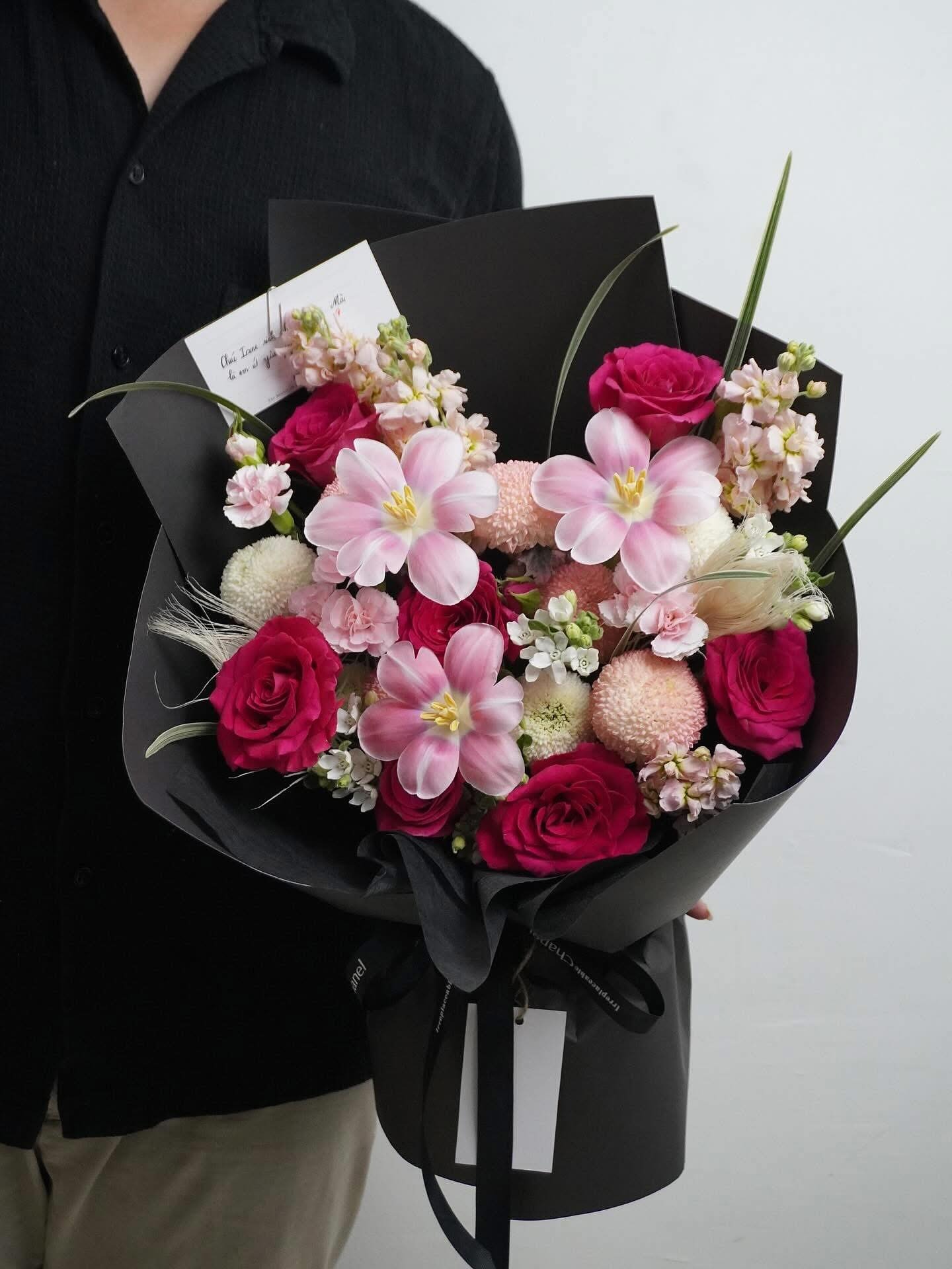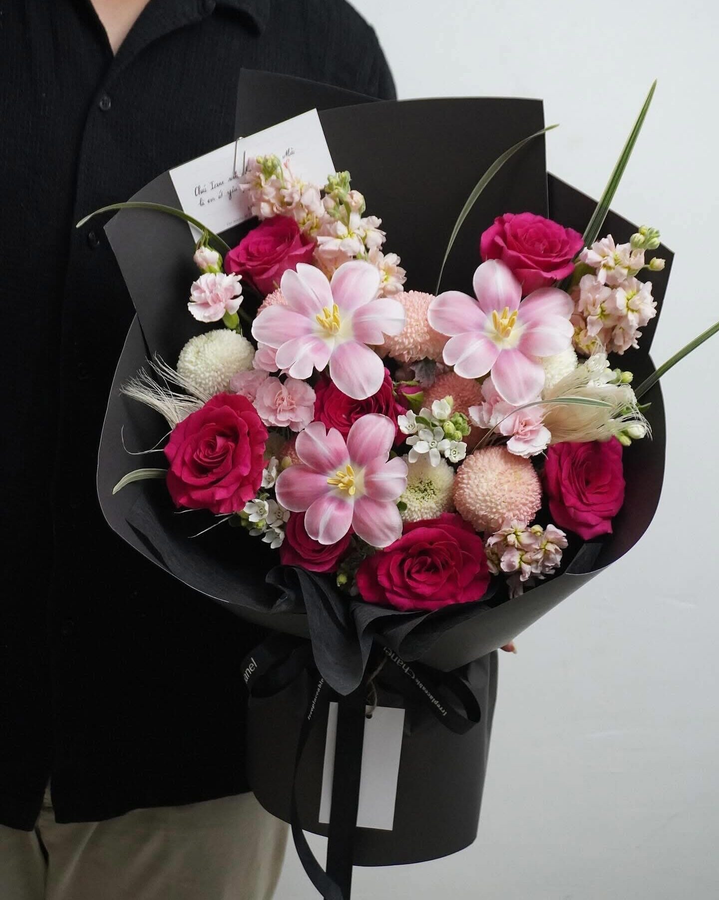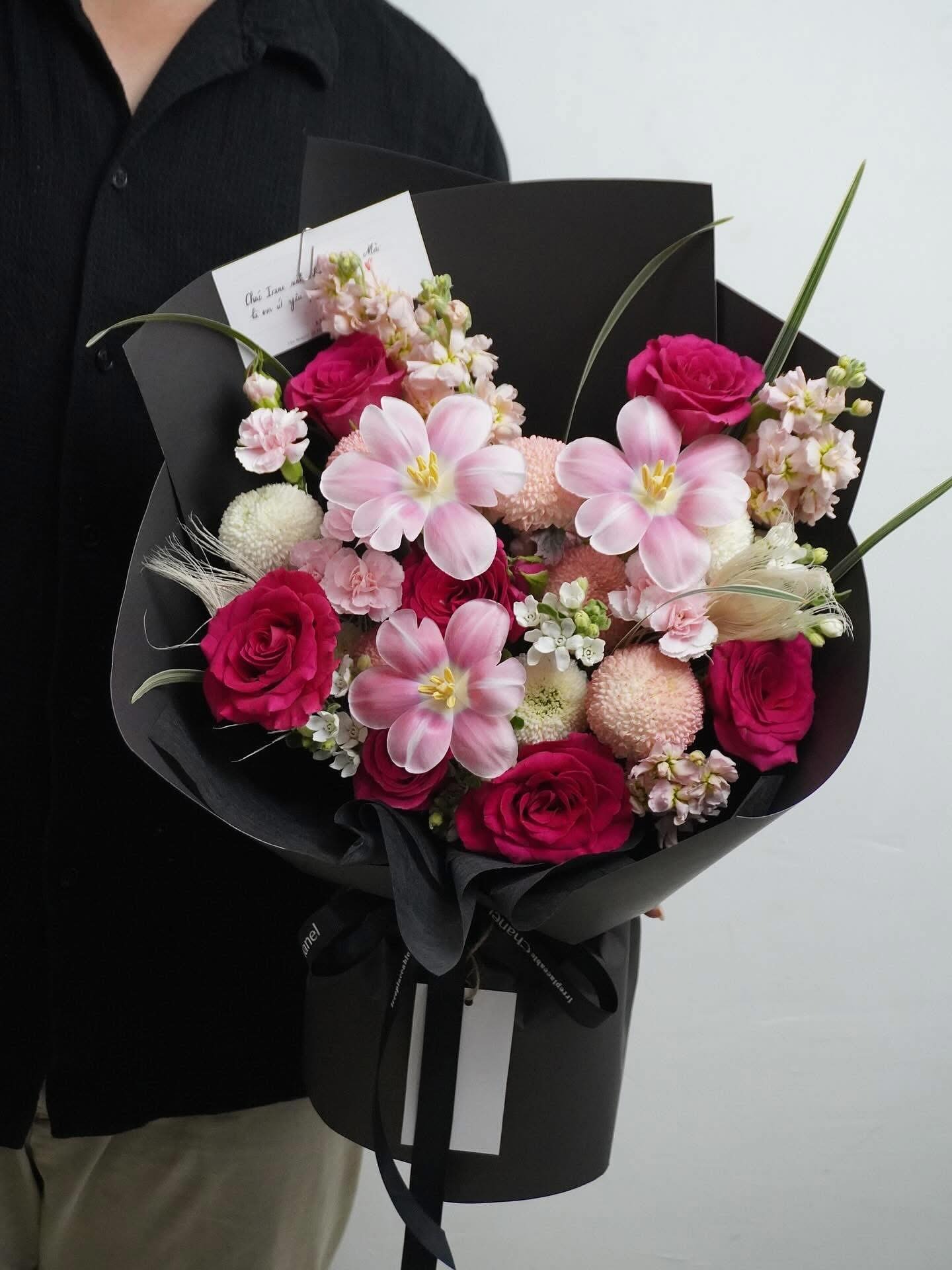 Bó hoa tone hồng – đỏ thanh lịch trong hình là thiết kế độc quyền từ Shop hoa tươi Sài Gòn – Arilo Flower Studio, kết hợp giữa hoa hồng pinkloyd đỏ đậm, tulip pastel nhẹ nhàng, lam tinh màu trắng, cúc pingpong, hoa phi yến và hoa trang trí cao cấp. Lớp giấy gói đen sang trọng giúp tôn lên sắc hoa nổi bật, tạo cảm giác hiện đại và tinh tế. Bó hoa rất phù hợp làm hoa sinh nhật, hoa chúc mừng hay hoa khai trương, mang đến lời chúc ý nghĩa và trọn vẹn dành cho người nhận.