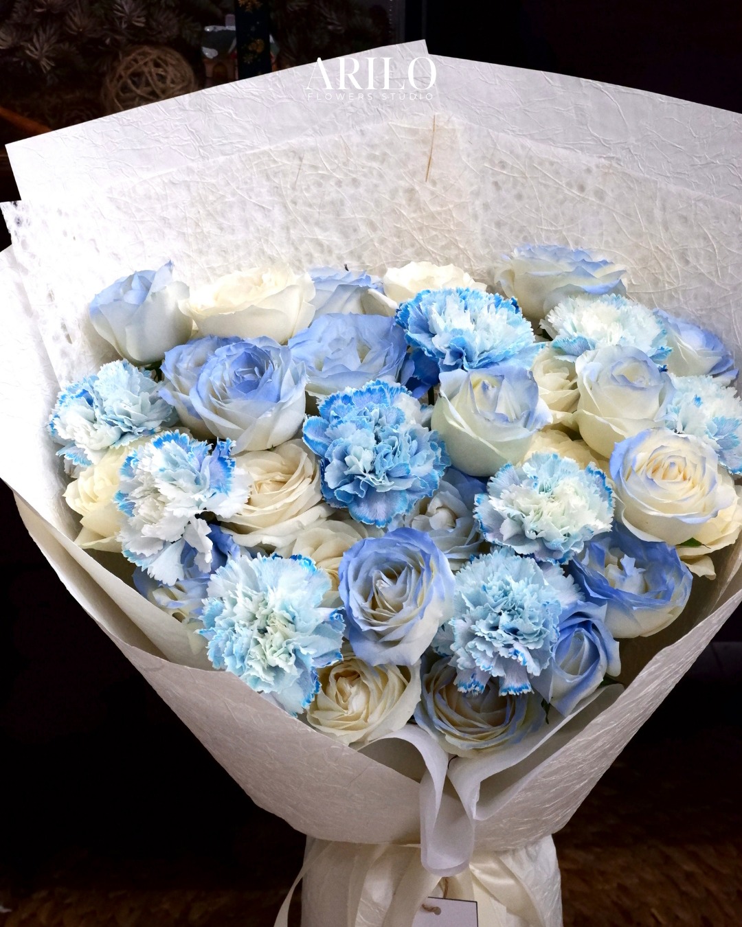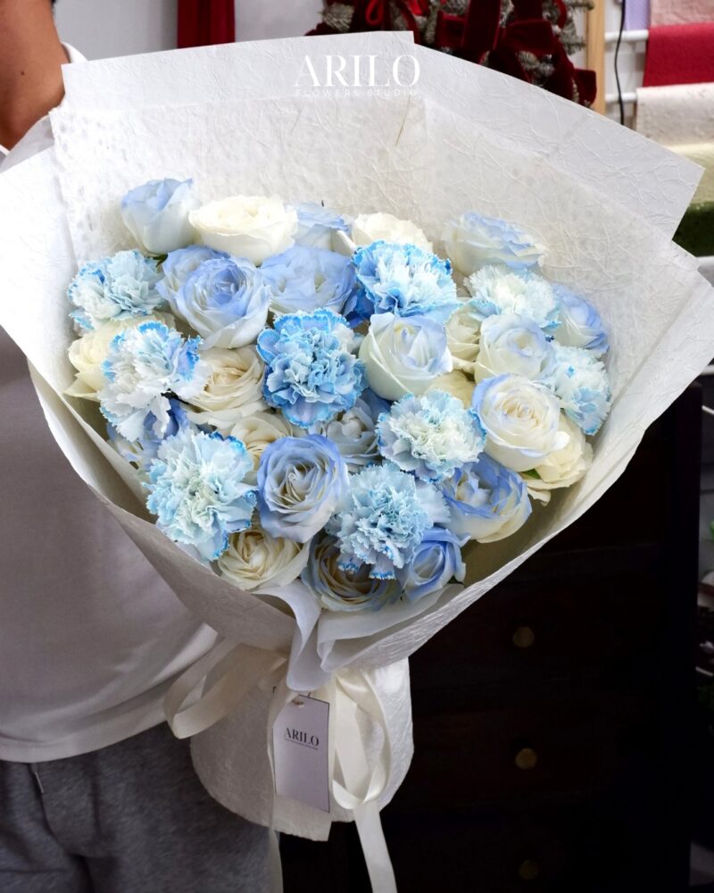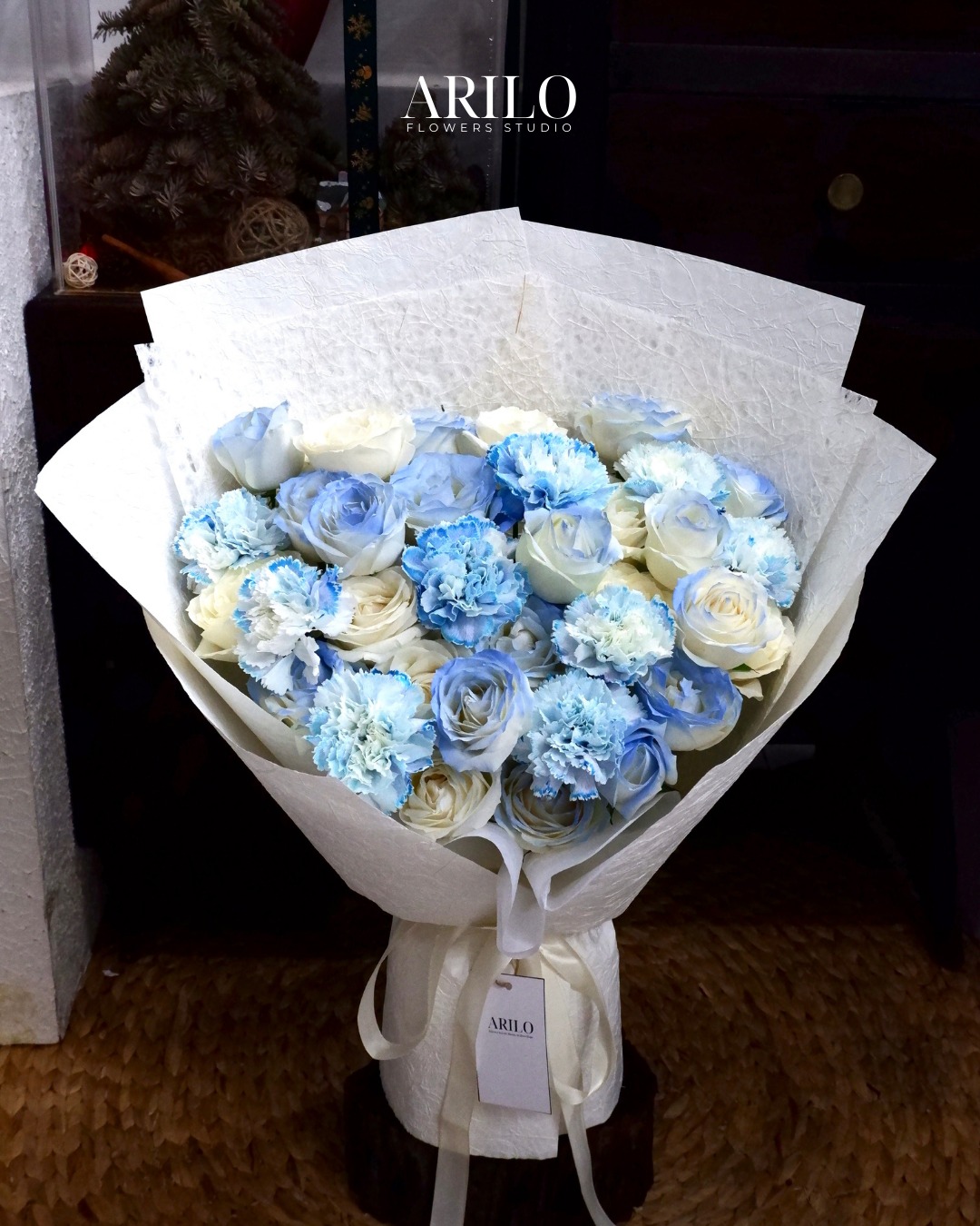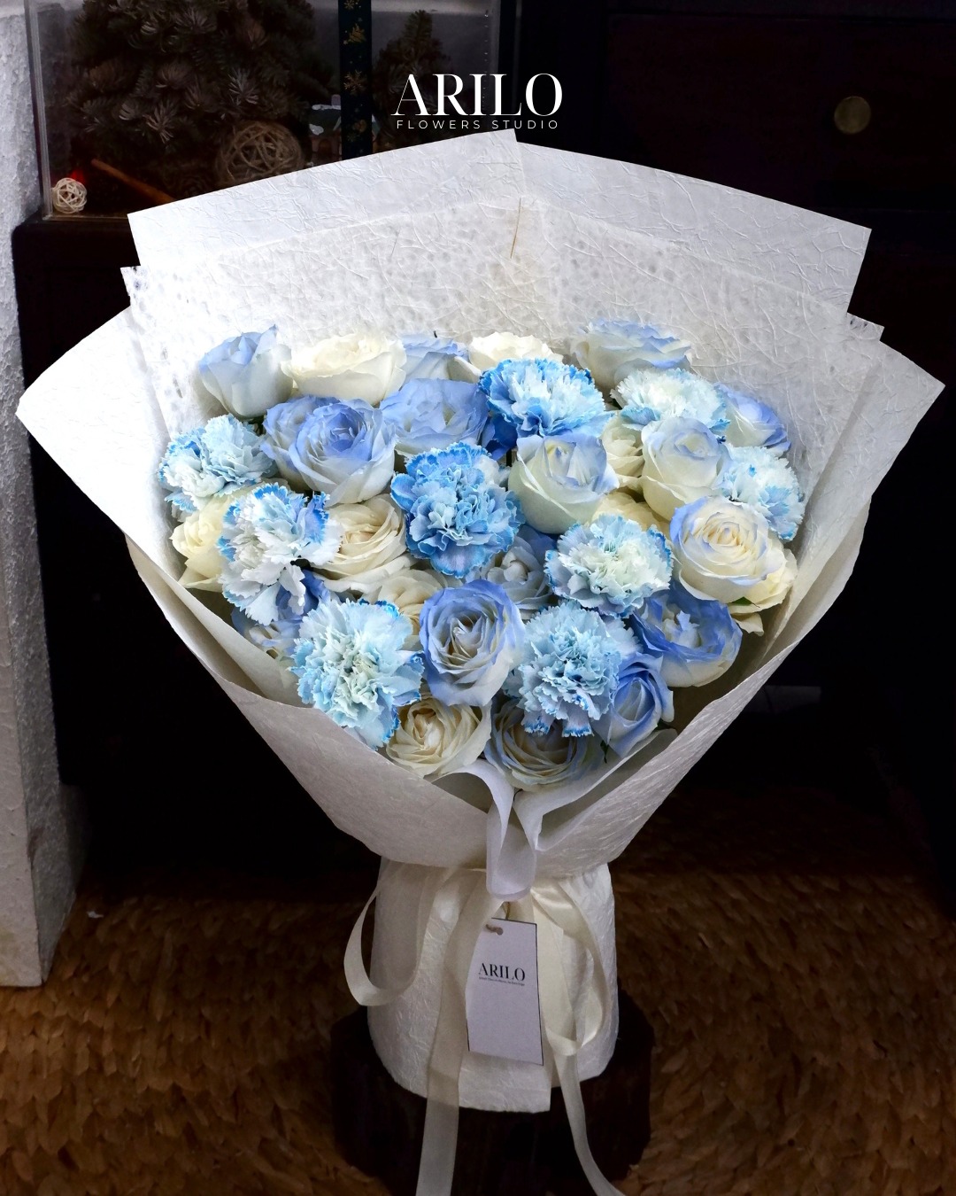 Bó hoa sinh nhật tone xanh dương – trắng là sự kết hợp tinh tế giữa hồng xanh, hồng trắng và cẩm chướng xanh pastel. Sắc xanh dịu nhẹ hòa cùng màu trắng tinh khôi tạo nên tổng thể thanh mát, sang trọng và đầy cuốn hút. Form hoa tròn đầy, dày bông mang đến cảm giác viên mãn và tinh tế. Lớp giấy gói trắng cao cấp cùng nơ lụa mềm giúp thiết kế trở nên trang nhã, phù hợp cho nhiều dịp đặc biệt. Mẫu hoa lý tưởng để tặng sinh nhật người yêu, bạn bè hoặc đồng nghiệp. Ngoài ra, thiết kế cũng có thể sử dụng làm bó hoa tỏ tình theo phong cách nhẹ nhàng. Sản phẩm được thực hiện bởi shop hoa tươi Sài Gòn Arilo Flower Studio, đảm bảo độ tươi mới và thẩm mỹ cao.-—————————