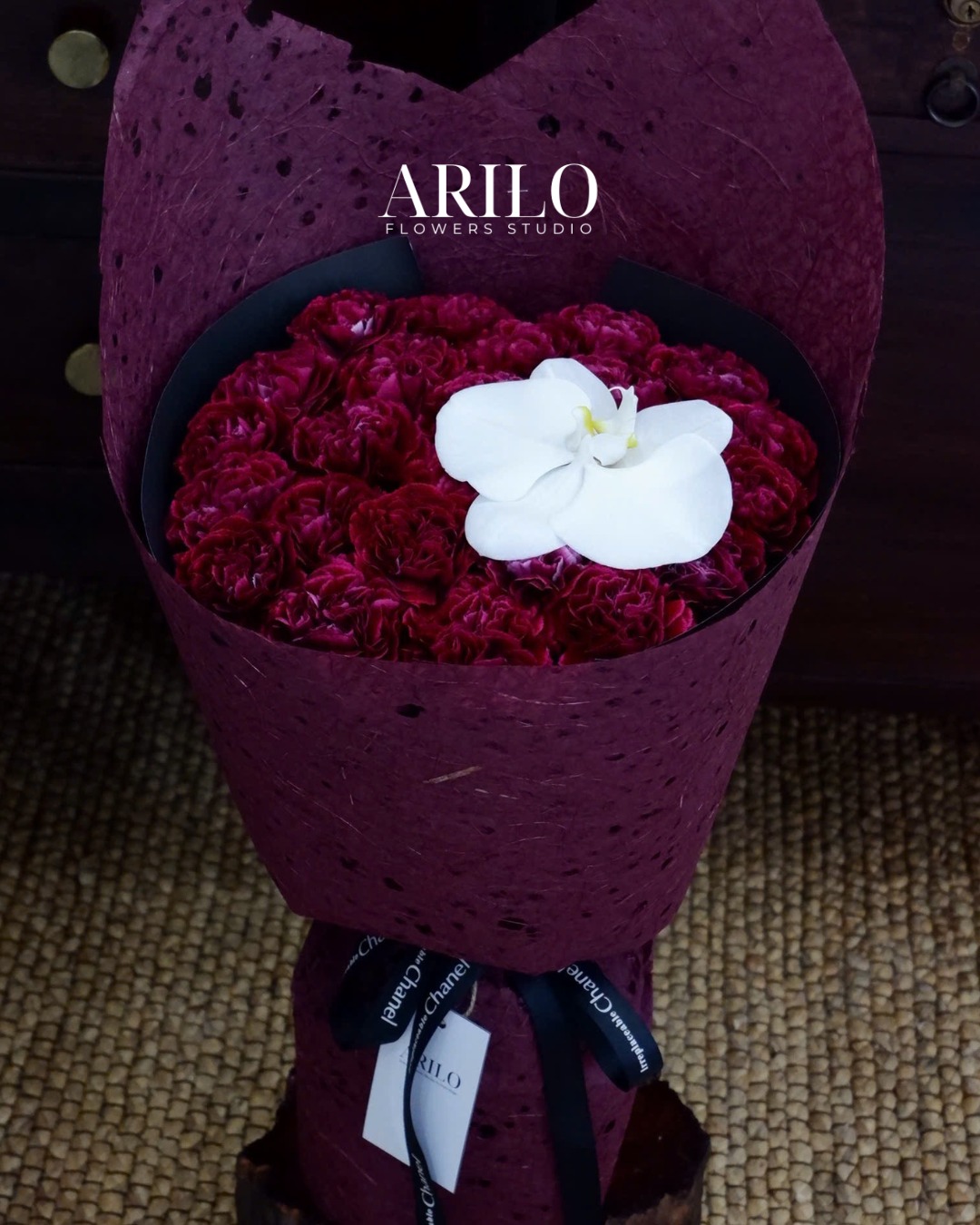 Lớp giấy gói tông mận kết hợp nền đen tạo cảm giác hiện đại, sang trọng nhưng không quá phô trương. Khi cầm trên tay, bó hoa mang lại cảm giác chắc chắn và đầy đặn, tạo ấn tượng mạnh ngay từ ánh nhìn đầu tiên. Sự tương phản giữa sắc đỏ đậm và lan hồ điệp trắng khiến người nhận dễ dàng tập trung vào trung tâm bó hoa, nơi chứa đựng thông điệp chính.