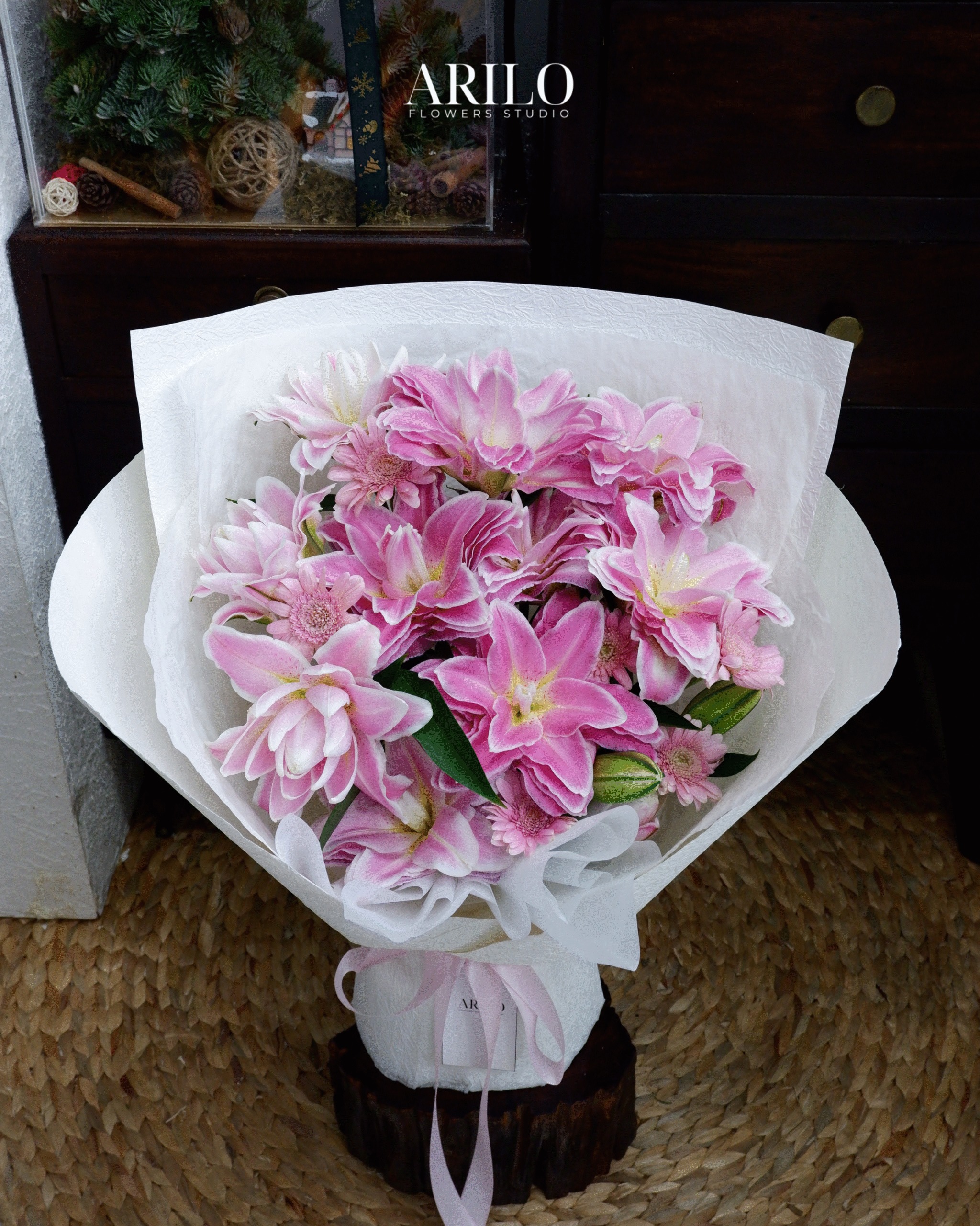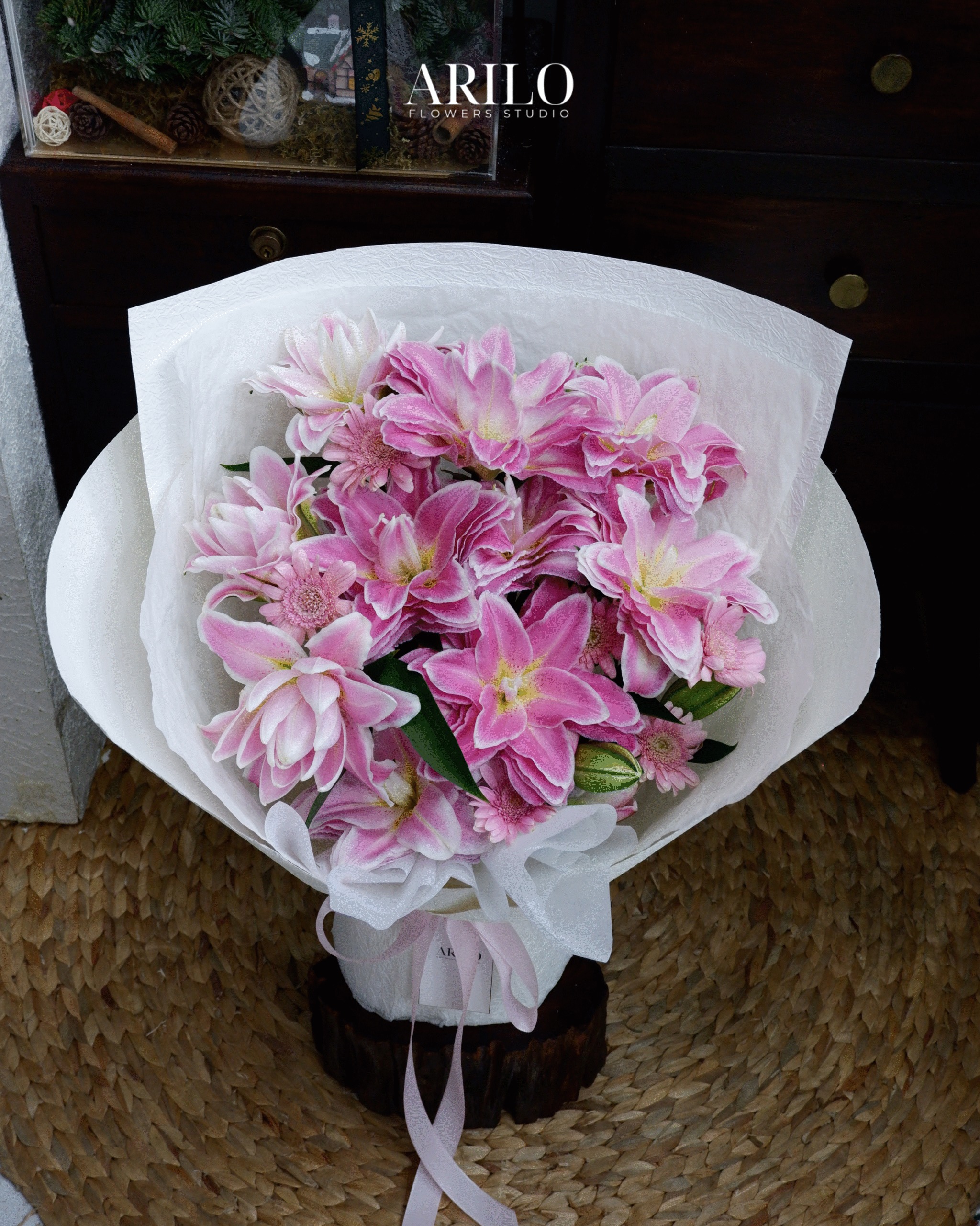 Bố cục được thiết kế theo dạng tròn tự nhiên, tập trung vào sự hài hòa về màu sắc và độ cao thấp của từng loại hoa, để khi nhìn vào, ánh mắt sẽ được dẫn dắt một cách mềm mại từ những cánh bách hợp bung nở cho đến những đóa đồng tiền rạng rỡ. Lớp giấy gói trắng nhiều tầng tạo hiệu ứng bồng bềnh, như một nền mây nâng đỡ phần hoa phía trên, giúp sắc hồng trở nên nổi bật nhưng vẫn giữ được nét thanh lịch vốn có.