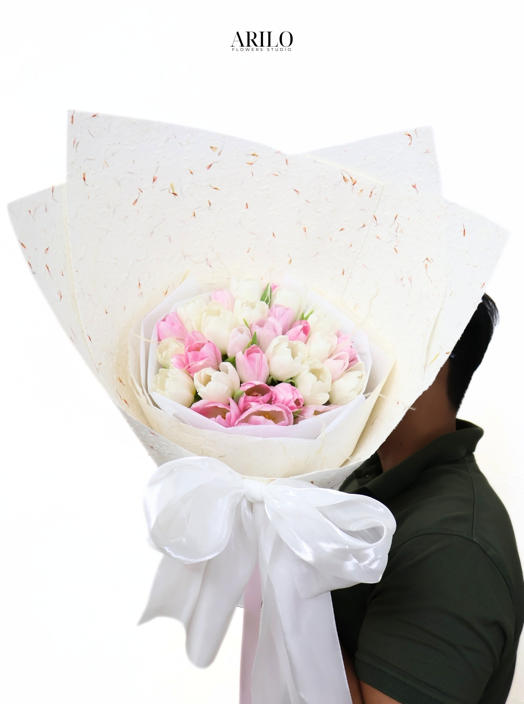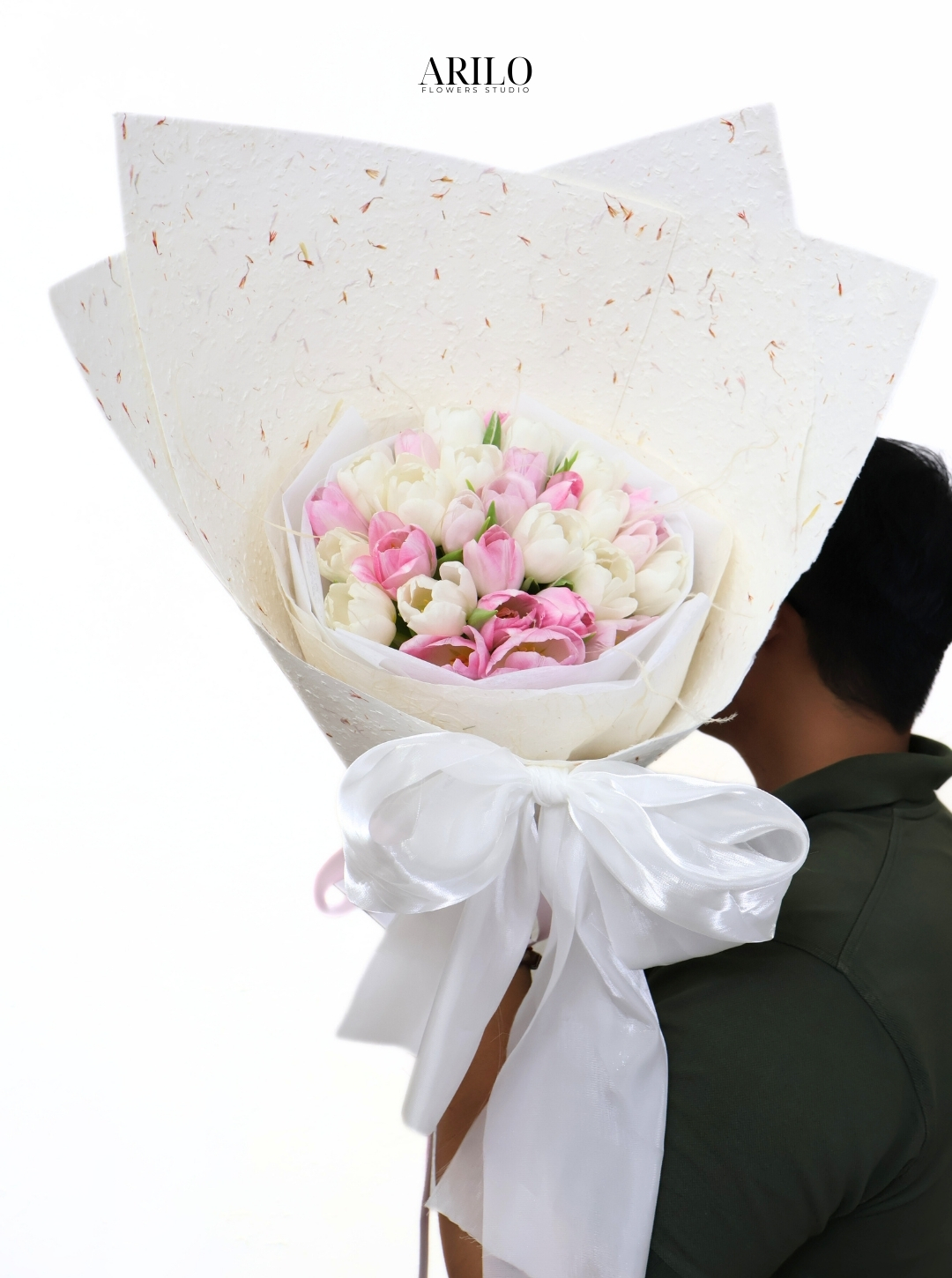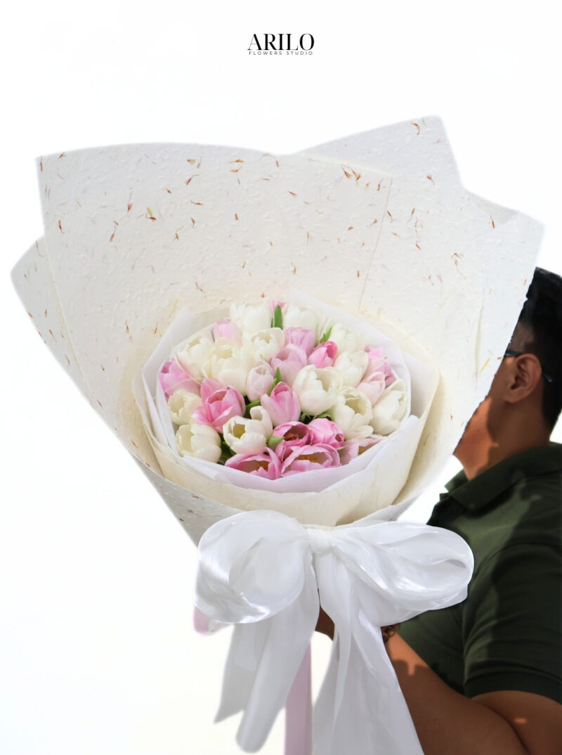 Trong thế giới của hoa tươi, có những bó hoa mang vẻ đẹp rực rỡ và nổi bật, nhưng cũng có những bó hoa chinh phục người nhìn bằng sự tinh tế và dịu dàng. Bó hoa tulip hồng trắng này thuộc về nhóm thứ hai – vẻ đẹp không ồn ào nhưng đủ để khiến trái tim rung động ngay từ cái nhìn đầu tiên.