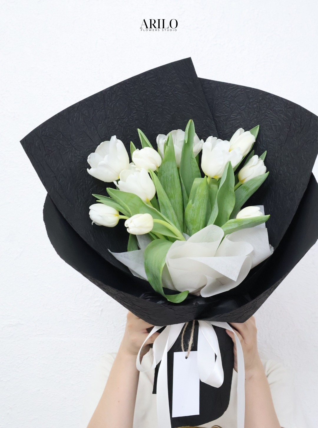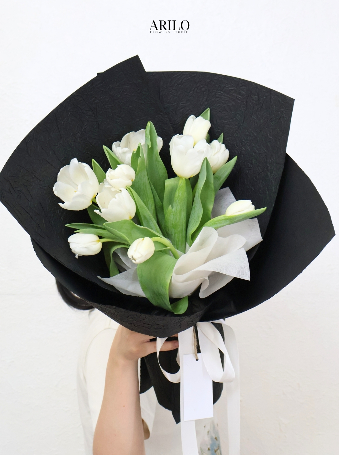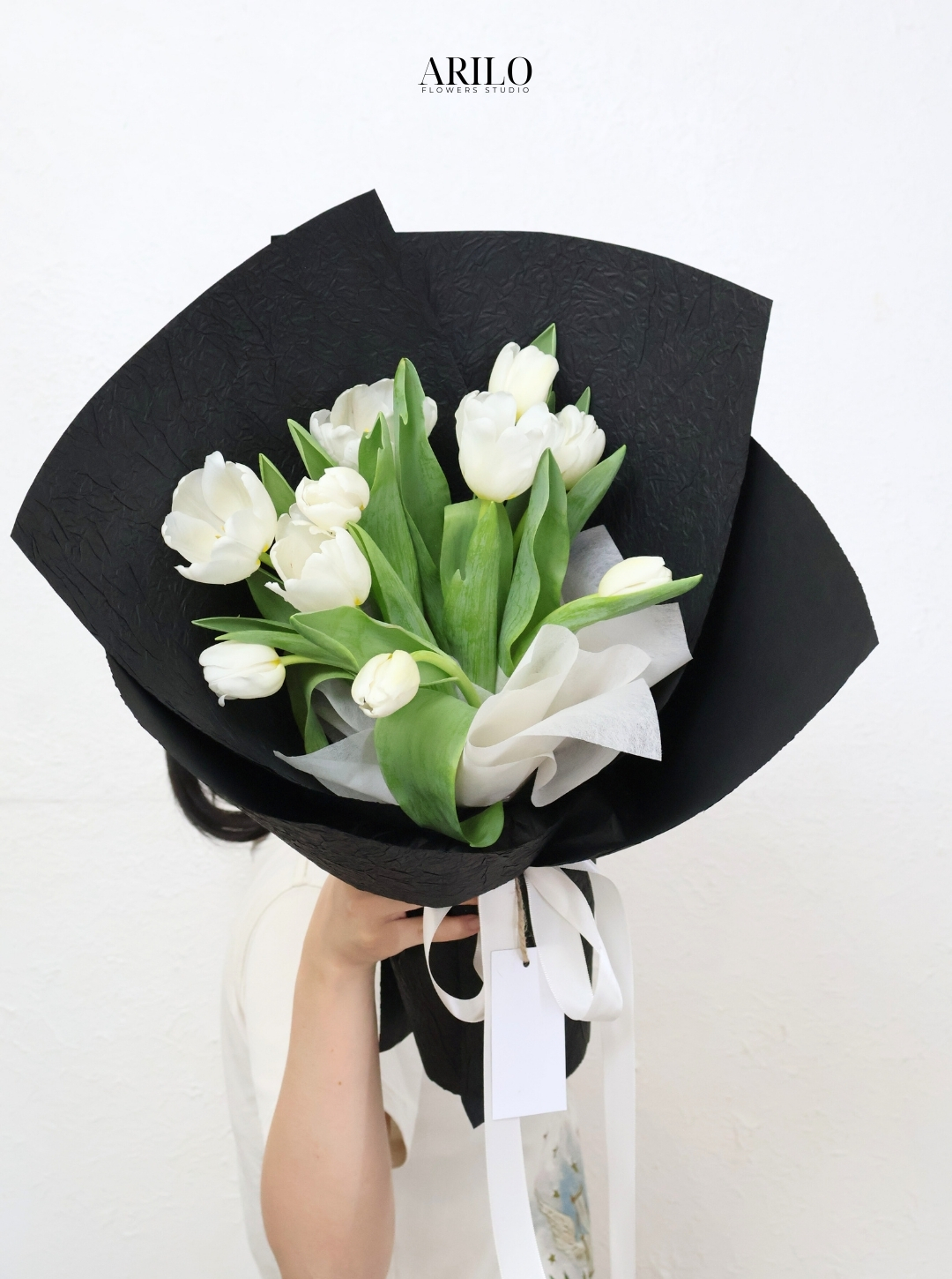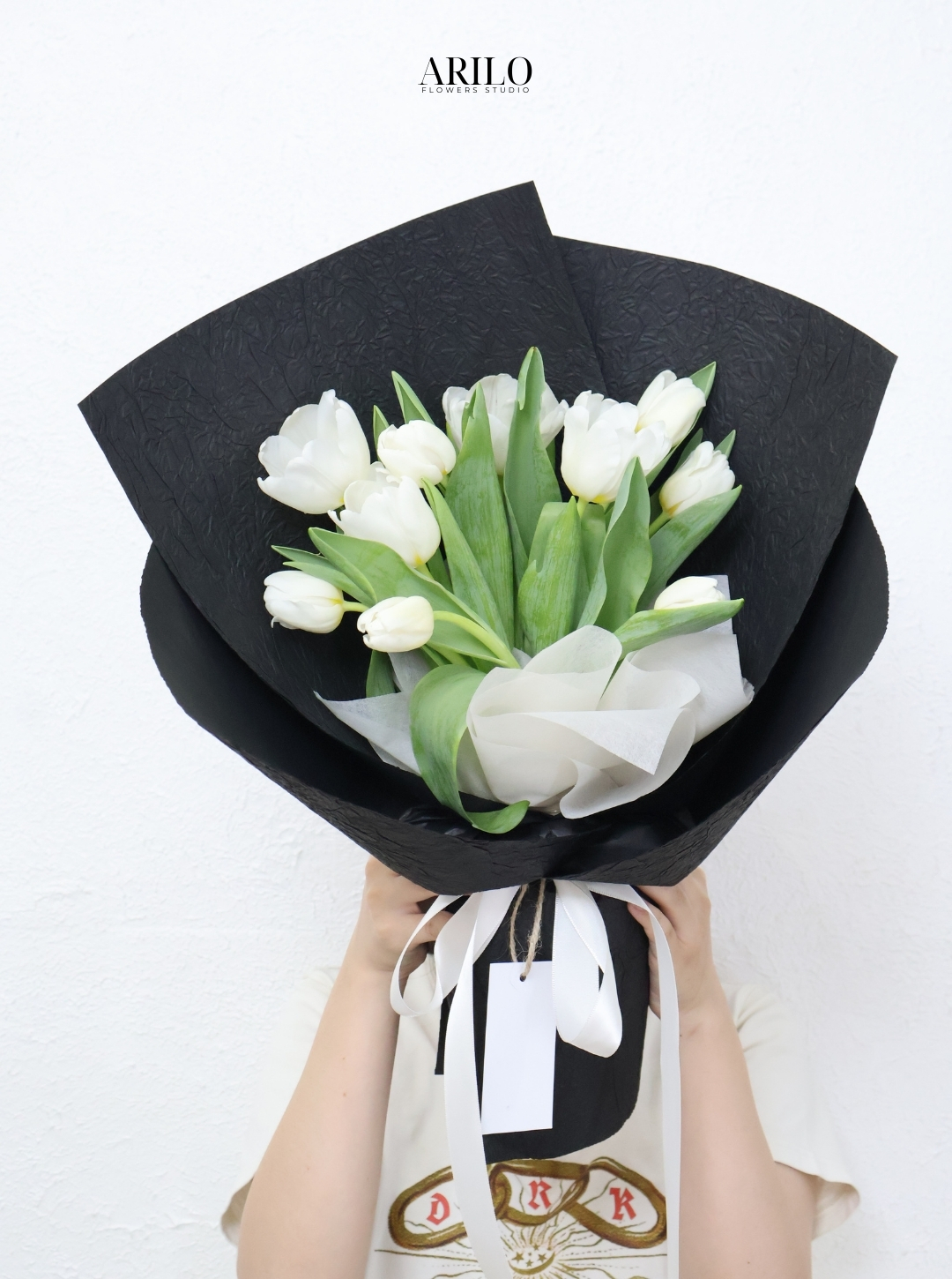 Phong cách gói của bó hoa mang vẻ đẹp hiện đại và tinh tế. Lớp giấy gói màu đen tạo nên sự sang trọng và giúp làm nổi bật sắc trắng thanh khiết của tulip.