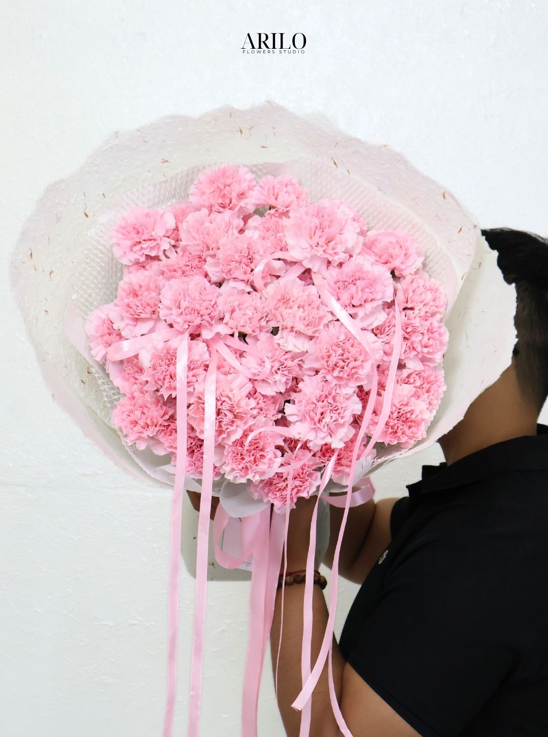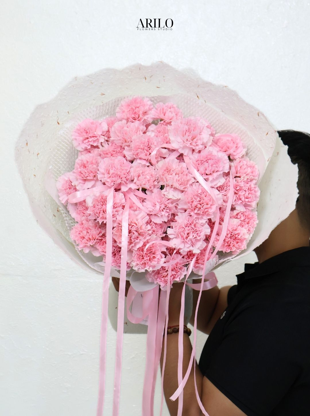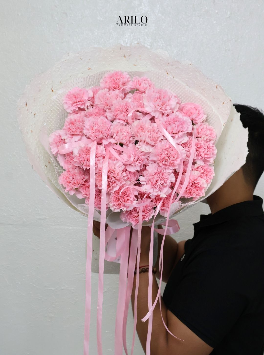 Những bông cẩm chướng được sắp xếp thành một khối tròn đầy, tạo cảm giác trọn vẹn và ấm áp. Gam màu hồng pastel mang đến sự dịu dàng, giống như những quan tâm nhỏ bé nhưng luôn hiện diện trong cuộc sống hàng ngày. Điểm đặc biệt của bó hoa nằm ở những dải ruy băng mềm mại được đan xen khéo léo, tạo nên sự uyển chuyển và nữ tính.