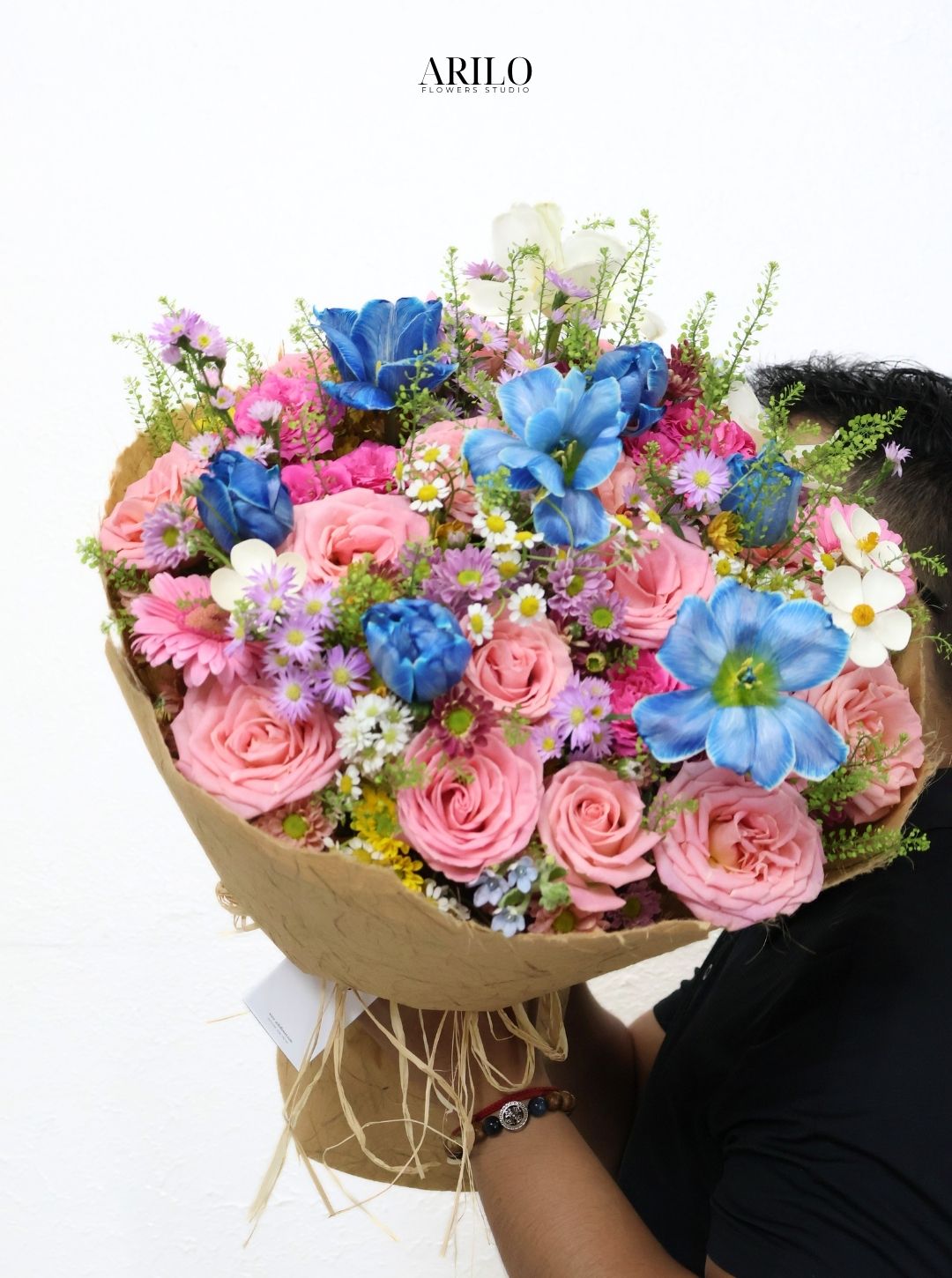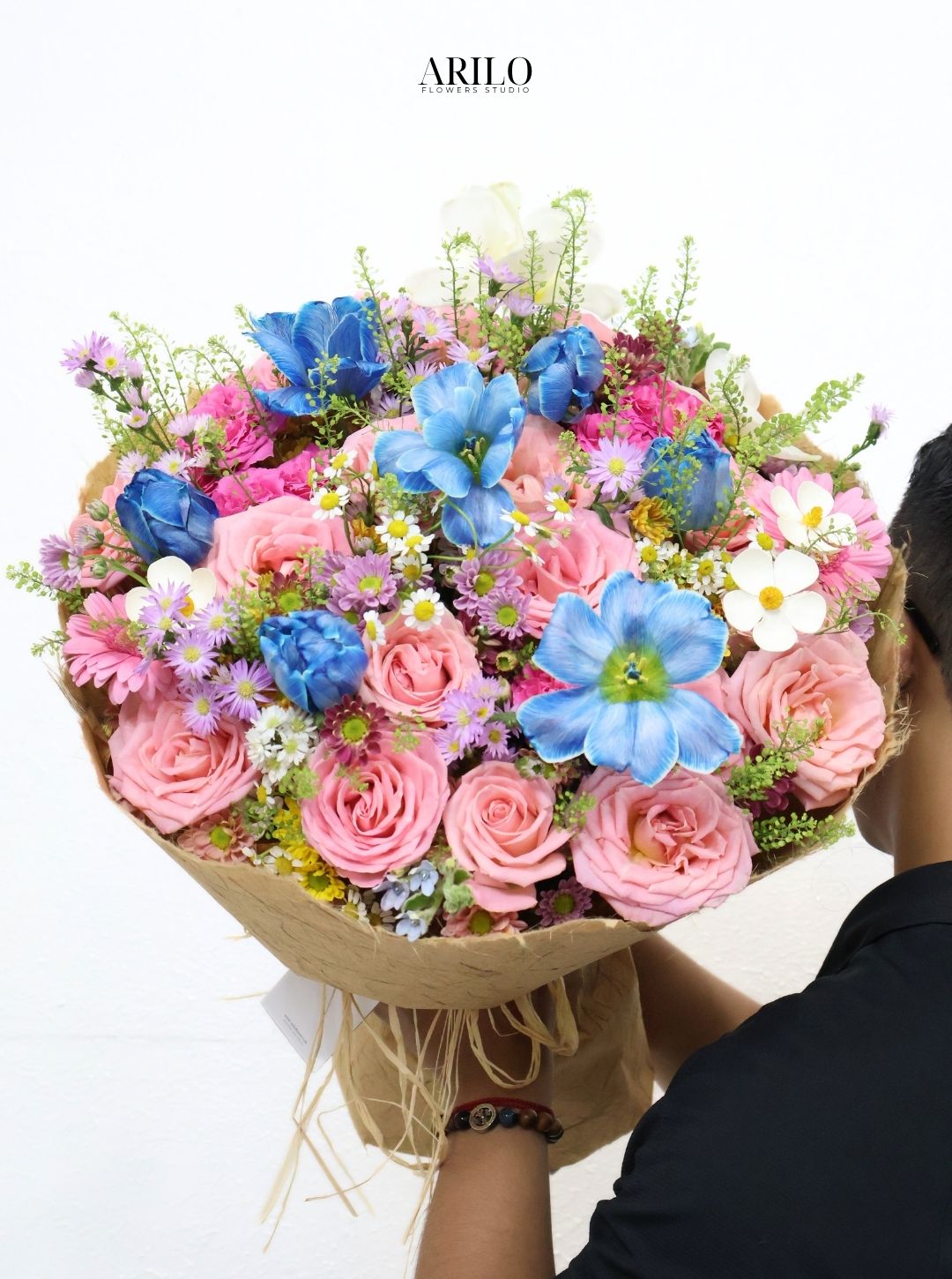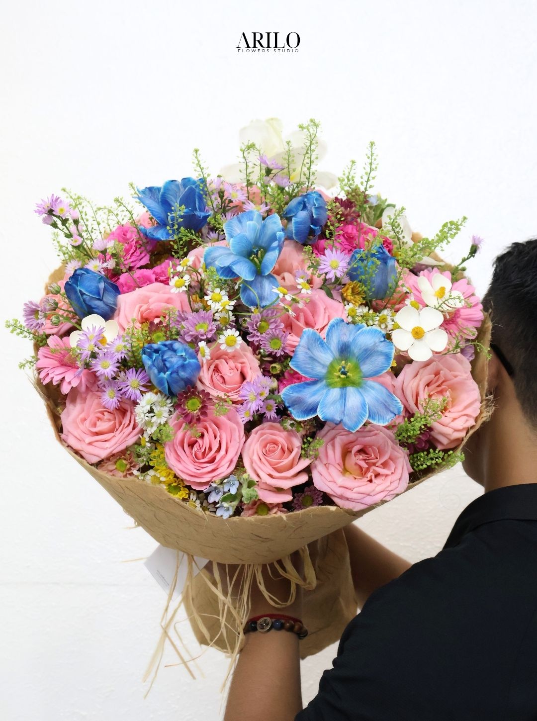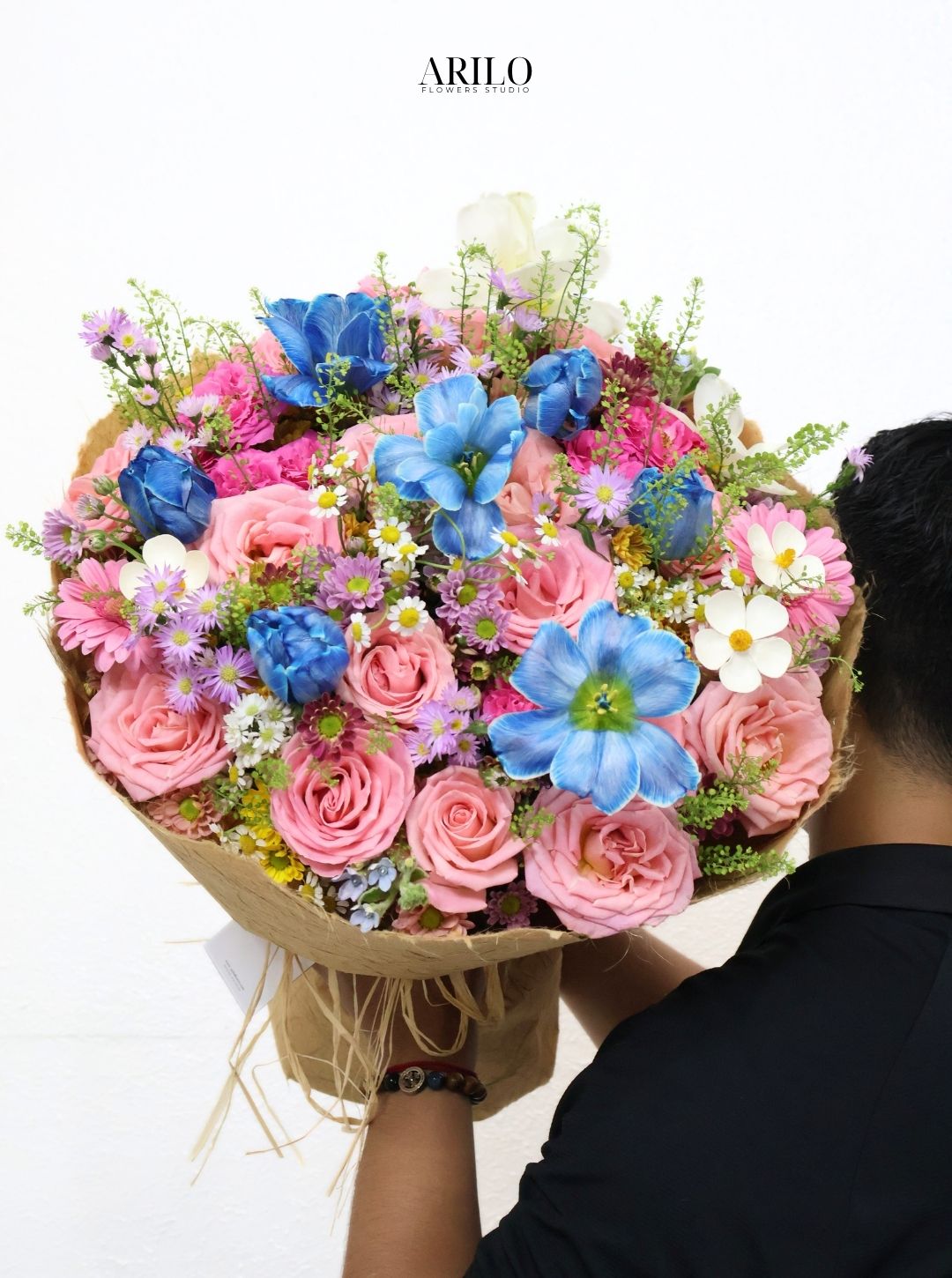 Trong bó hoa, sắc hồng của hoa hồng đóng vai trò chủ đạo, mang đến cảm giác dịu dàng và ấm áp. Xen kẽ là những bông hoa xanh dương nổi bật, tạo điểm nhấn độc đáo, cùng với các loại hoa nhỏ như cúc, baby và hoa dại giúp tổng thể trở nên sinh động hơn.