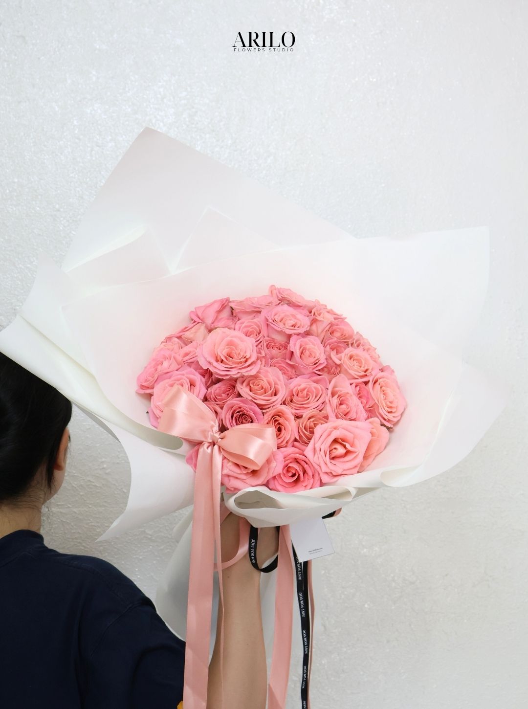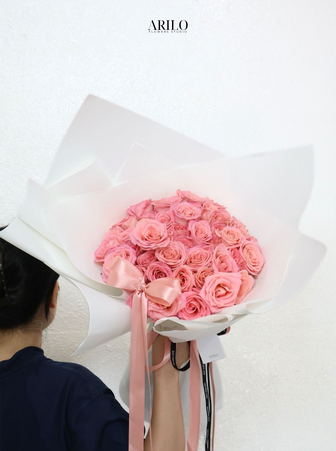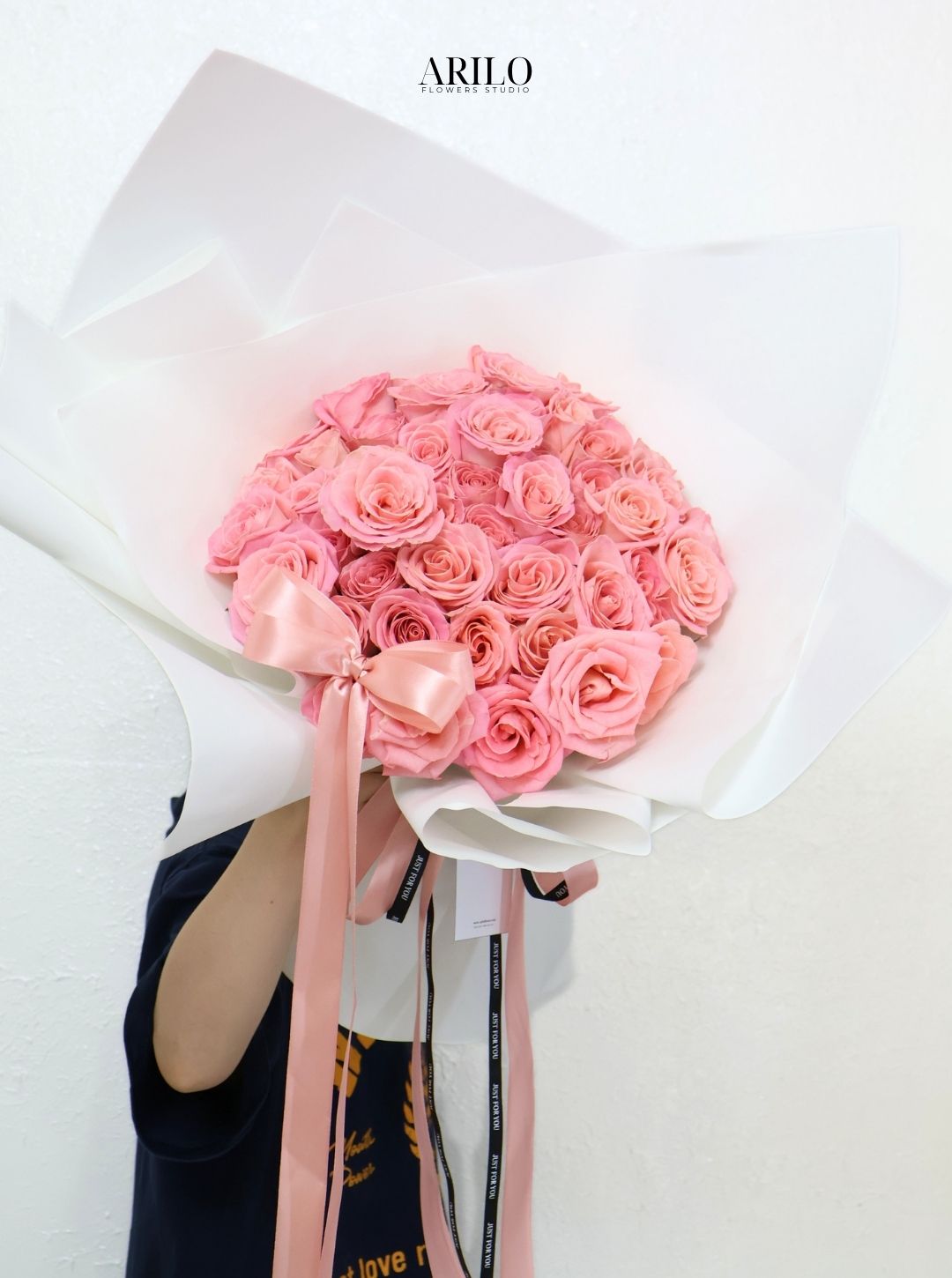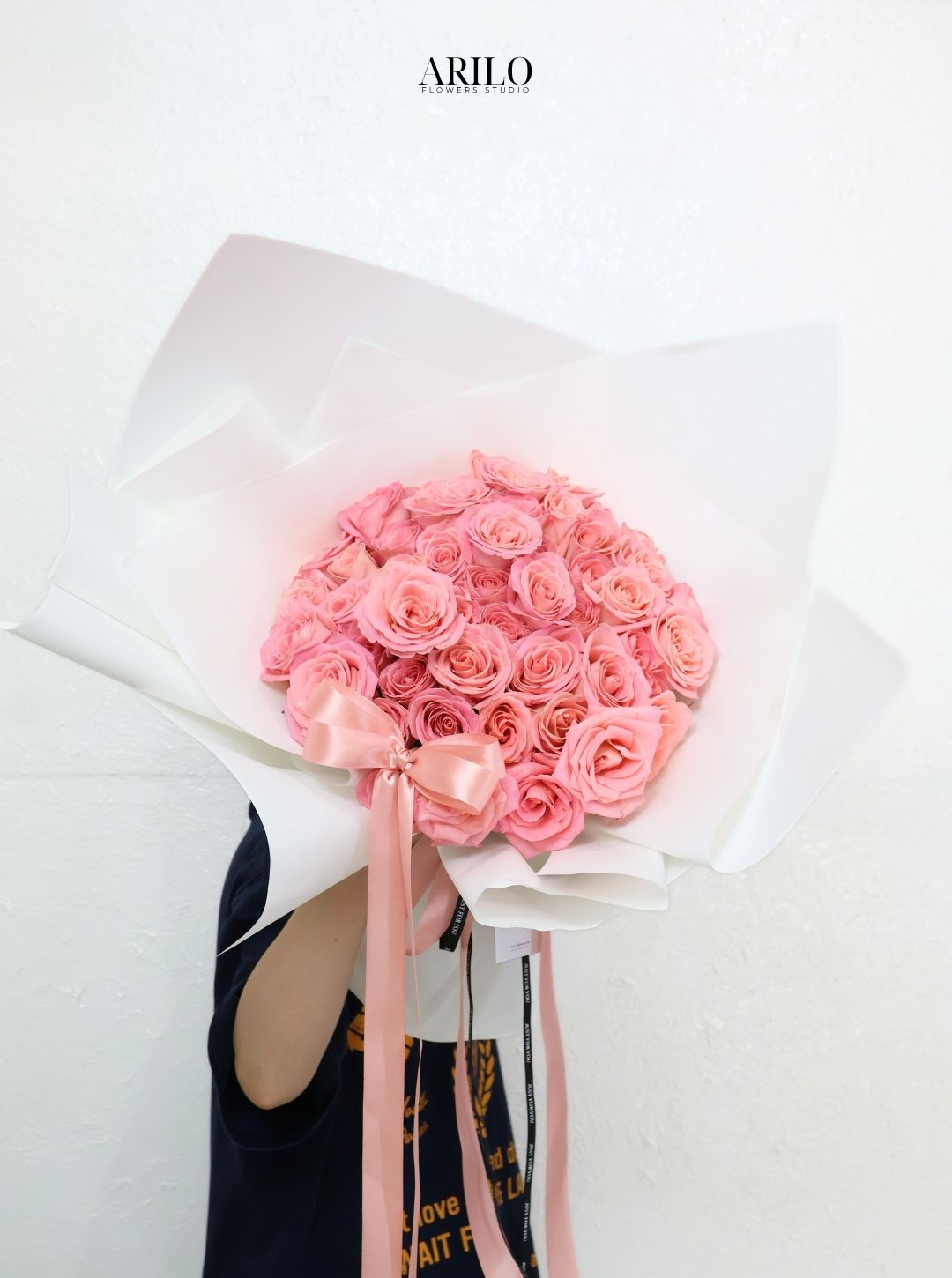 Tại shop hoa tươi sài gòn Arilo Flower Studio, bó hoa được thiết kế theo phong cách hiện đại, tối giản nhưng vẫn giữ được sự sang trọng. Lớp giấy gói trắng giúp làm nổi bật sắc hồng của hoa, trong khi chiếc nơ mềm mại tạo nên điểm nhấn tinh tế cho tổng thể.
