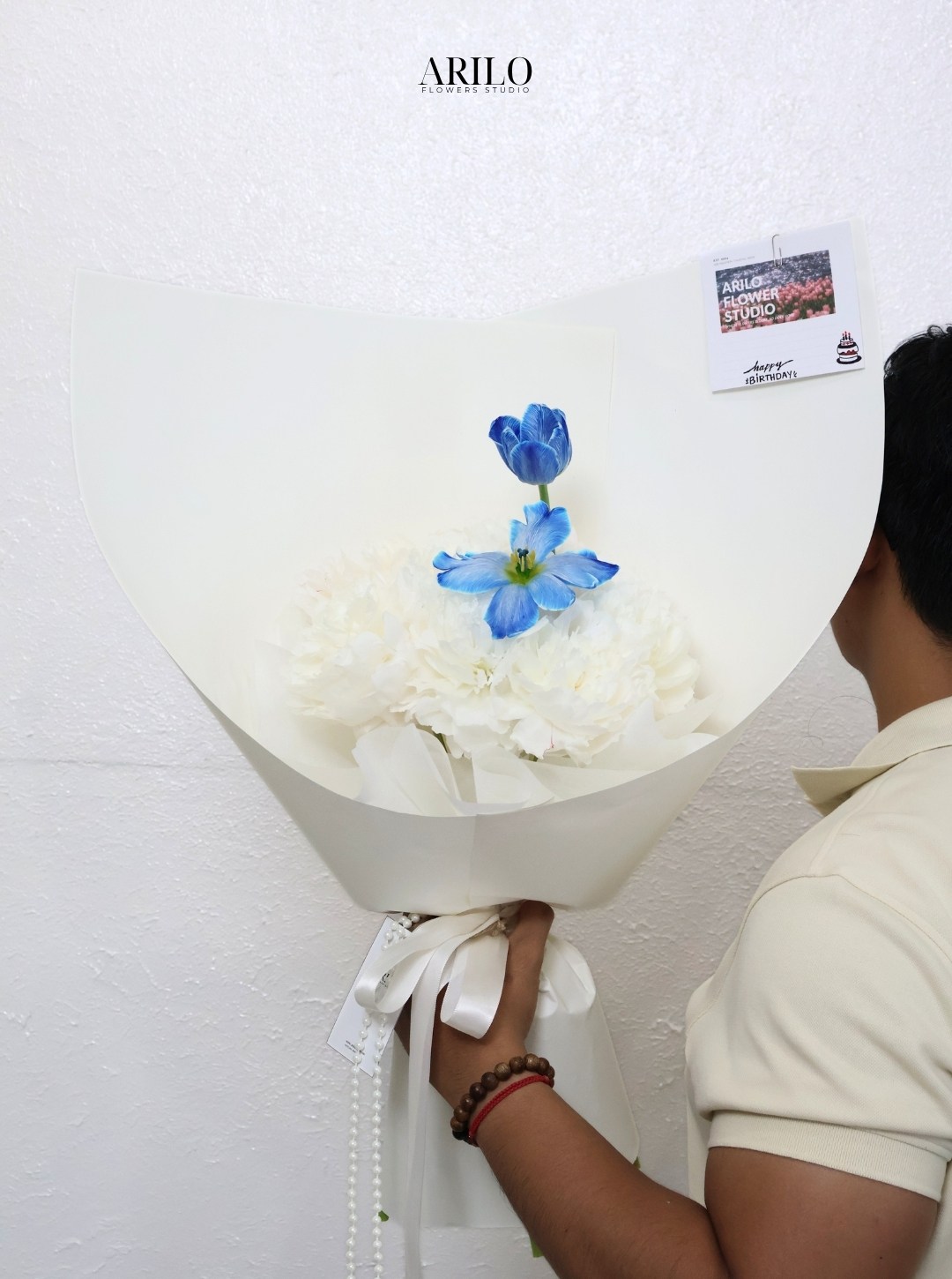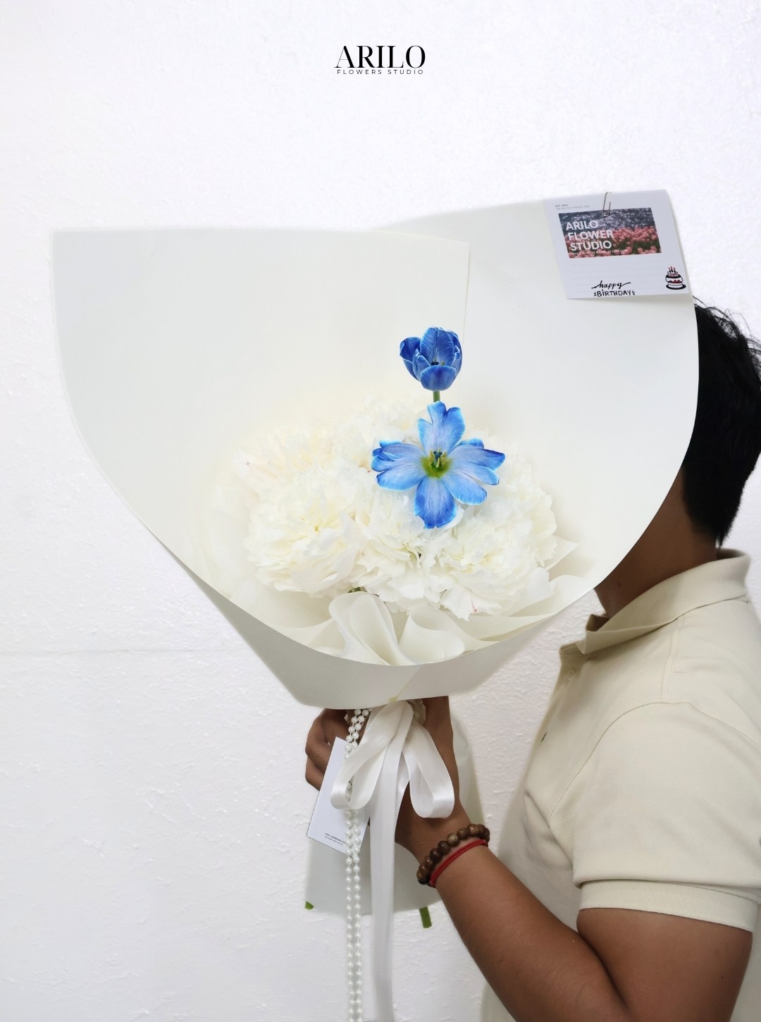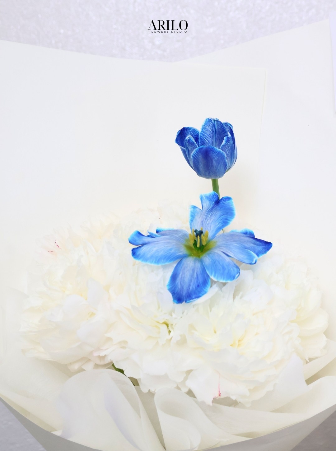 Peony trắng với những cánh hoa mềm mại, xếp lớp dày tạo nên cảm giác đầy đặn và sang trọng. Đây là loài hoa thường gắn liền với sự tinh khôi và những cảm xúc chân thành. Khi kết hợp cùng tulip xanh, bó hoa trở nên đặc biệt hơn. Tulip xanh không phổ biến, chính vì vậy nó tạo nên điểm nhấn khác biệt, giúp tổng thể bó hoa trở nên nổi bật mà vẫn giữ được sự tinh tế.
