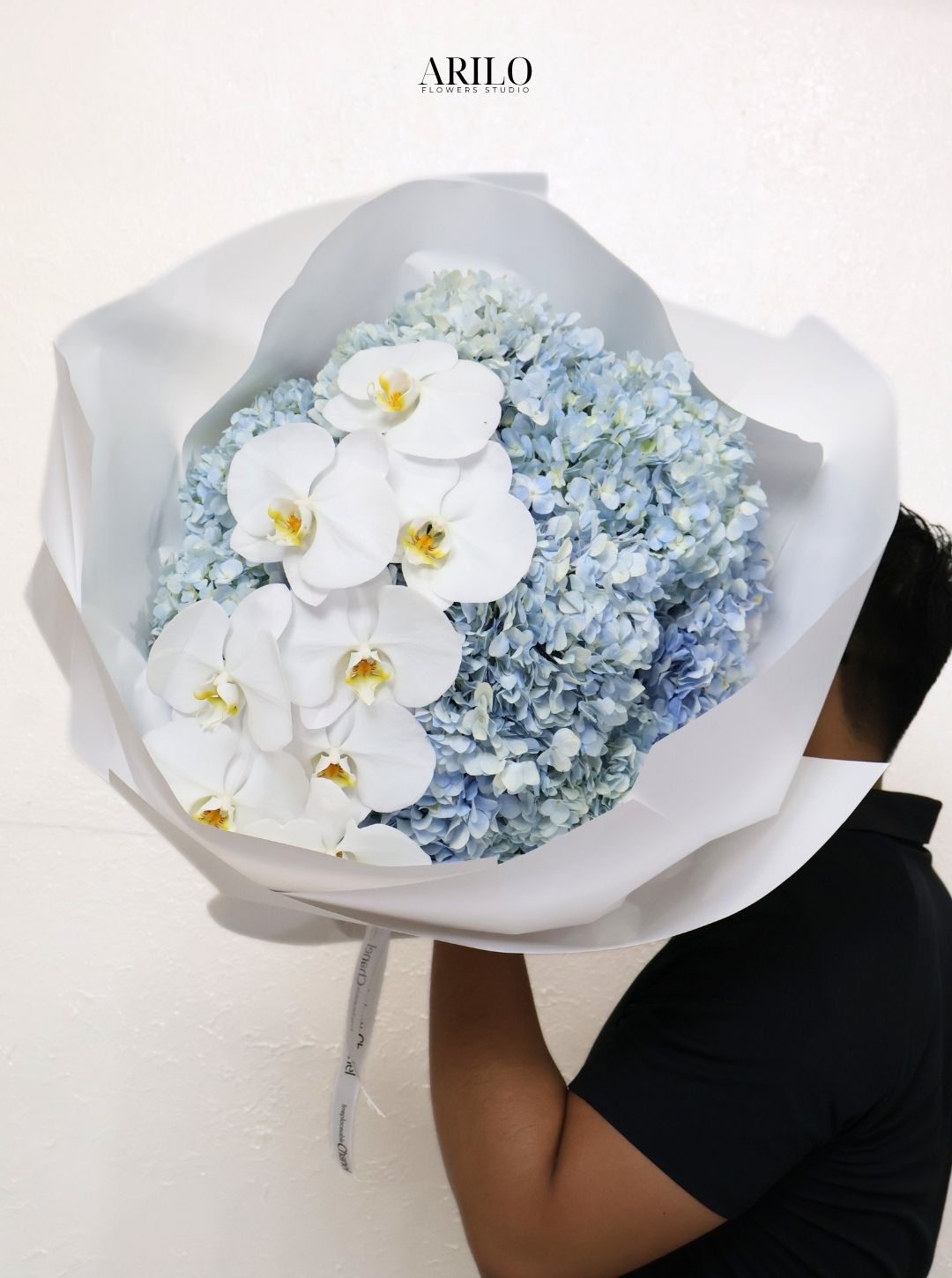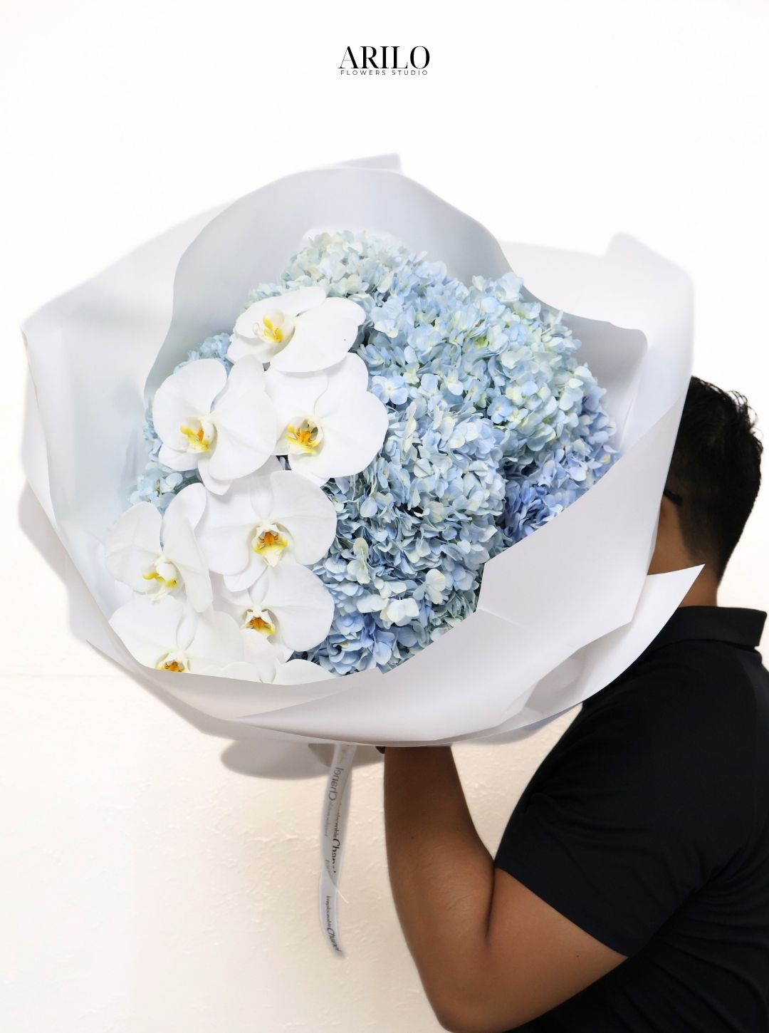 Bó hoa tặng hoa tú cầu mix lan hồ điệp là một thiết kế mang đậm phong cách thanh lịch, phù hợp với những ai yêu thích vẻ đẹp nhẹ nhàng nhưng vẫn muốn tạo ấn tượng. Sự kết hợp giữa hoa tú cầu xanh pastel và lan hồ điệp trắng tạo nên tổng thể hài hòa, mang lại cảm giác dễ chịu và tinh tế ngay từ ánh nhìn đầu tiên.
