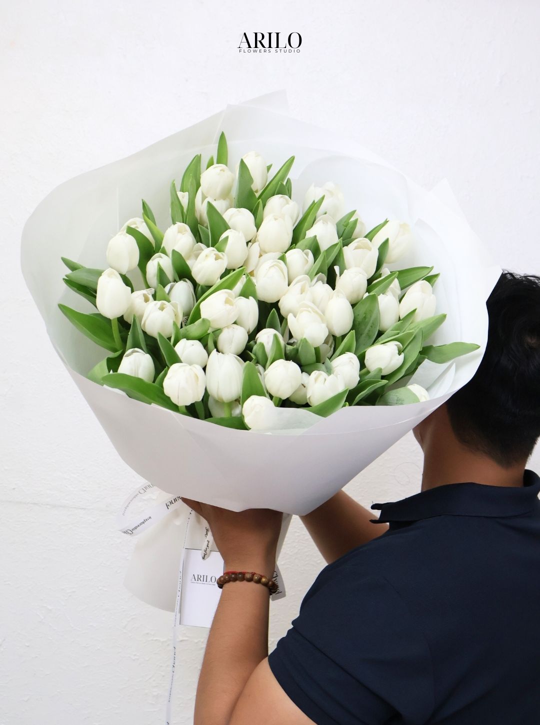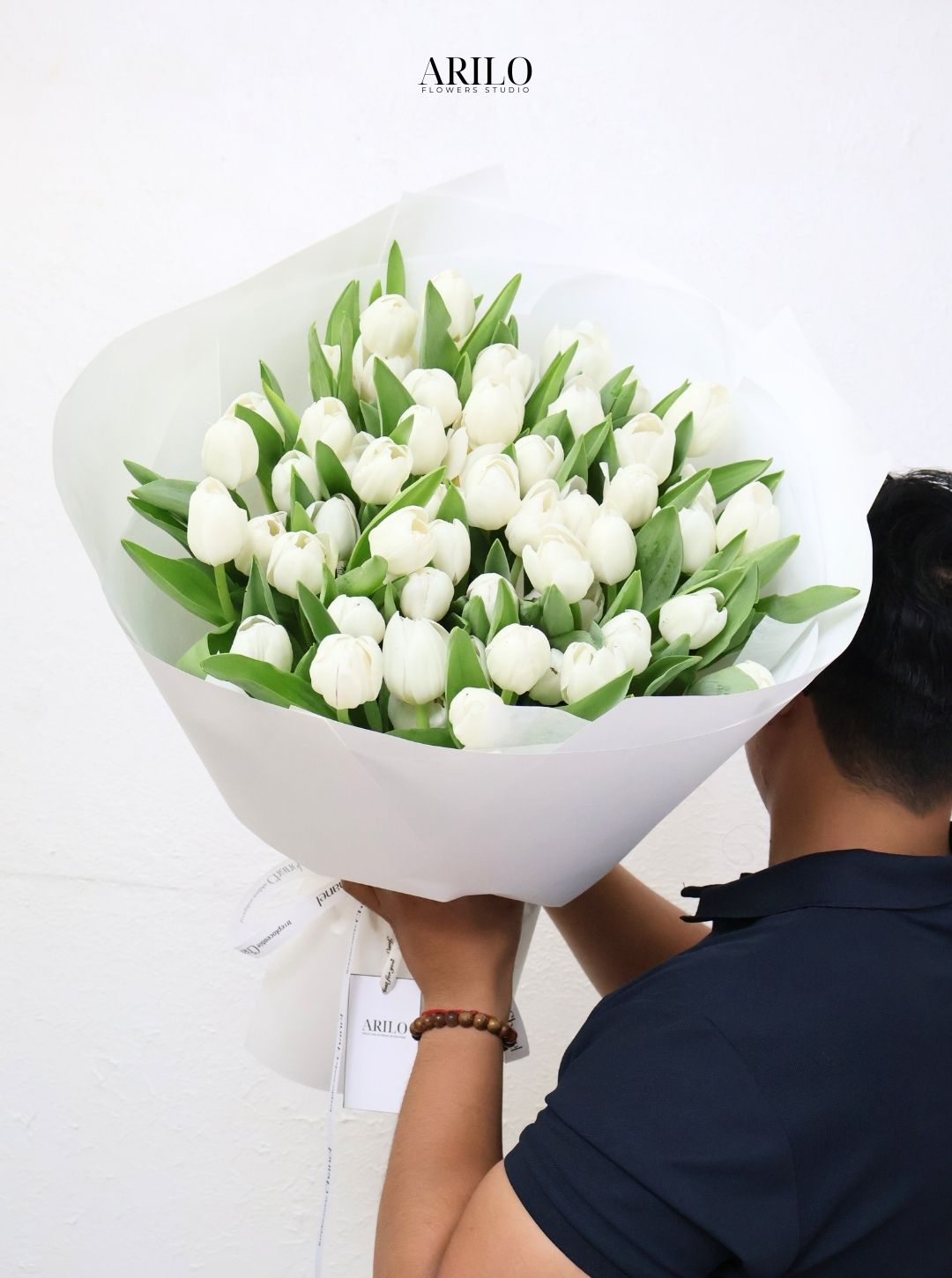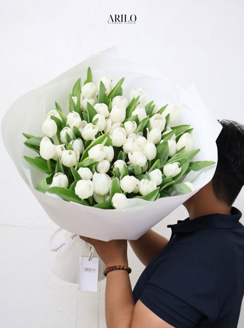 Toàn bộ bó hoa được thiết kế từ những bông tulip trắng nhập khẩu, xếp theo bố cục tròn tự nhiên. Sắc trắng tinh khôi kết hợp cùng lá xanh tạo nên cảm giác tươi mới và nhẹ nhàng. Không quá cầu kỳ, không quá rực rỡ, bó hoa vẫn đủ sức gây ấn tượng nhờ vẻ đẹp thuần khiết.