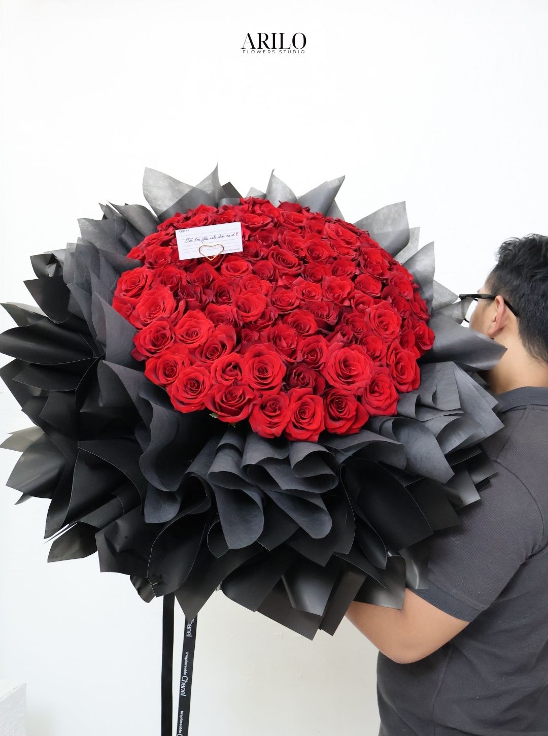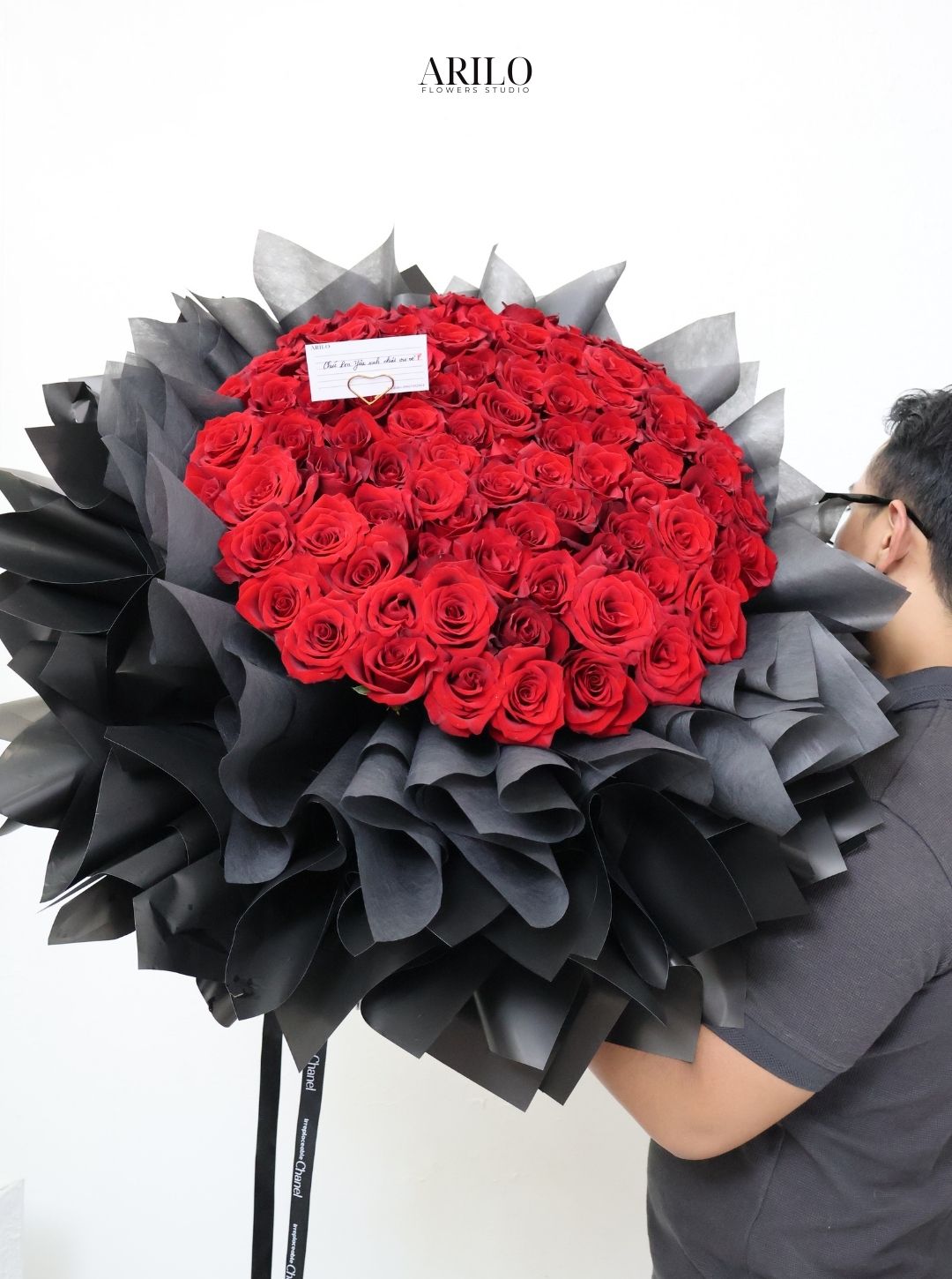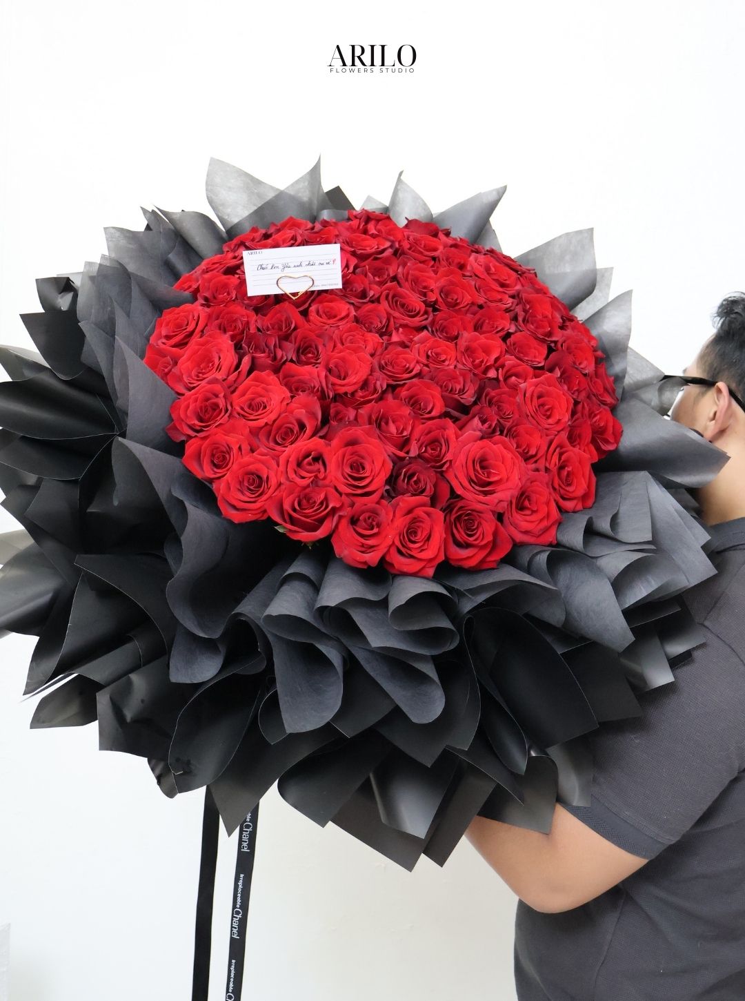 Lớp giấy gói đen được xếp nhiều tầng, tạo độ bung và chiều sâu, như một sân khấu làm nổi bật nhân vật chính là sắc đỏ của hoa hồng. Tổng thể bó hoa mang tinh thần sang trọng, bản lĩnh và rất “đàn ông” trong cách bày tỏ cảm xúc. Đây là bó hoa dành cho những ai đã sẵn sàng nói lời yêu mà không cần thử dò.