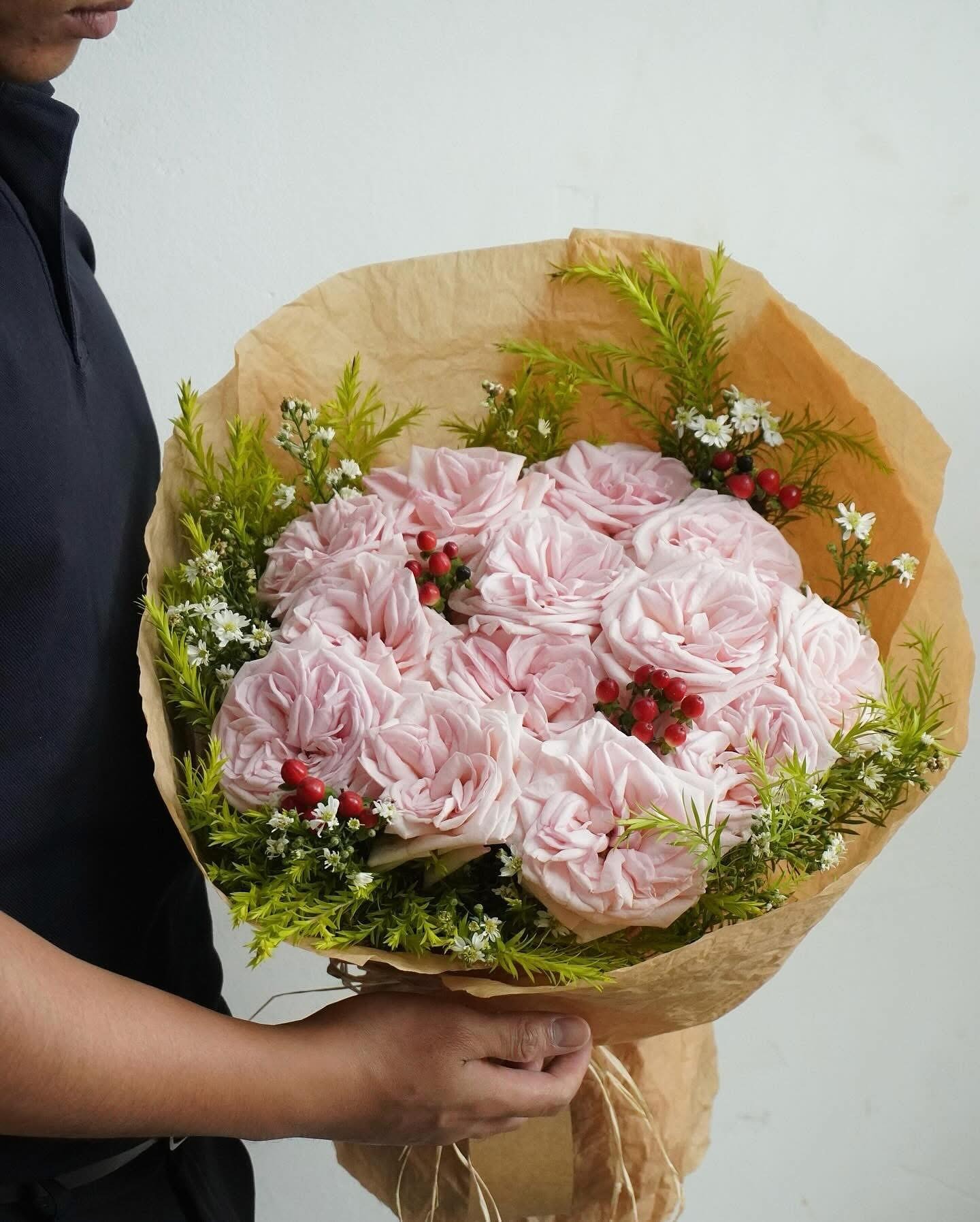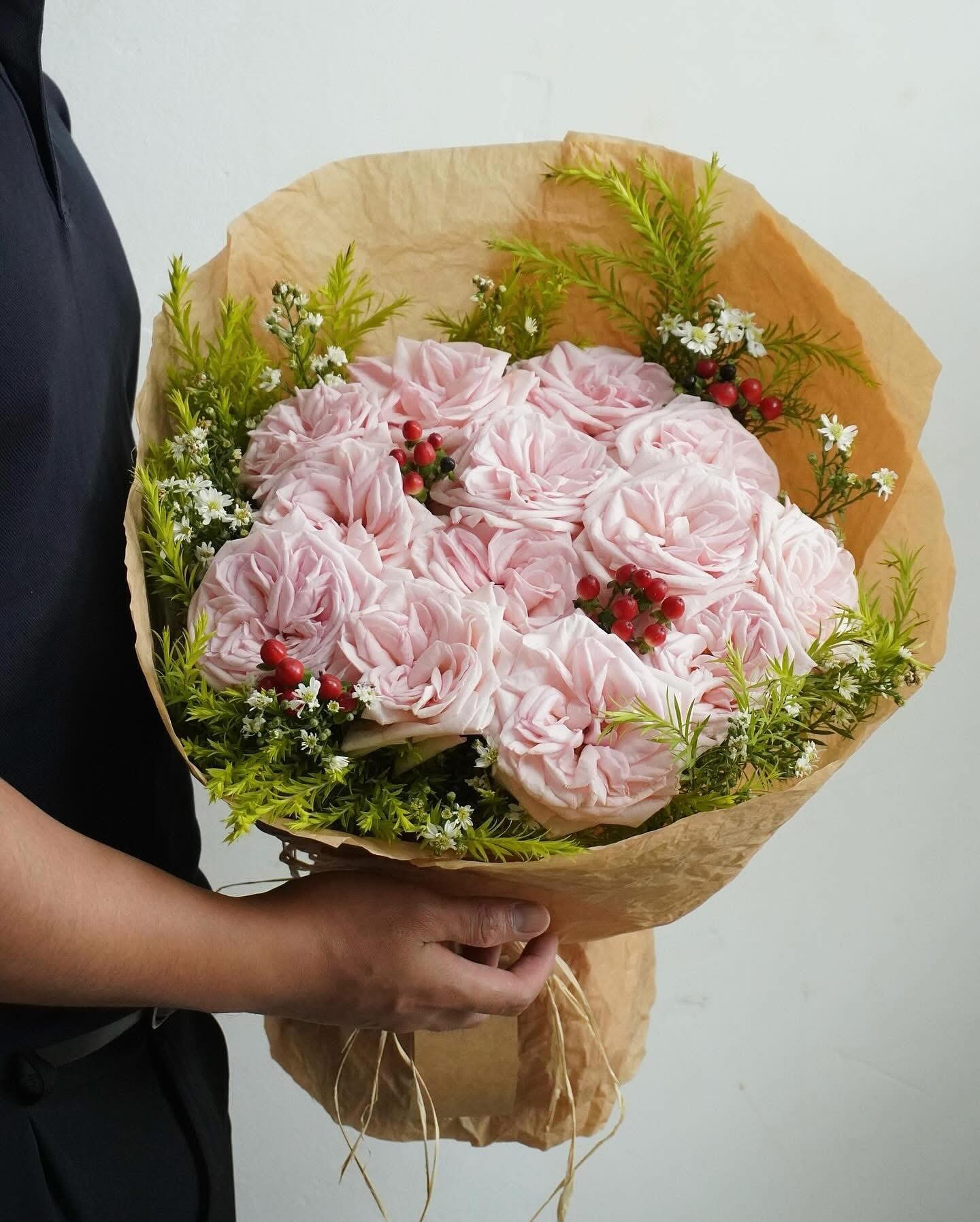 Hoa hồng pastel được bó full mặt tròn nhưng không quá khít, giữ được độ mềm tự nhiên của từng cánh hoa. Xen kẽ là lá xanh và những chùm berry đỏ nhỏ tạo điểm nhấn sinh động. Tổng thể mang tinh thần garden sang trọng, vừa mộc mạc vừa tinh tế.