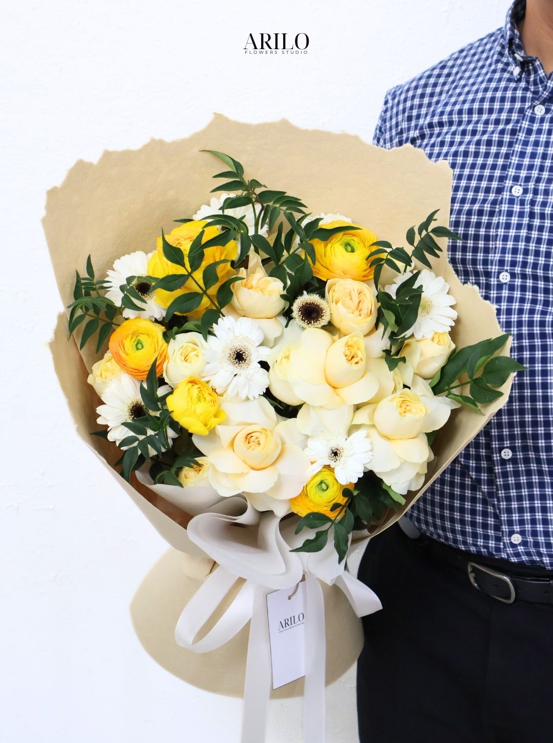 Tại shop hoa tươi Sài Gòn Arilo Flower Studio, mỗi bó hoa được thiết kế dựa trên sự cân bằng giữa thẩm mỹ và cảm xúc. Arilo tuyển chọn mao lương vàng, đồng tiền trắng, hồng vàng Victor và lá jasmin tươi mới mỗi ngày, đảm bảo chất lượng và độ bền cao.