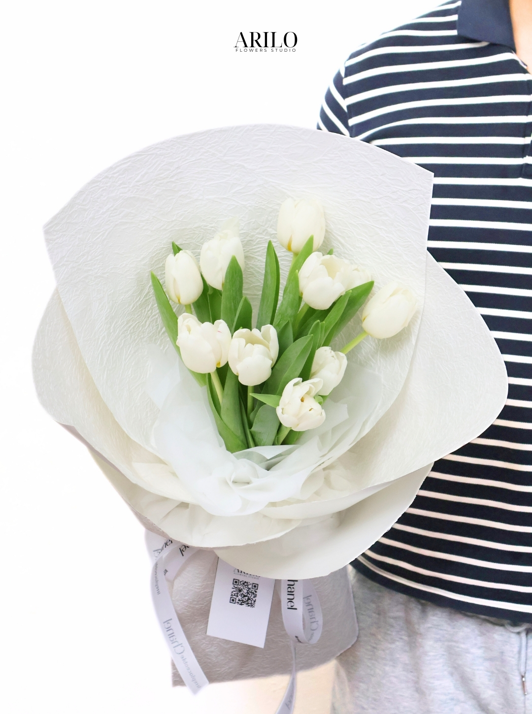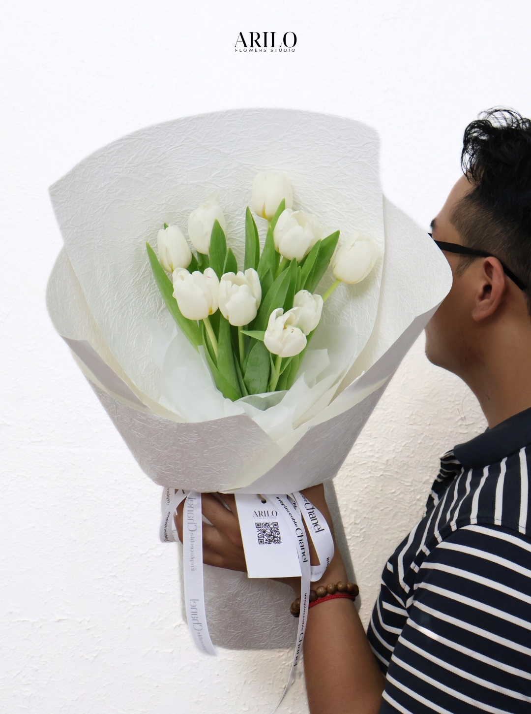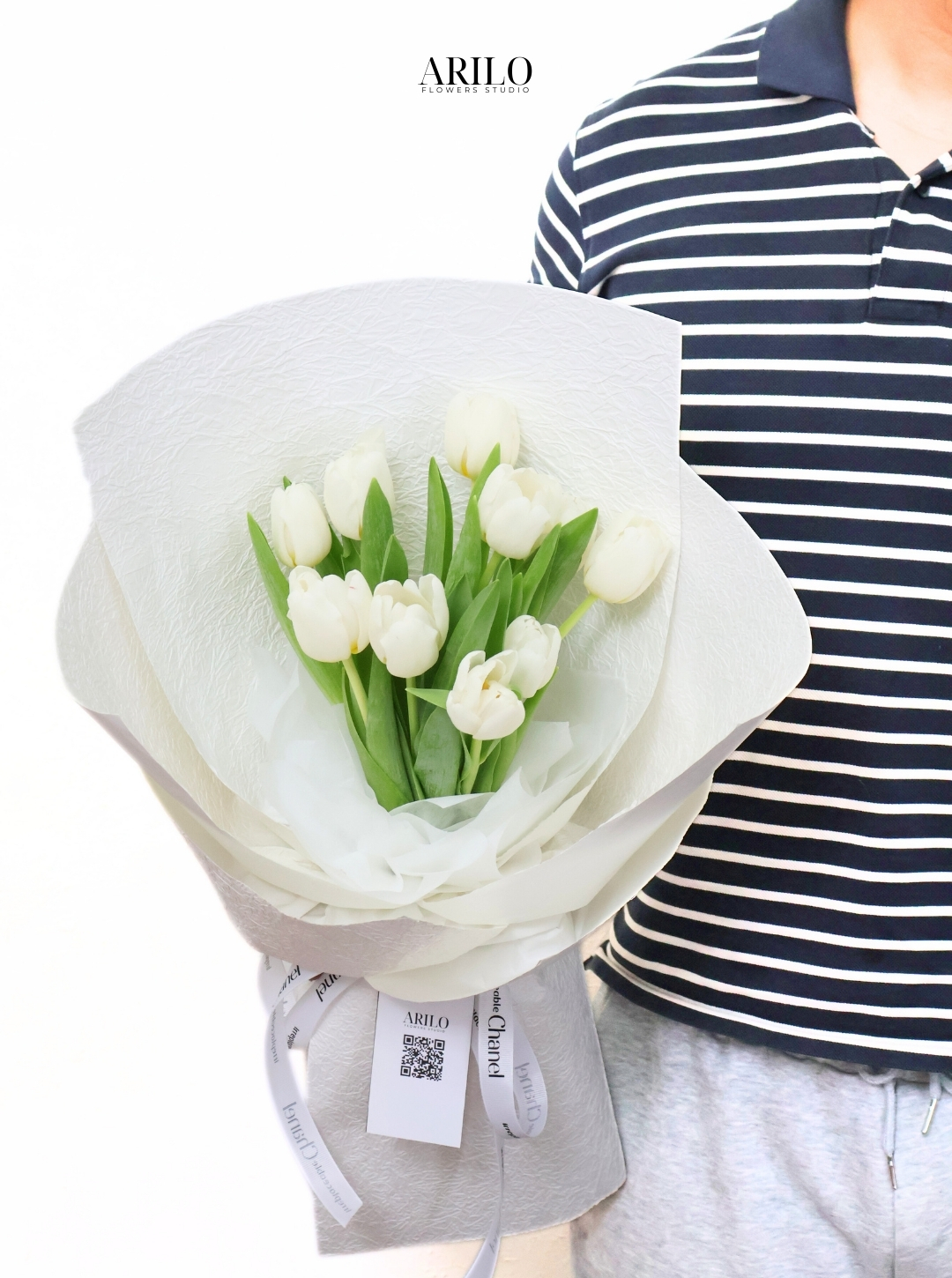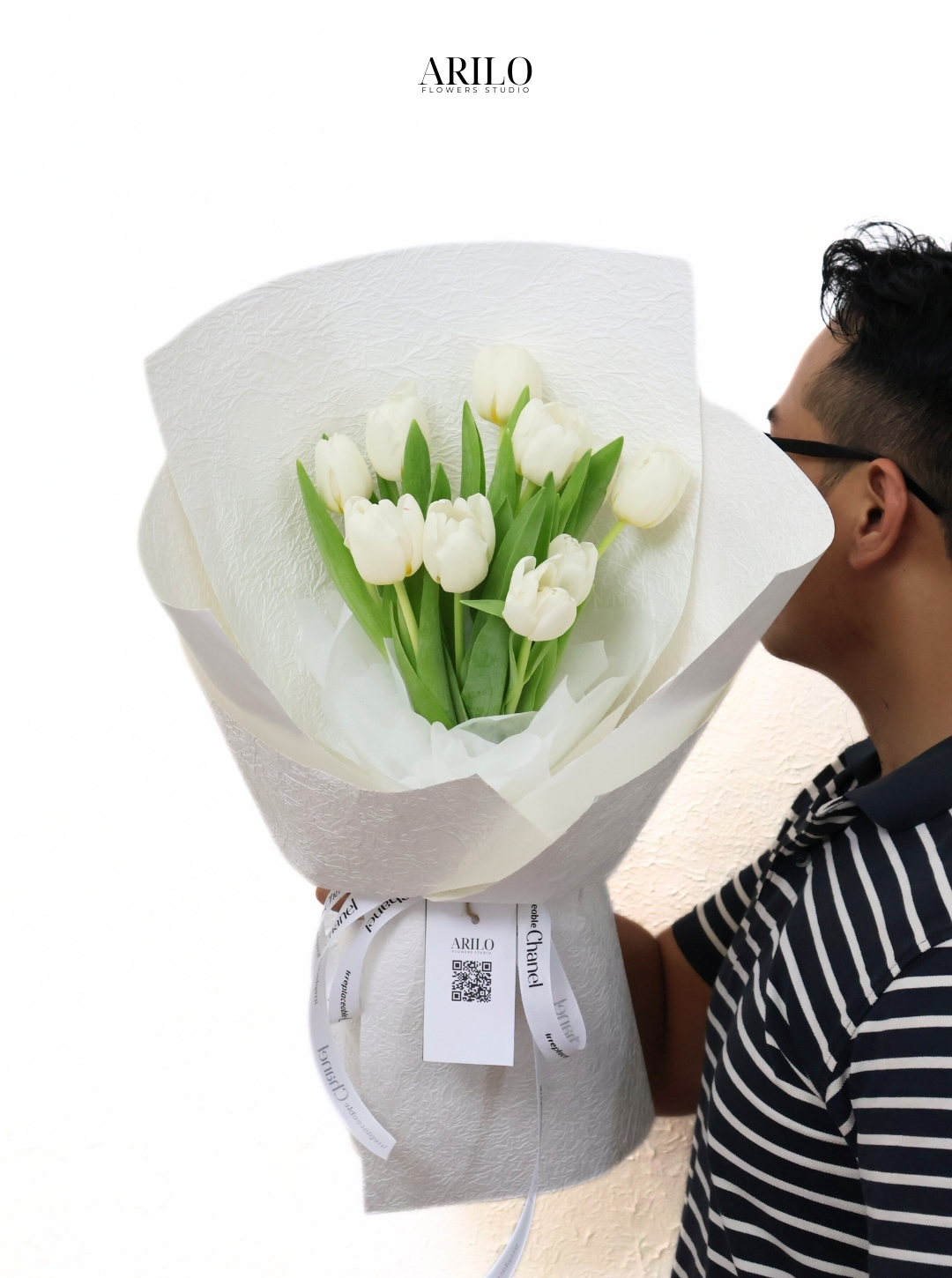 Chính vì vẻ đẹp đó mà tulip thường được chọn cho những bó hoa mang cảm xúc tinh tế. Không cần quá nhiều bông, chỉ cần sắp xếp đúng cách là đã đủ tạo nên một bó hoa rất đẹp. Mẫu hoa này được thiết kế theo phong cách tối giản. Một vài cành tulip trắng được đặt ở trung tâm, xung quanh là lớp giấy gói trắng mềm mại. Tổng thể bó hoa mang lại cảm giác nhẹ nhàng, giống như một lời tỏ tình được nói ra bằng sự chân thành.