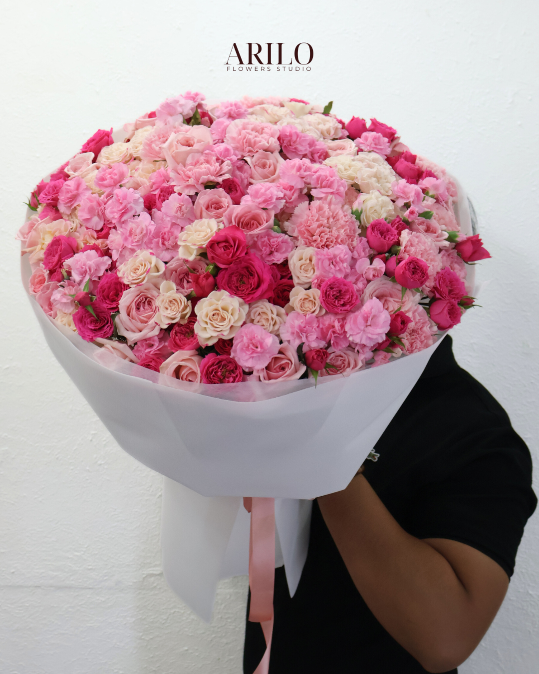 Bó hoa hồng tone hồng mix này được tạo nên từ những bông hồng Sofia, hồng chiết xạ, hồng Pinkloyd, điểm xuyết cùng cẩm chướng đơn và cẩm chướng kép, giống như một khu vườn đang thì thầm câu chuyện của sự dịu dàng và lòng biết ơn. Mỗi giống hoa mang một nét tính cách riêng: Sofia mềm mại như hơi thở đầu ngày, Pinkloyd rực rỡ đầy tự tin, chiết xạ thì ánh lên sắc hồng trong trẻo, còn cẩm chướng đơn và kép lại góp thêm tầng cảm xúc, khiến bó hoa trở nên giàu chiều sâu và không bao giờ nhàm chán khi ngắm nhìn.