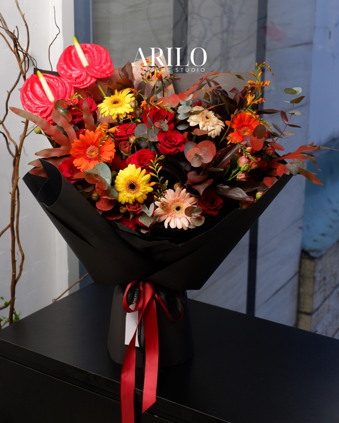 Giấy gói đen tuyền giúp tôn toàn bộ màu sắc phía trong. Dải ruy băng đỏ mềm mại tạo điểm nhấn vừa đủ, khiến bó hoa trở nên sang trọng và cá tính.