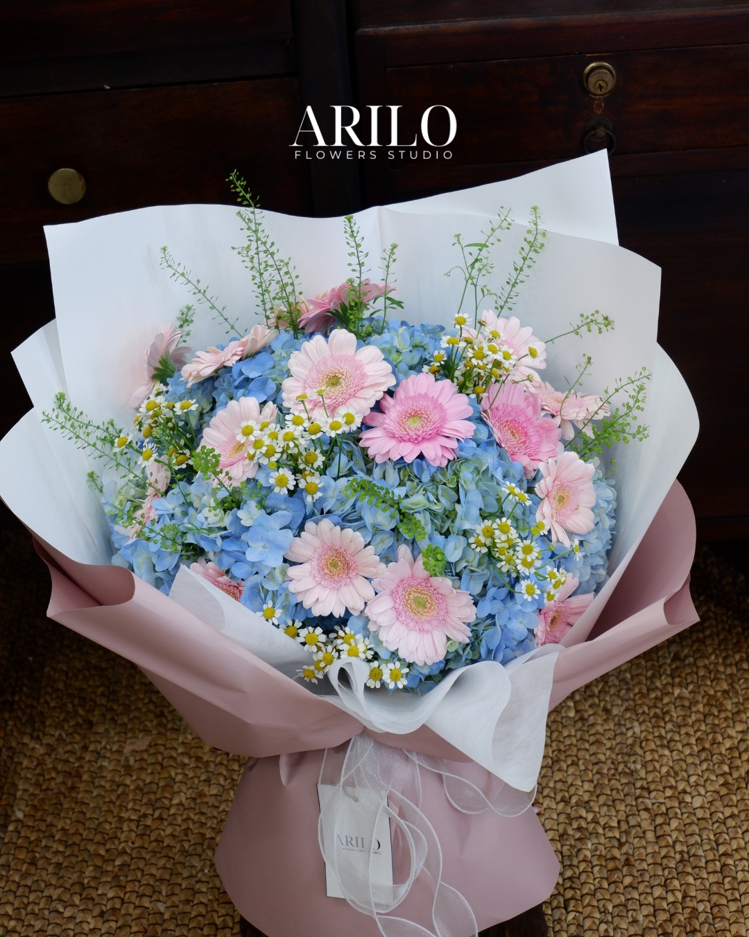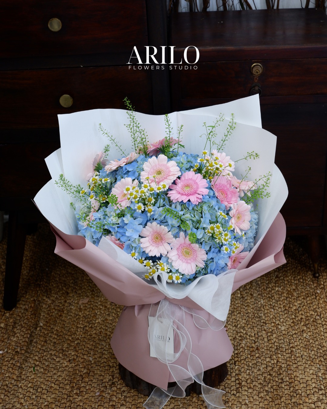 Thành phần hoa được lựa chọn kỹ lưỡng gồm hoa cẩm tú cầu xanh, hoa đồng tiền hồng, hoa cúc tana (cúc họa mi nhí) và lá phụ xanh trang trí. Cẩm tú cầu đại diện cho sự thấu hiểu và gắn bó, đồng tiền hồng mang ý nghĩa yêu thương và niềm vui, cúc tana nhỏ xinh gợi sự thuần khiết và bền bỉ. Tất cả kết hợp hài hòa, tạo nên một bó hoa vừa hiện đại vừa giàu cảm xúc.