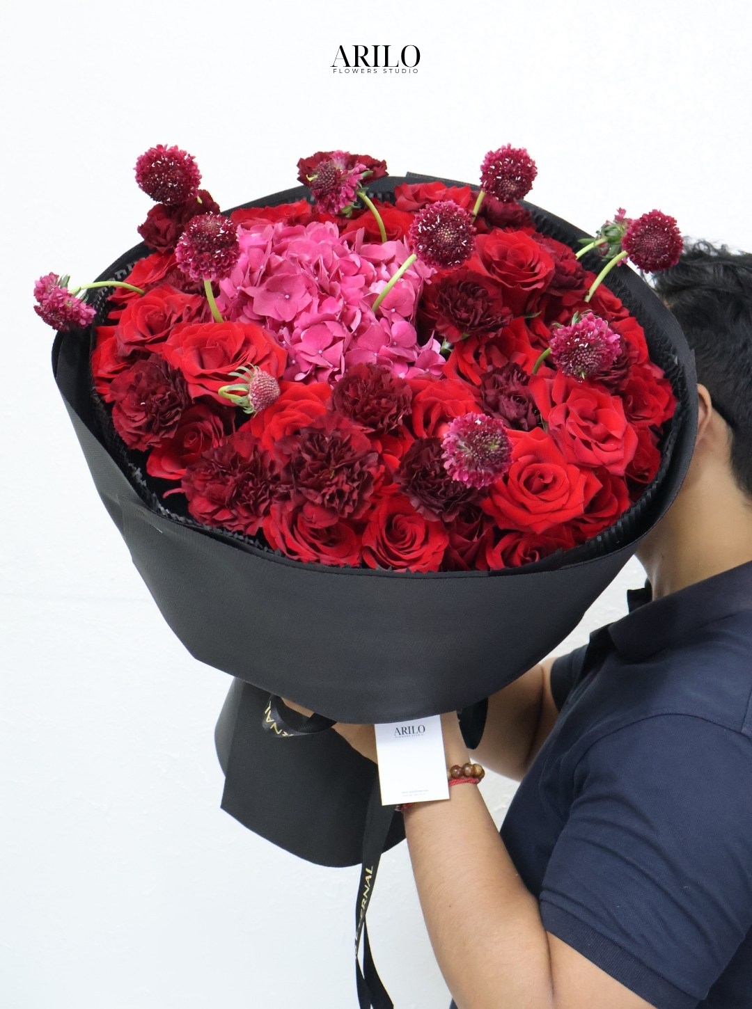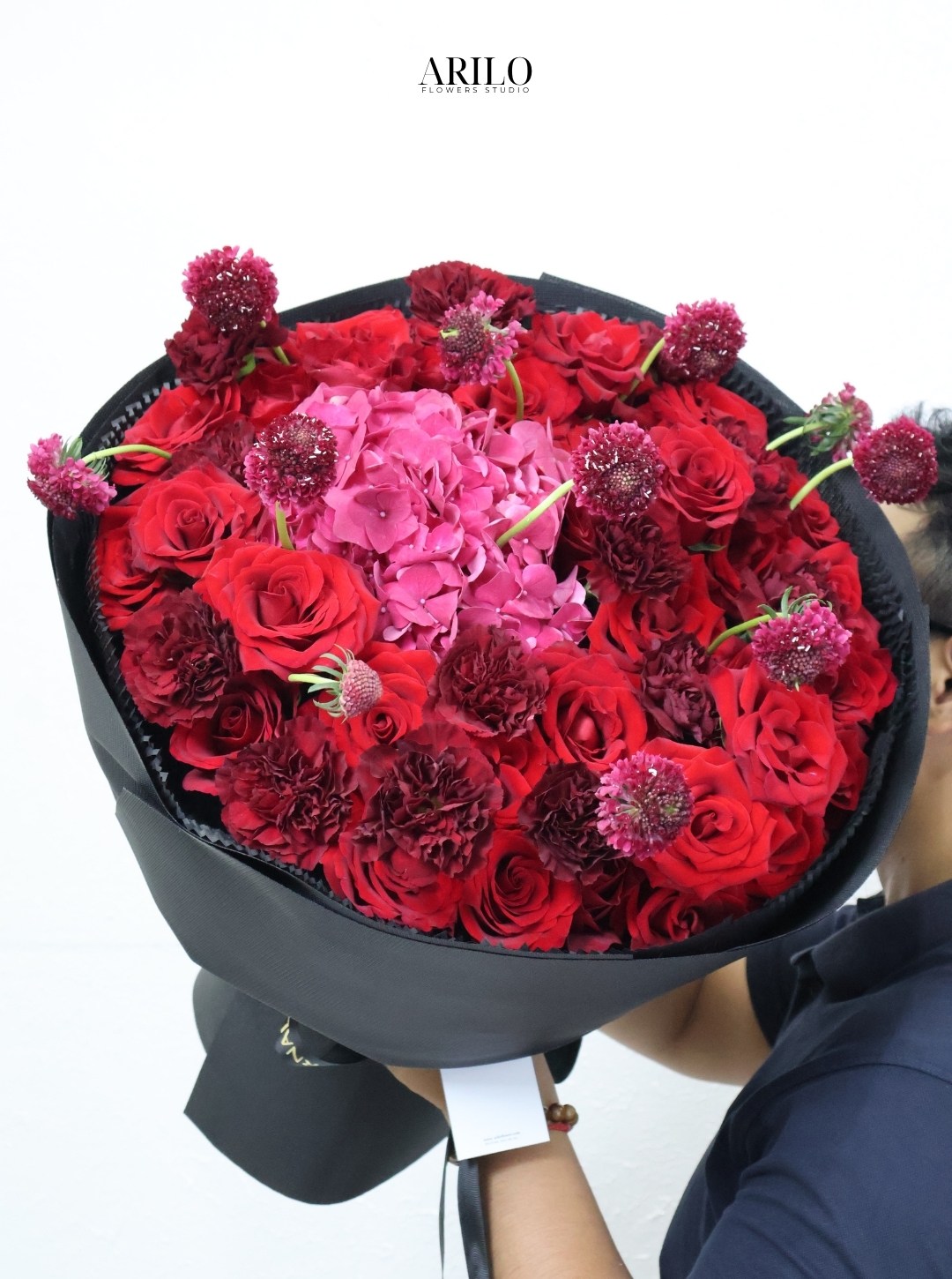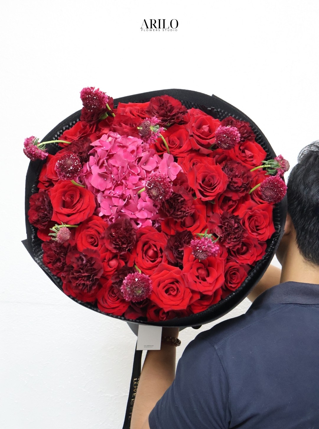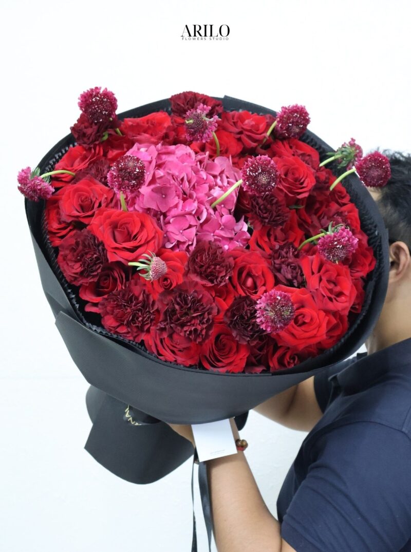 Bó hoa được xây dựng với nền tảng là hoa hồng đỏ – loài hoa đã trở thành biểu tượng của tình yêu qua nhiều thế hệ. Những bông hoa được sắp xếp dày, tạo nên cảm giác đầy đặn và sang trọng. Ở trung tâm là tú cầu hồng, với cấu trúc đặc trưng gồm nhiều cánh hoa nhỏ kết lại, mang đến sự mềm mại và cân bằng cho tổng thể.