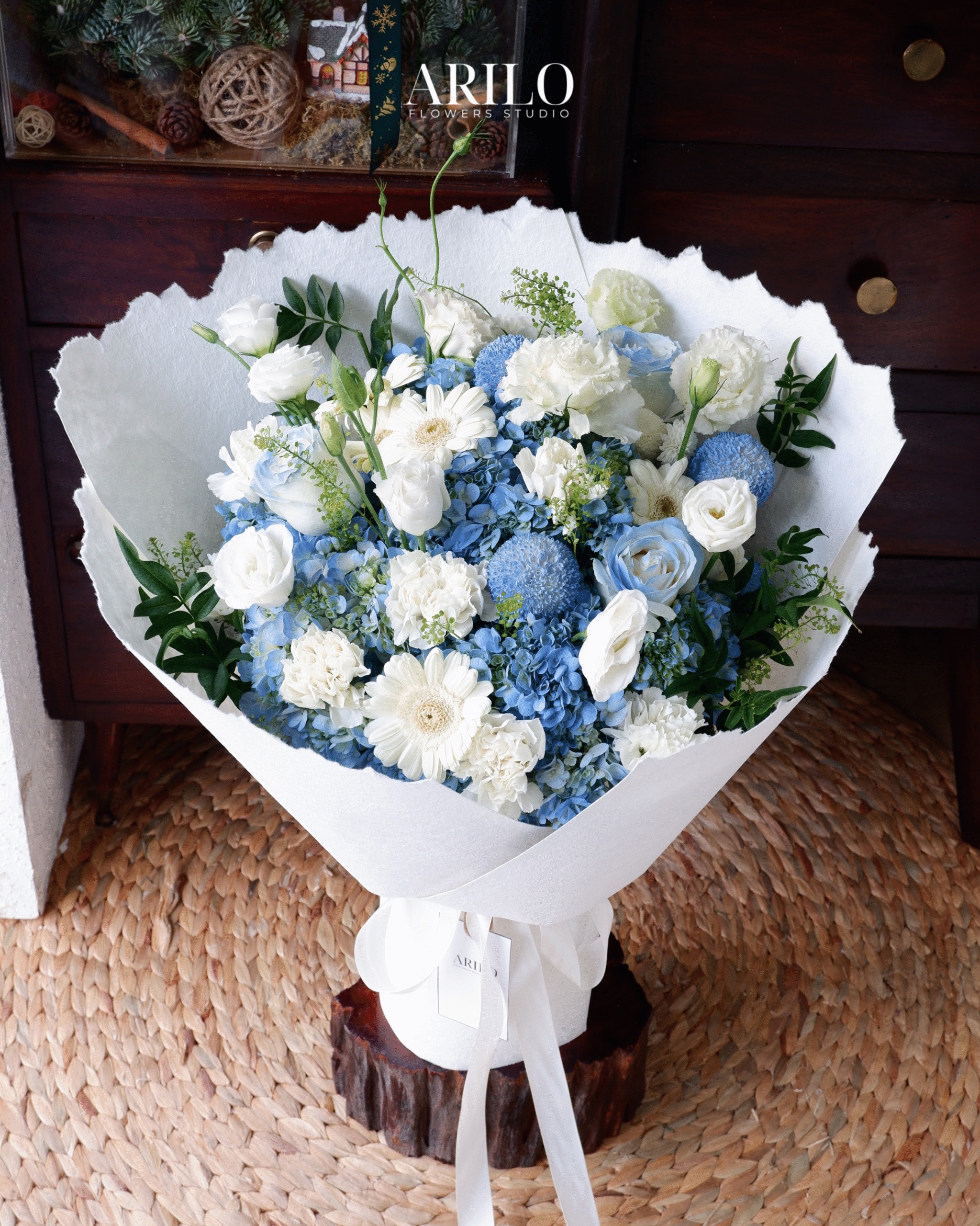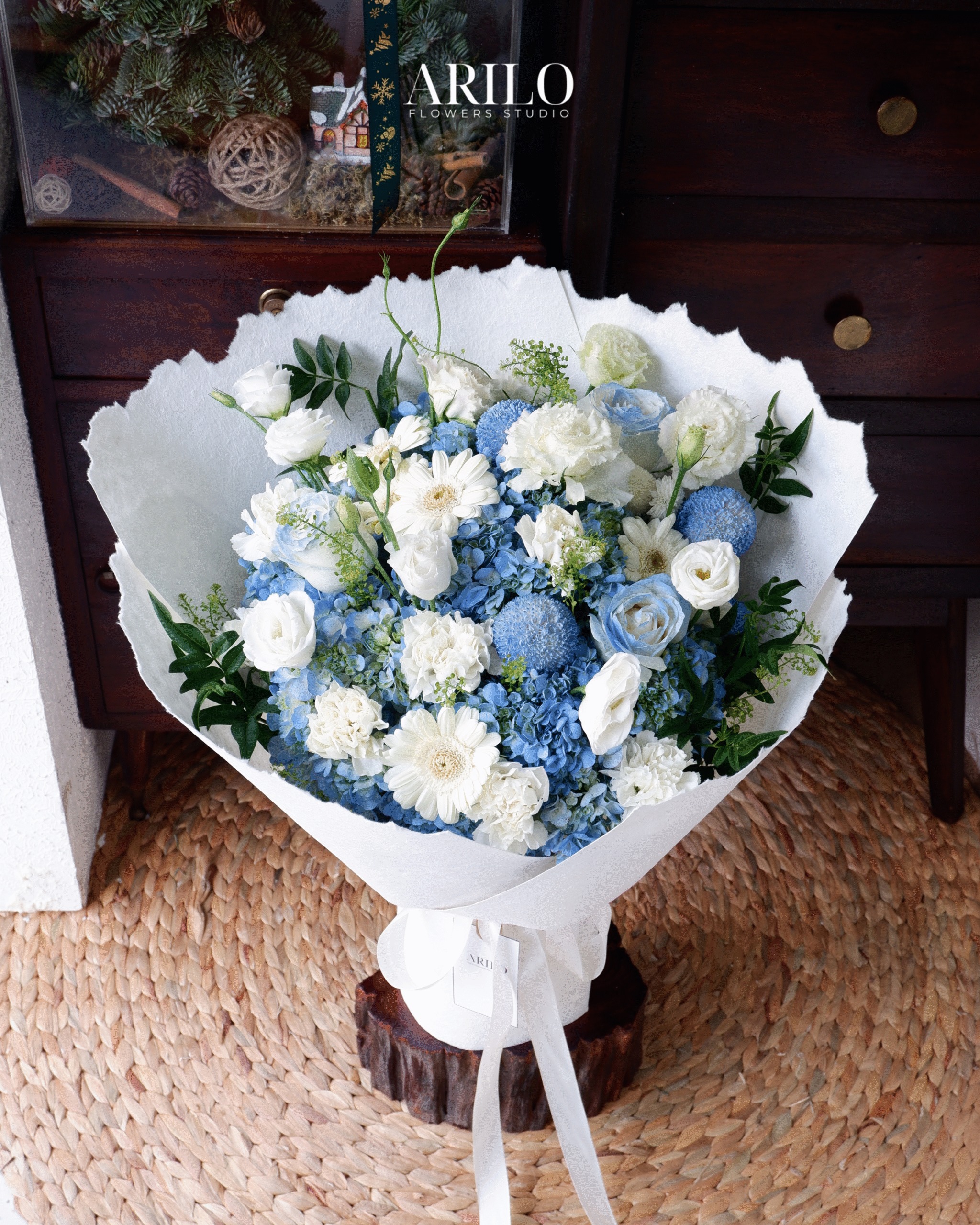 Bó hoa được gói bằng lớp giấy trắng tinh giản, tôn lên sắc hoa xanh – trắng, mang lại cảm giác thanh lịch và sang trọng. Cách bó chú trọng vào độ tròn đầy, các lớp hoa được xếp xen kẽ để tạo chiều sâu thị giác, giúp bó hoa nhìn càng lâu càng thấy cuốn hút.