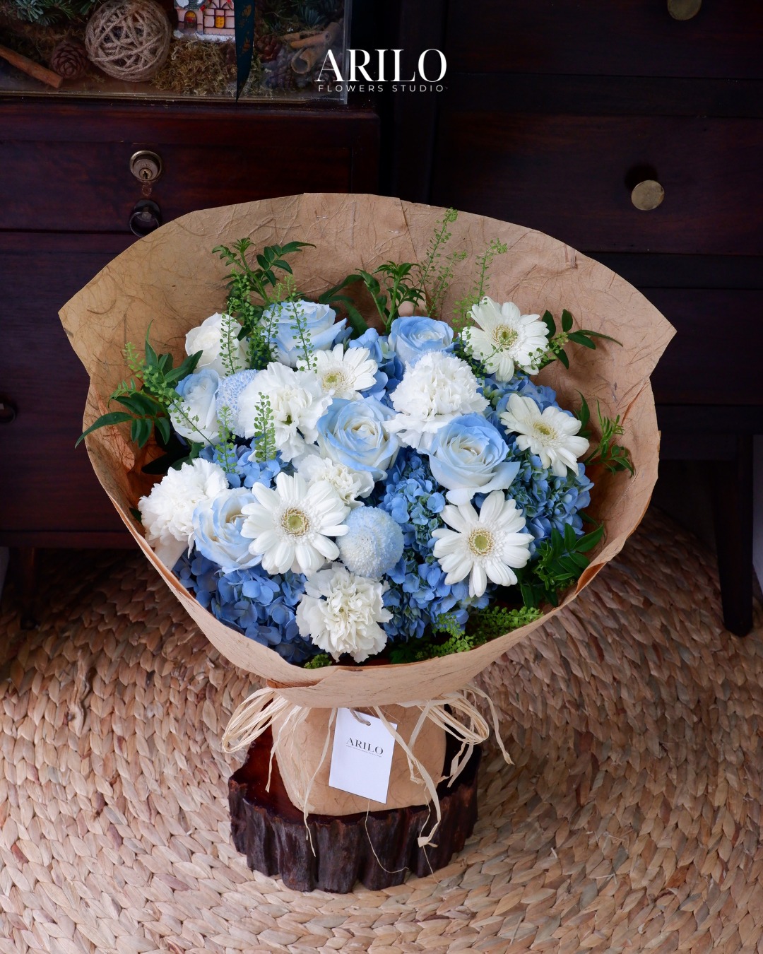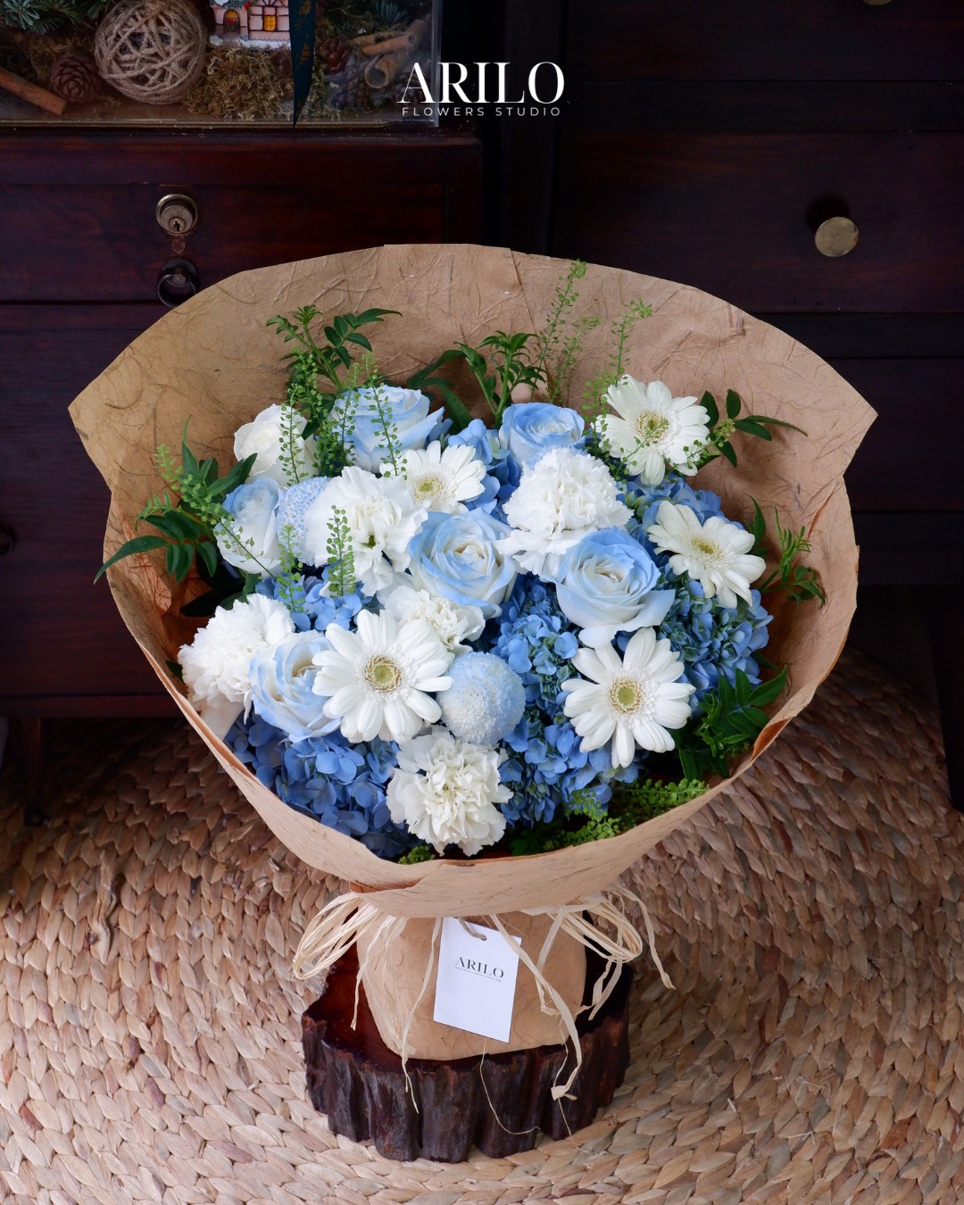 Cách sắp xếp hoa chú trọng vào bố cục tròn đầy, lớp hoa được xếp xen kẽ khéo léo để không loài nào lấn át loài nào. Lớp giấy gói kraft nâu mang hơi hướng mộc mạc, giúp tôn lên sắc hoa xanh – trắng, đồng thời tạo cảm giác gần gũi nhưng vẫn rất sang.