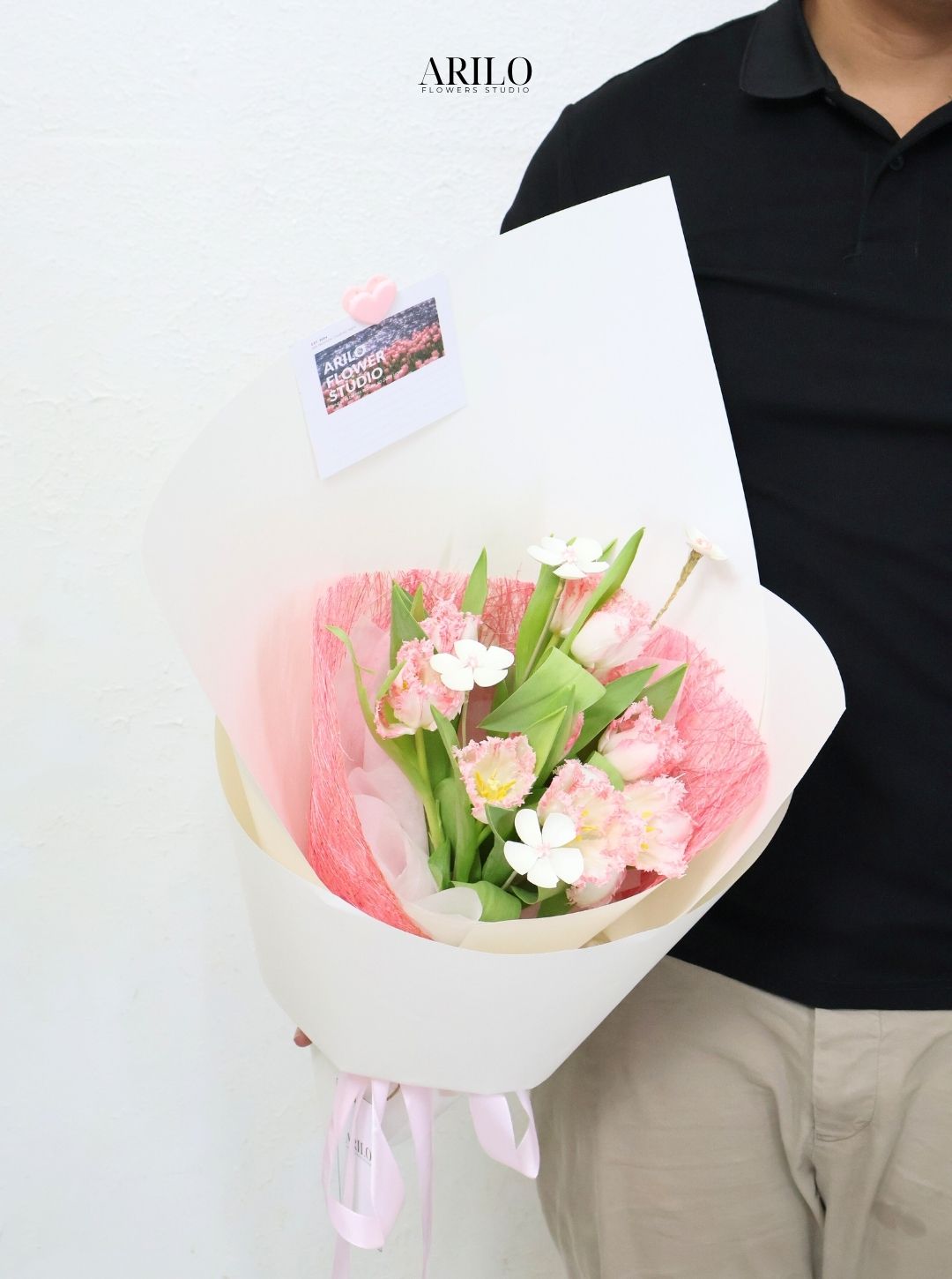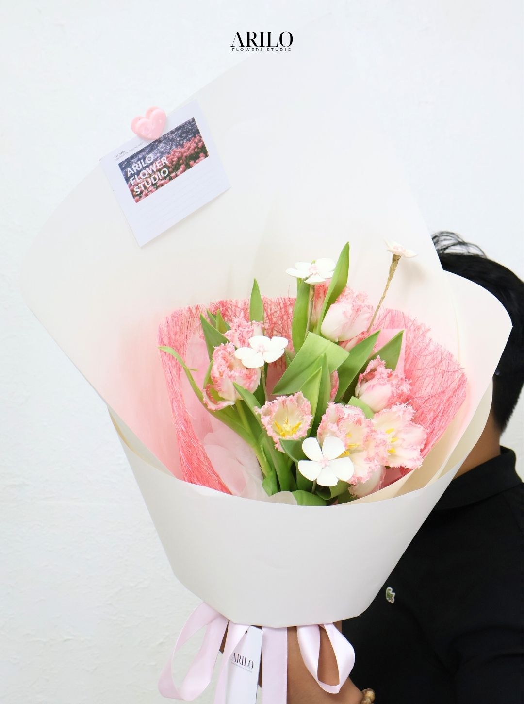 Bó hoa trong hình mang một phong cách rất riêng, không quá rực rỡ nhưng vẫn đủ để gây ấn tượng ngay từ ánh nhìn đầu tiên. Sự kết hợp giữa tulip trắng viền hồng và những bông tulip cánh xoăn tạo nên chiều sâu cho tổng thể, khiến bó hoa không bị đơn điệu. Đây là kiểu thiết kế hướng đến sự tinh tế, phù hợp với những người yêu cái đẹp nhẹ nhàng nhưng vẫn muốn tạo dấu ấn.