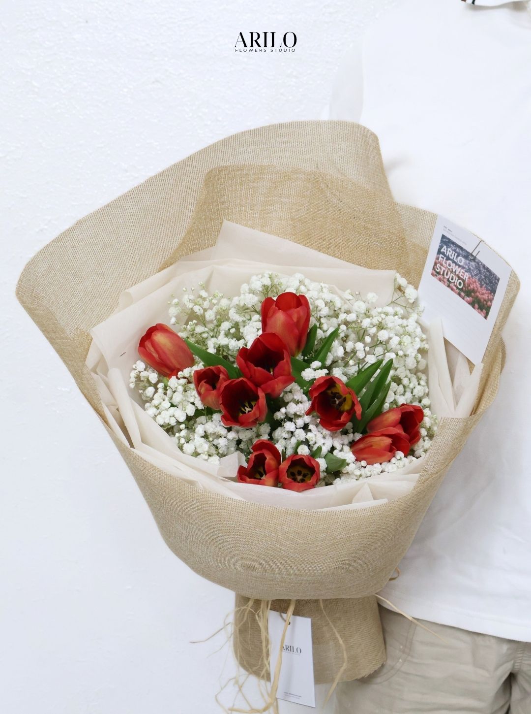 Tulip đỏ với sắc màu nổi bật luôn thu hút ánh nhìn ngay từ lần đầu tiên. Những bông hoa được sắp xếp xen kẽ cùng baby trắng, tạo nên một tổng thể hài hòa và dễ chịu. Baby trắng đóng vai trò như một lớp nền mềm mại, giúp làm nổi bật vẻ đẹp của tulip đỏ mà không làm tổng thể trở nên quá rực rỡ.