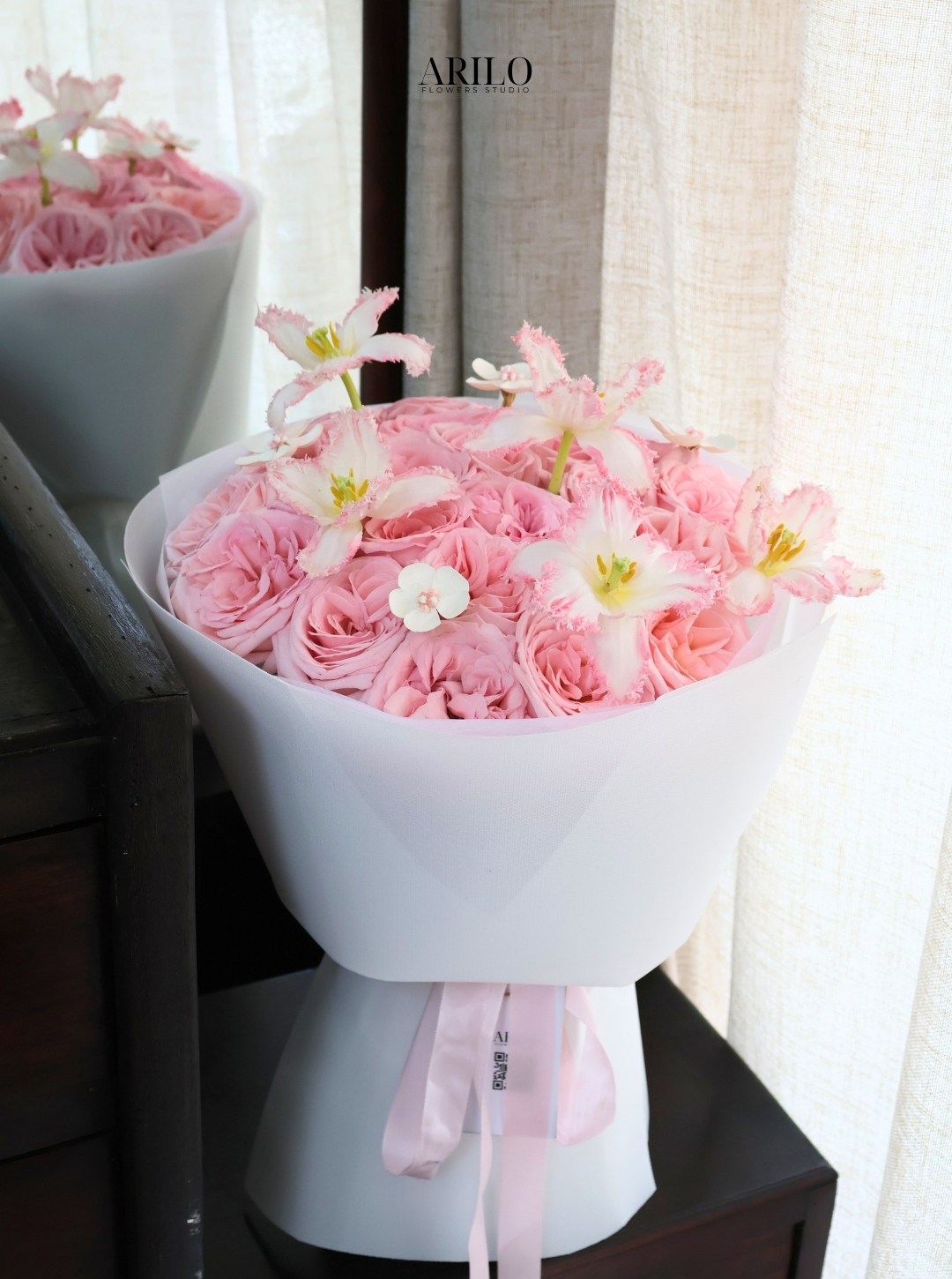Điểm đặc biệt của bó hoa nằm ở cách sắp xếp dày nhưng vẫn giữ được độ thoáng. Các bông hoa được đặt sát nhau, tạo nên hiệu ứng bồng bềnh như một khối mây hồng. Xen kẽ giữa các bông hoa là những chi tiết nhỏ như hoa phụ trắng, giúp tăng thêm chiều sâu và sự sinh động. Lớp giấy gói được xử lý mềm mại, ôm trọn bó hoa mà không làm mất đi vẻ tự nhiên. Phần nơ buộc nhẹ nhàng phía dưới tạo điểm nhấn tinh tế. Tất cả những yếu tố này kết hợp lại tạo nên một thiết kế hài hòa, vừa hiện đại vừa giữ được nét truyền thống.