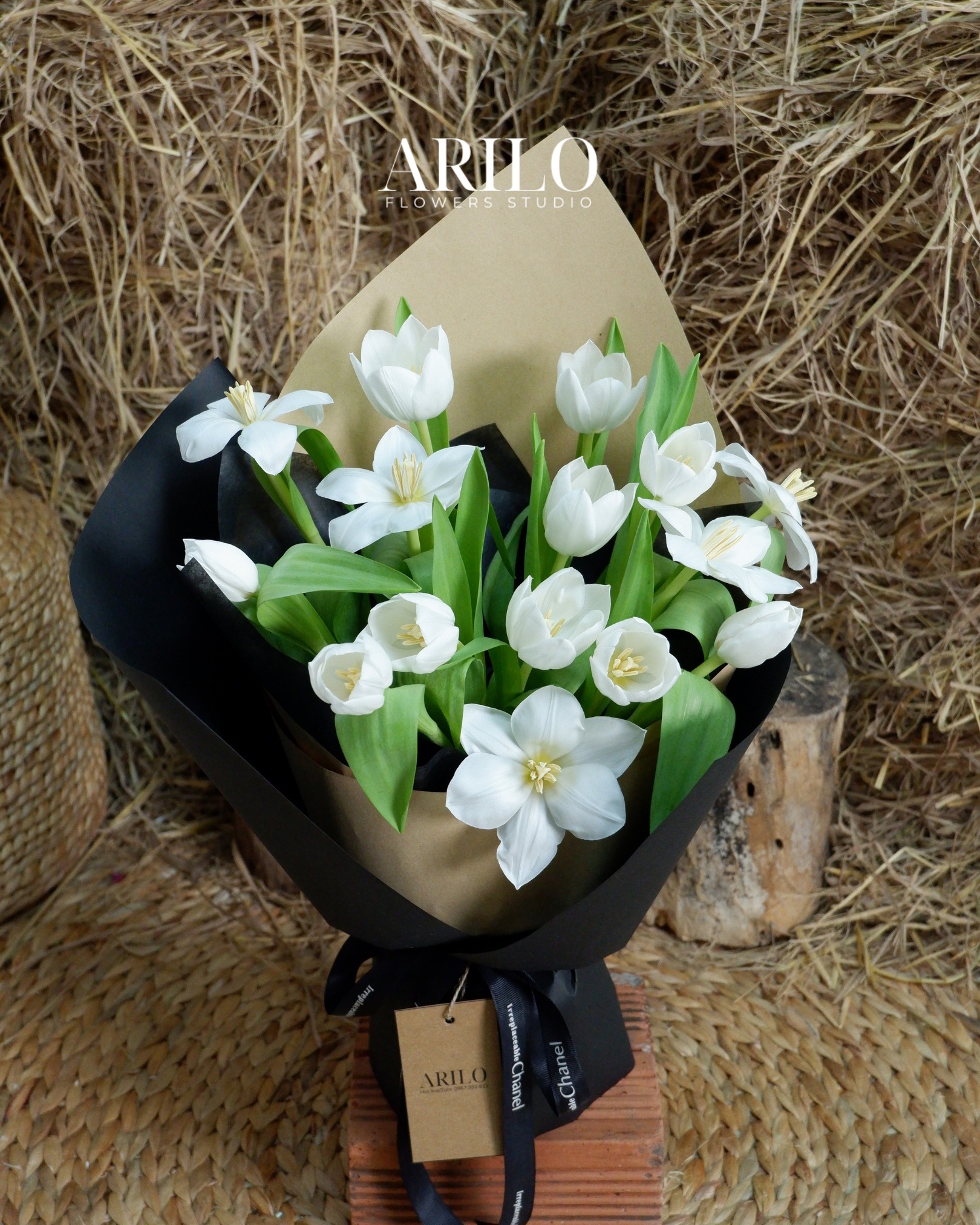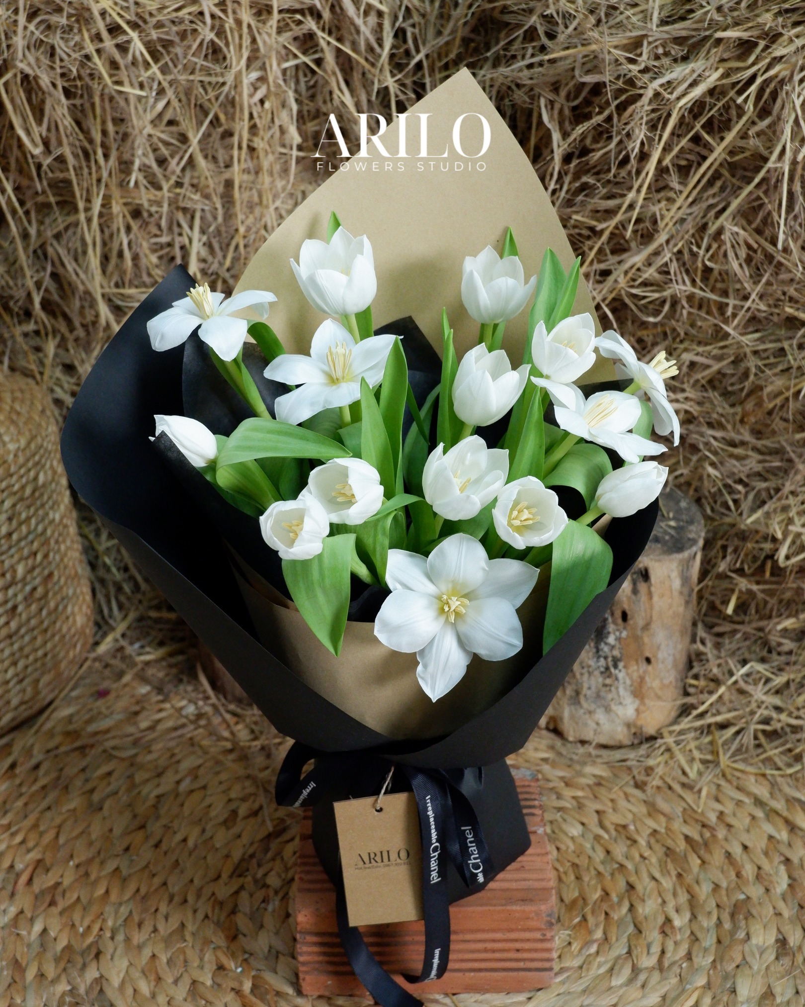 Bó hoa trong bức ảnh là sự kết hợp tinh tế của 20 bông hoa tulip trắng, được gói trong lớp giấy kraft và đen sang trọng, tạo nên cảm giác mộc mạc nhưng vẫn rất thanh lịch. Hoa tulip trắng tượng trưng cho sự thuần khiết, chân thành và một tình yêu đến từ sự thấu hiểu. Điểm đặc biệt nằm ở con số 20 – trong ngôn ngữ loài hoa, 20 bông tulip mang ý nghĩa “tình cảm chân thành, trọn vẹn và lời hứa gắn bó lâu dài”, như một cách nói dịu dàng rằng: anh chọn em, không do dự.