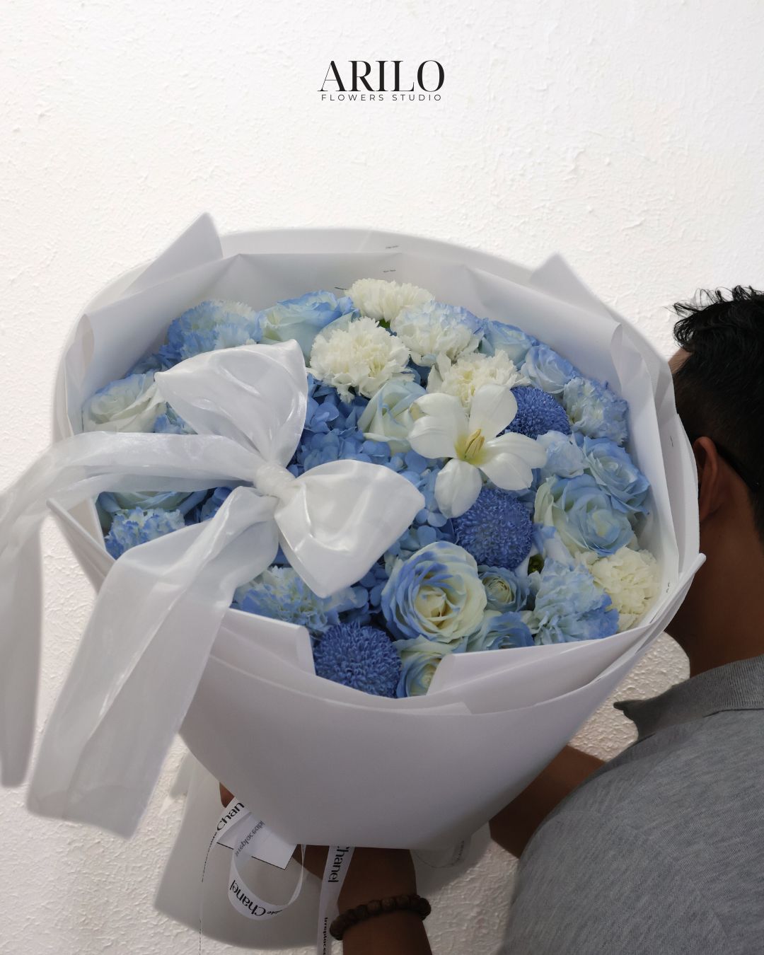 Gam màu xanh trắng tượng trưng cho sự bình yên, tin tưởng và tình cảm chân thành. Bó hoa được hoàn thiện với tông giấy trắng trang nhã, điểm nhấn là chiếc nơ voan lớn giúp tổng thể trở nên mềm mại và cuốn hút hơn. Mỗi bông hoa đều được chọn lọc kỹ càng để đảm bảo độ tươi và form dáng đẹp khi đến tay người nhận.