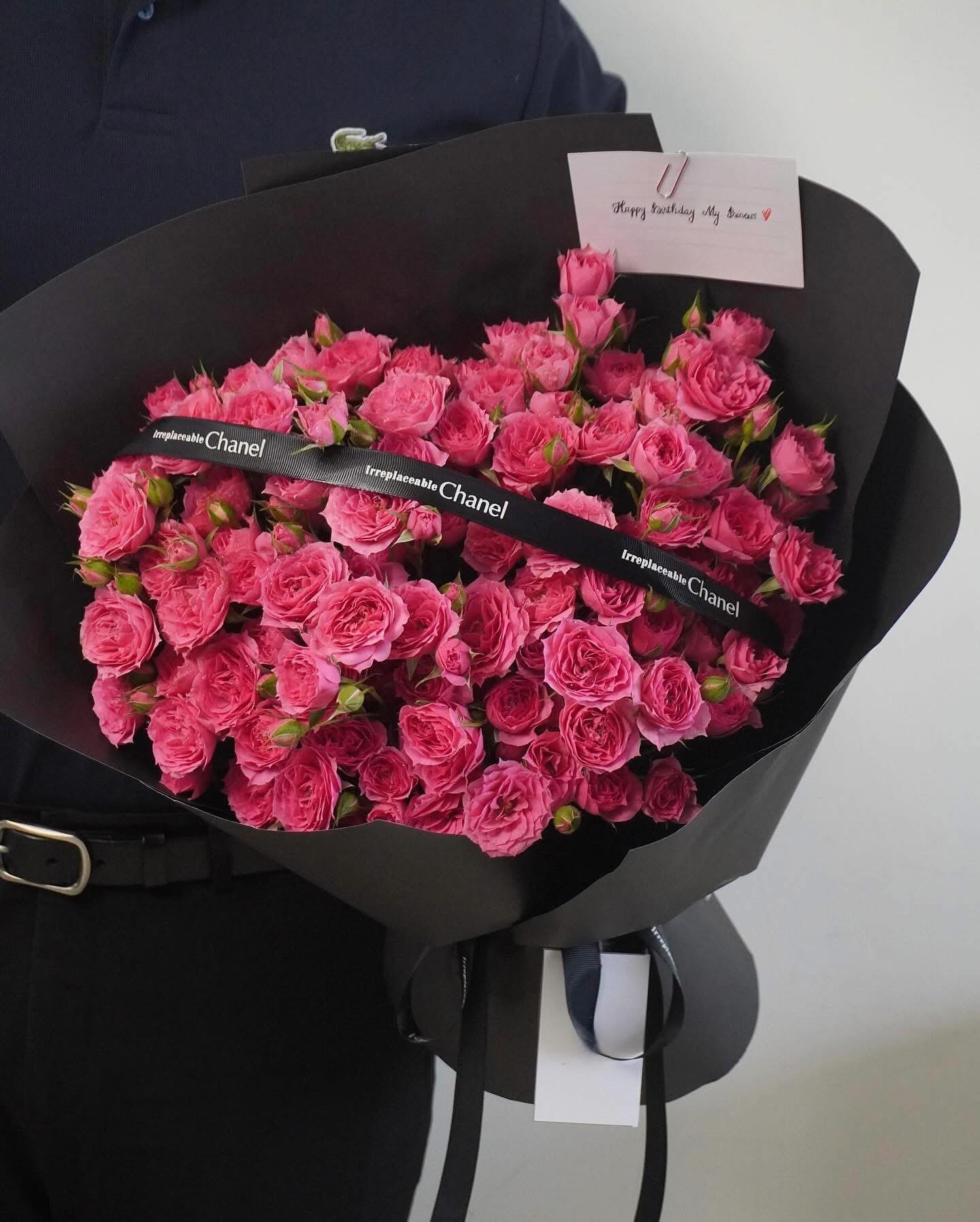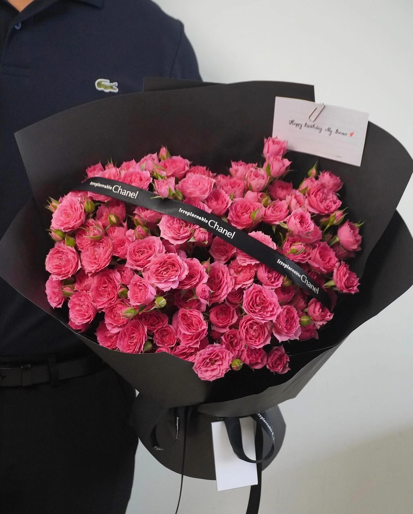 Bức ảnh ghi lại một bó hoa mang vẻ đẹp nổi bật và đầy cảm xúc, với tone hồng đậm quyến rũ làm chủ đạo. Thành phần chính là hoa hồng chùm Sofia – những bông hồng nhỏ xinh, cánh dày, nở đều và rực rỡ, tượng trưng cho tình yêu nồng nhiệt, sự quan tâm bền bỉ và lời trân trọng chân thành. Các nụ hồng xanh non đan xen tạo chiều sâu tự nhiên, giúp bó hoa trông sống động và có nhịp điệu mềm mại. Phần gói được thiết kế theo kiểu tròn hiện đại, sử dụng giấy đen nhám cao cấp kết hợp nơ đen tinh tế, làm nổi bật sắc hồng và mang lại cảm giác sang trọng, mạnh mẽ nhưng vẫn rất lãng mạn.