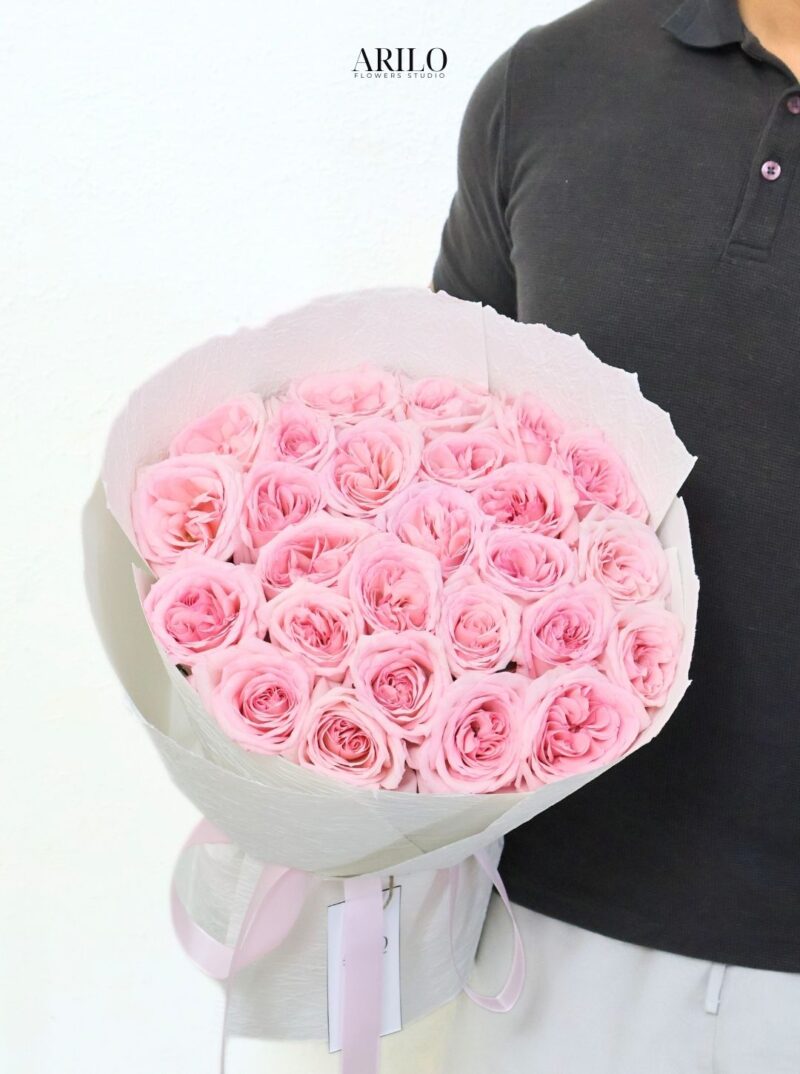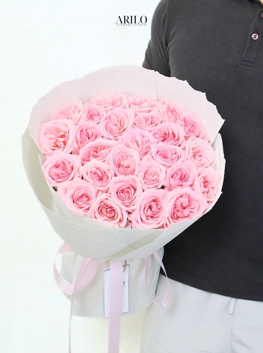 Những bông hoa hồng Ohara được tuyển chọn với form tròn lớn, cánh dày, xếp lớp mềm mại như từng nhịp cảm xúc. Sắc hồng phấn trong trẻo kết hợp cùng lớp giấy trắng tối giản và ruy băng hồng nhạt tạo nên tổng thể hài hòa, sang trọng mà không phô trương.