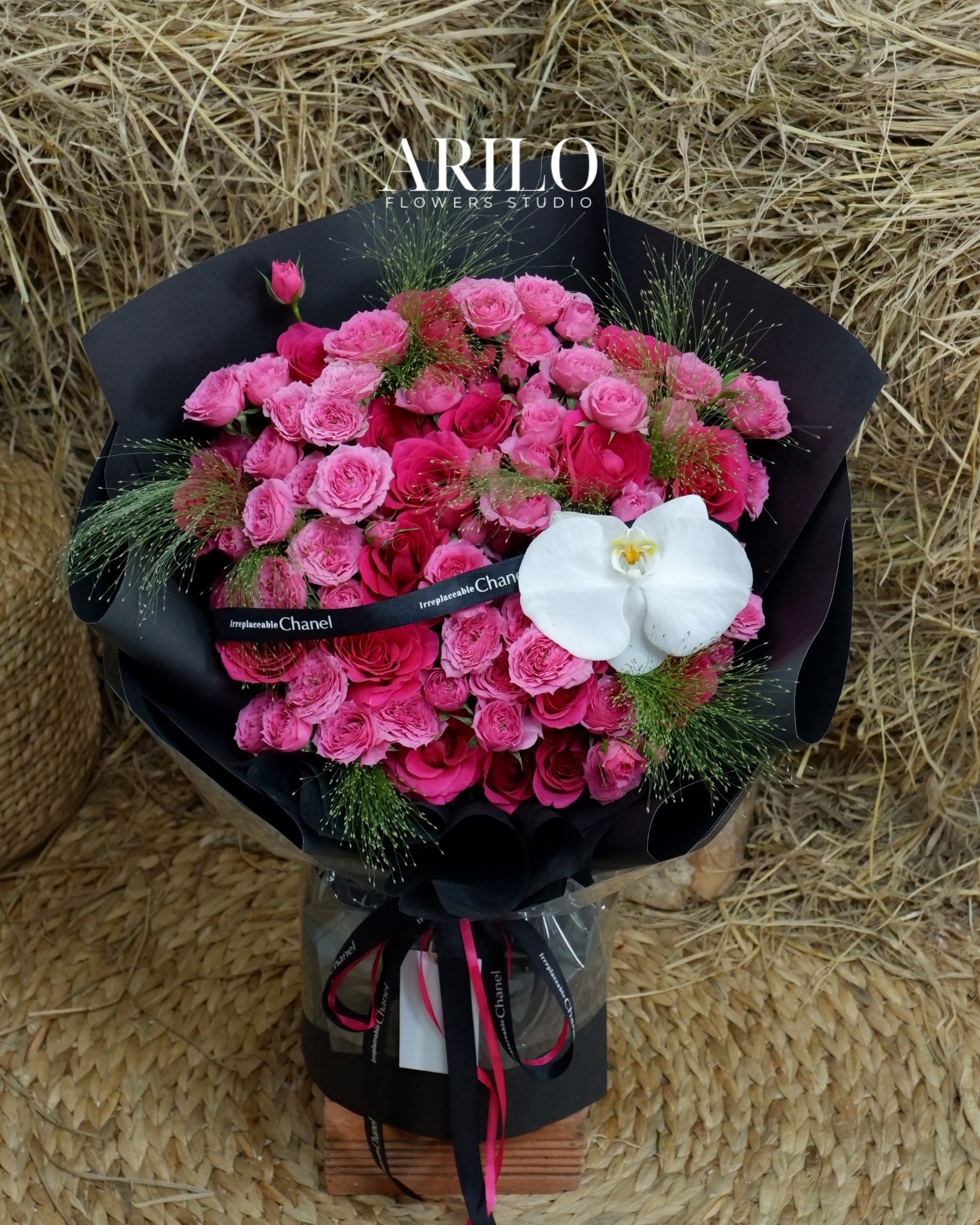 Bó hoa trong ảnh là sự kết hợp đầy cảm xúc giữa sắc hồng nồng nàn và điểm nhấn trắng tinh khôi, mang đến ấn tượng vừa sang trọng vừa lãng mạn. Trung tâm bó hoa là hoa hồng pinkloy cao cấp xen kẽ hoa hồng chùm sofia nhỏ xinh, những cánh hoa xếp lớp mềm mại như lời thì thầm của yêu thương. Nổi bật trên nền hồng rực rỡ là hoa lan hồ điệp trắng, biểu tượng của sự tinh khiết, trân trọng và lời hứa bền lâu. Bó hoa được điểm thêm hoa lá phụ trang trí và cỏ mềm, giúp tổng thể trở nên hài hòa, có chiều sâu và giàu sức sống.