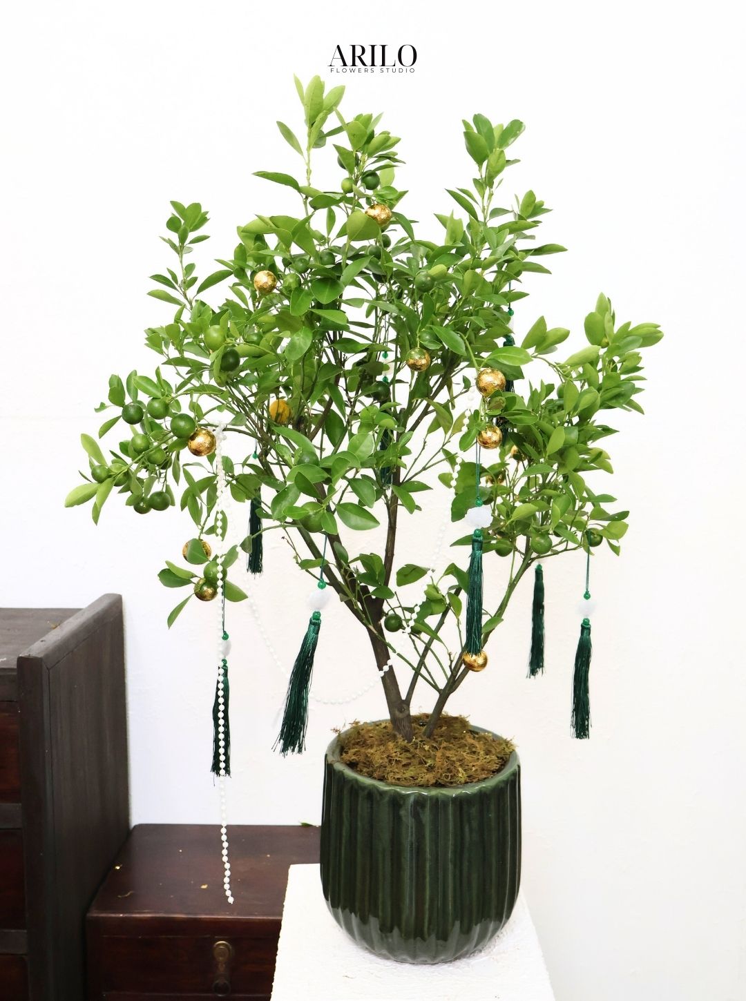 Mẫu cây hạnh decor ngày Tết trong hình gây ấn tượng với tán lá xanh tươi, dáng cây cân đối và quả tròn tượng trưng cho sự sung túc, đủ đầy. Cây được trang trí thêm phụ kiện Tết màu xanh – vàng nhã nhặn, tạo điểm nhấn tinh tế nhưng vẫn giữ nét thanh lịch, phù hợp với nhiều không gian trưng bày. Đây là lựa chọn được nhiều khách hàng yêu thích tại Shop hoa tươi sài gòn – Arilo Flower Studio trong dịp đầu năm.