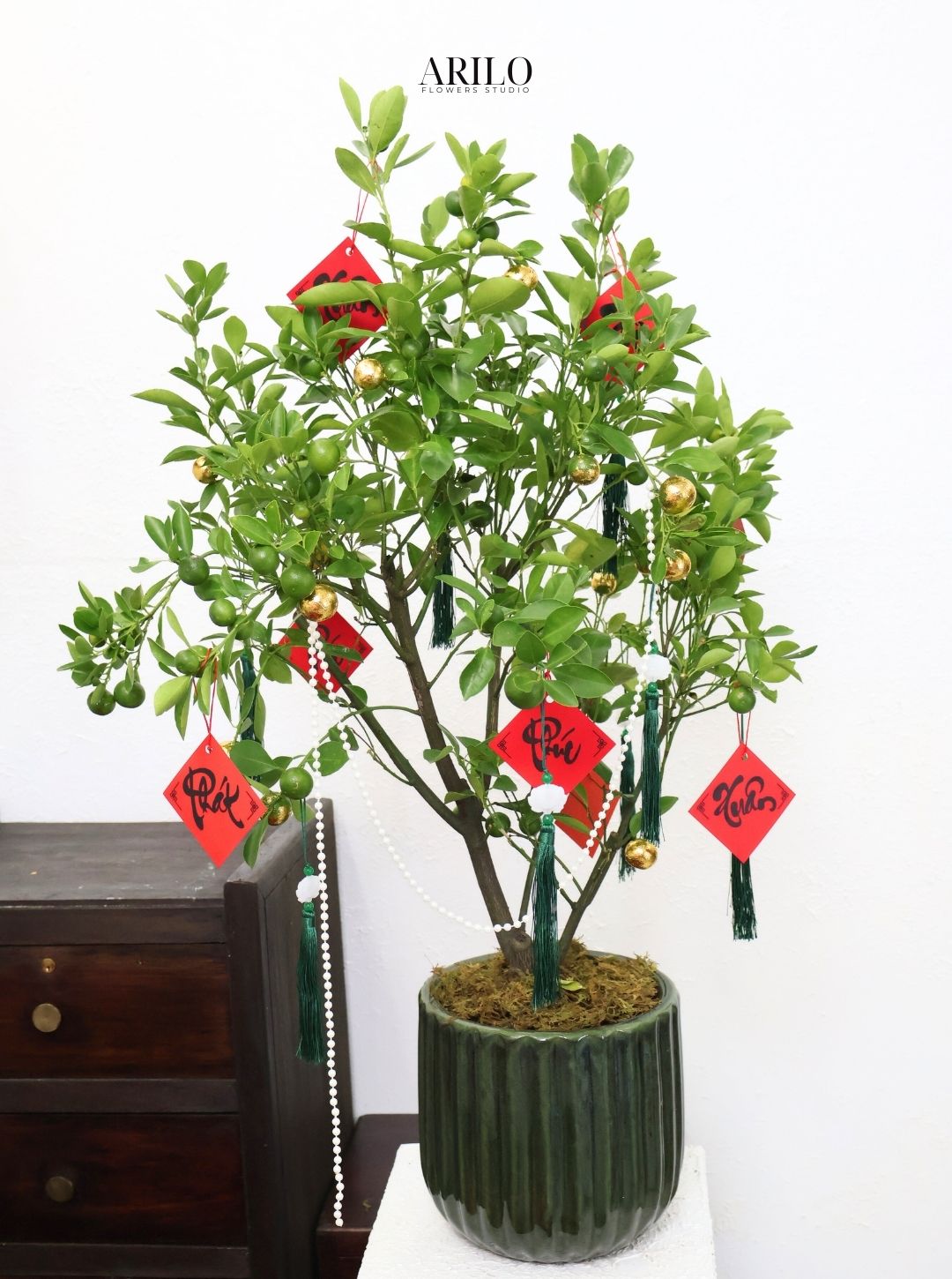 Cây hạnh trong hình là lựa chọn decor tinh tế cho không gian ngày xuân, mang sắc xanh tươi mát và ý nghĩa phong thủy tốt lành. Với tán lá cân đối, quả xanh tròn đầy, cây được trang trí cùng thẻ chúc đỏ và phụ kiện Tết nhã nhặn, tạo điểm nhấn sang trọng nhưng không phô trương. Đây là mẫu cây hạnh decor ngày Tết được nhiều khách hàng yêu thích tại Shop hoa tươi sài gòn – Arilo Flower Studio.