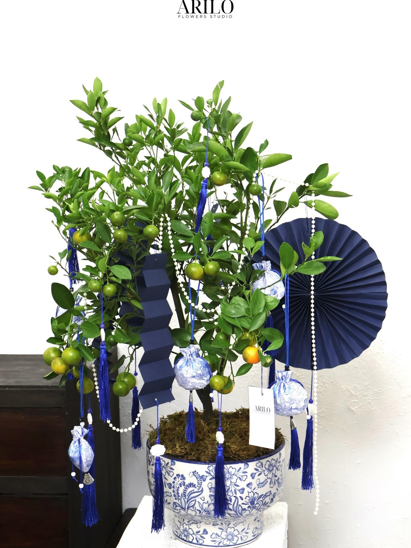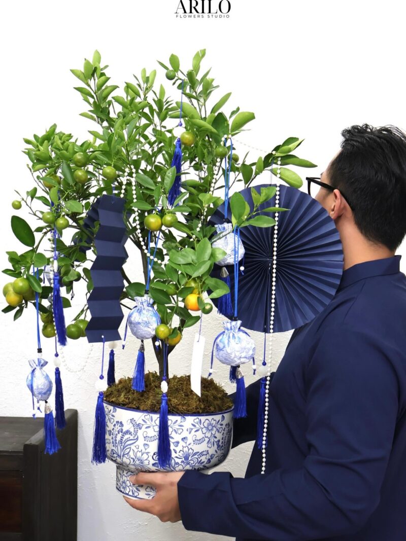 Thiết kế sử dụng các loài cây gồm: cây hạnh (quất), rêu tự nhiên phủ gốc, kết hợp chậu sứ hoa văn xanh trắng phong cách cổ điển, giúp tổng thể thêm sang trọng và bền dáng suốt mùa Tết. Đây là lựa chọn lý tưởng để cây hạnh trưng Tết tại phòng khách, sảnh công ty, cửa hàng hoặc làm quà biếu đầu năm cho đối tác, người thân.