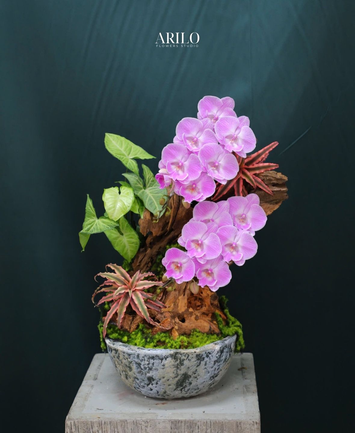 Bức ảnh là một tác phẩm hoa lan thiết kế mang phong cách nghệ thuật hiện đại, nổi bật với hoa lan hồ điệp hồng xếp cụm mềm mại trên nền gỗ lũa tự nhiên uốn lượn. Những cánh lan tròn đầy, sắc hồng tím dịu nhẹ kết hợp nhụy vàng tinh tế tạo cảm giác vừa sang trọng vừa ấm áp. Bố cục được điểm xuyết thêm cây môn lá xanh (Syngonium), cây huyết dụ mini, rêu trang trí và lớp sen đá tiểu cảnh, mang đến sự cân bằng giữa hoa – lá – chất liệu tự nhiên. Tất cả được đặt trong chậu đá vân xám chắc chắn, giúp tổng thể hài hòa, bền dáng và có chiều sâu thị giác.