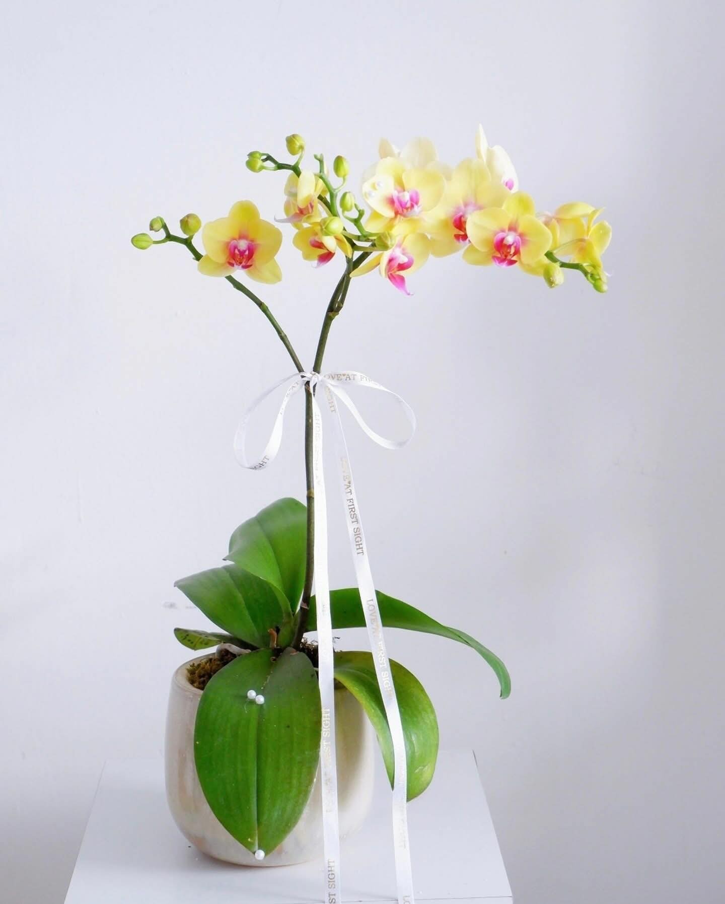 Bức ảnh ghi lại một mẫu hoa lan thiết kế tối giản nhưng đầy cuốn hút, nổi bật với hoa lan hồ điệp vàng điểm nhụy hồng dịu, cánh hoa dày mịn và dáng cong mềm mại. Hai cần lan vươn cao, nụ xen kẽ nở đều tạo cảm giác sinh động và cân đối. Phần gốc được trồng trong chậu gốm màu trung tính, kết hợp lá lan xanh bản lớn, giá thể tự nhiên và ruy băng trắng buộc nhẹ nhàng, tôn lên vẻ thanh lịch, hiện đại. Tổng thể mang tinh thần tinh giản, phù hợp nhiều không gian từ văn phòng đến phòng khách.
