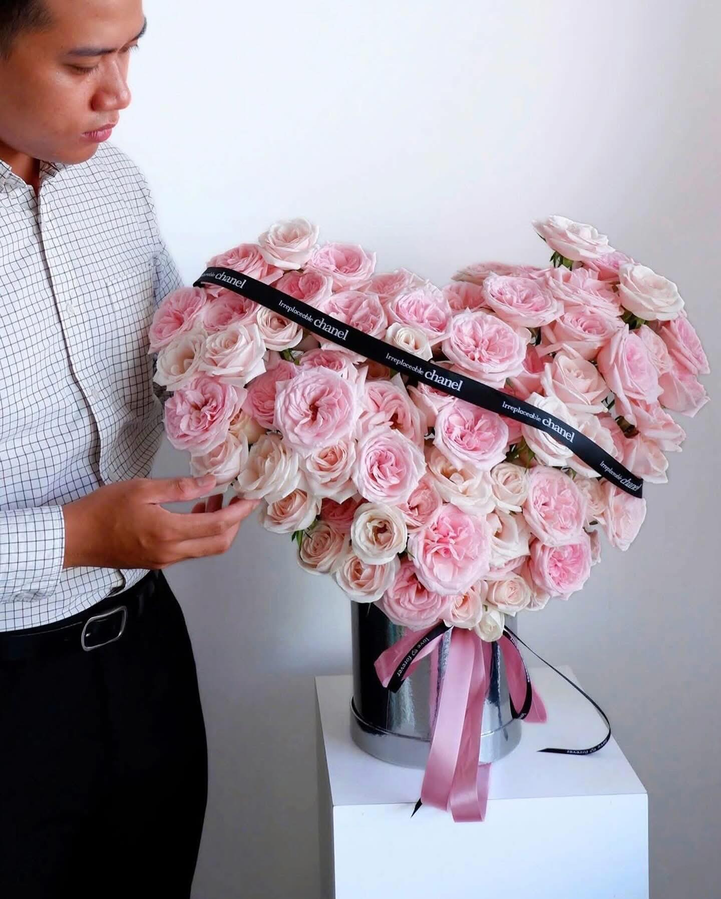 Dưới bàn tay khéo léo của nghệ nhân Arilo, bó hoa không chỉ là sự kết hợp của những đóa hoa mà là một tác phẩm nghệ thuật. Chúng tôi sử dụng giấy gói Hàn Quốc cao cấp (như giấy mờ, giấy lụa) với tông màu trang nhã (ví dụ: kem, xám khói, đen tuyền) làm nổi bật vẻ đẹp kiêu sa của hoa hồng. Điểm nhấn là chiếc nơ lụa mềm mại được thắt thủ công, tạo nên một tổng thể sang trọng và hiện đại.