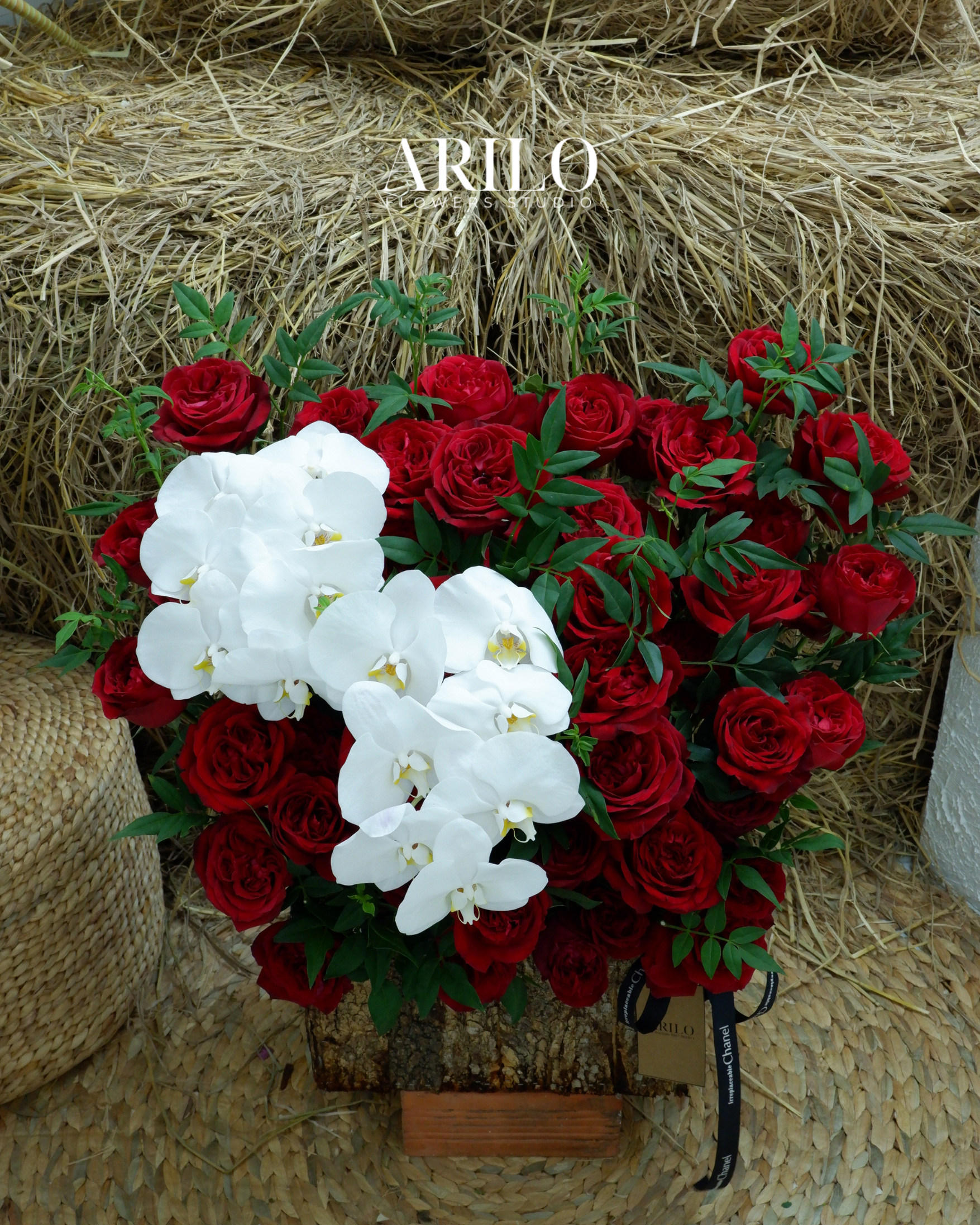 Dưới bàn tay khéo léo của nghệ nhân Arilo, bó hoa không chỉ là sự kết hợp của những đóa hoa mà là một tác phẩm nghệ thuật. Chúng tôi sử dụng giấy gói Hàn Quốc cao cấp (như giấy mờ, giấy lụa) với tông màu trang nhã (ví dụ: kem, xám khói, đen tuyền) làm nổi bật vẻ đẹp kiêu sa của hoa hồng. Điểm nhấn là chiếc nơ lụa mềm mại được thắt thủ công, tạo nên một tổng thể sang trọng và hiện đại.